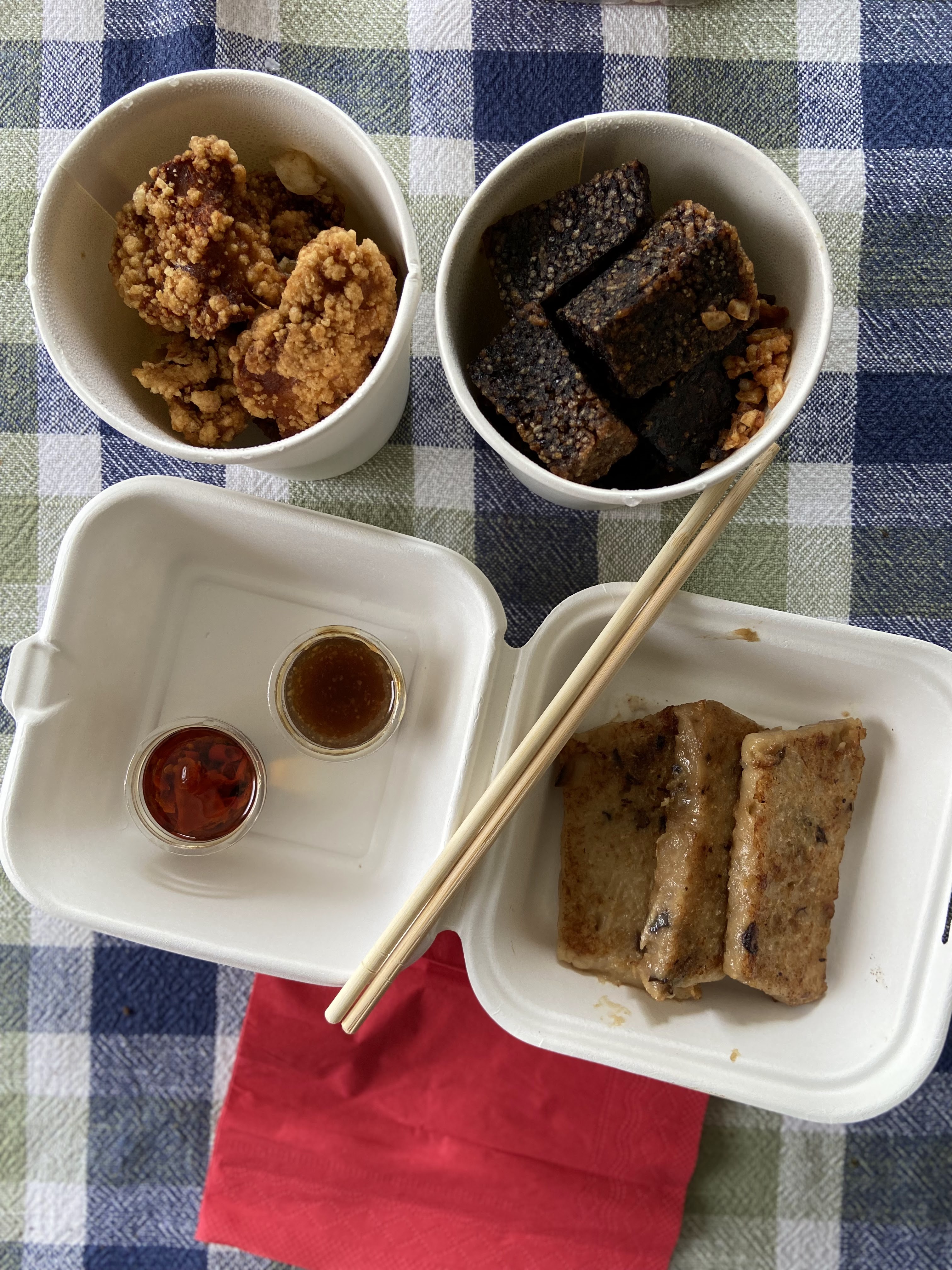 Le poulet frit est bon ainsi que le gâteau de riz au sang de porc. Mention spéciale aux crêpes aux œufs ! Un peu déçu des nouilles au bœufs aux oignons mais cela reste une belle découverte de la cuisine taïwanaise !