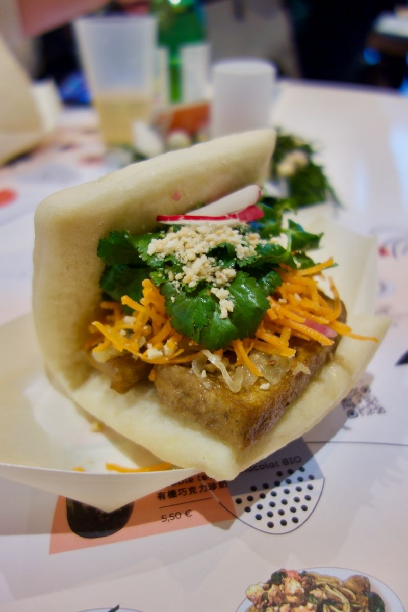 Cher pour ce que c’est. Une petite déception au début mais finalement très bien rattrapée : les baos sont tout petits, ça ne fait pas du tout un repas complet mais plutôt un encas (donc 6€ l’encas c’est un peu cher). j’ai pris un bao végétarien au tofu et on me sert un bao avec uniquement des champignons et pas de tofu donc je l’ai dit et la cuisinière m’a offert un deuxième bao vraiment au tofu cette fois et a offert en plus leur spécialité de concombre mariné très bon.