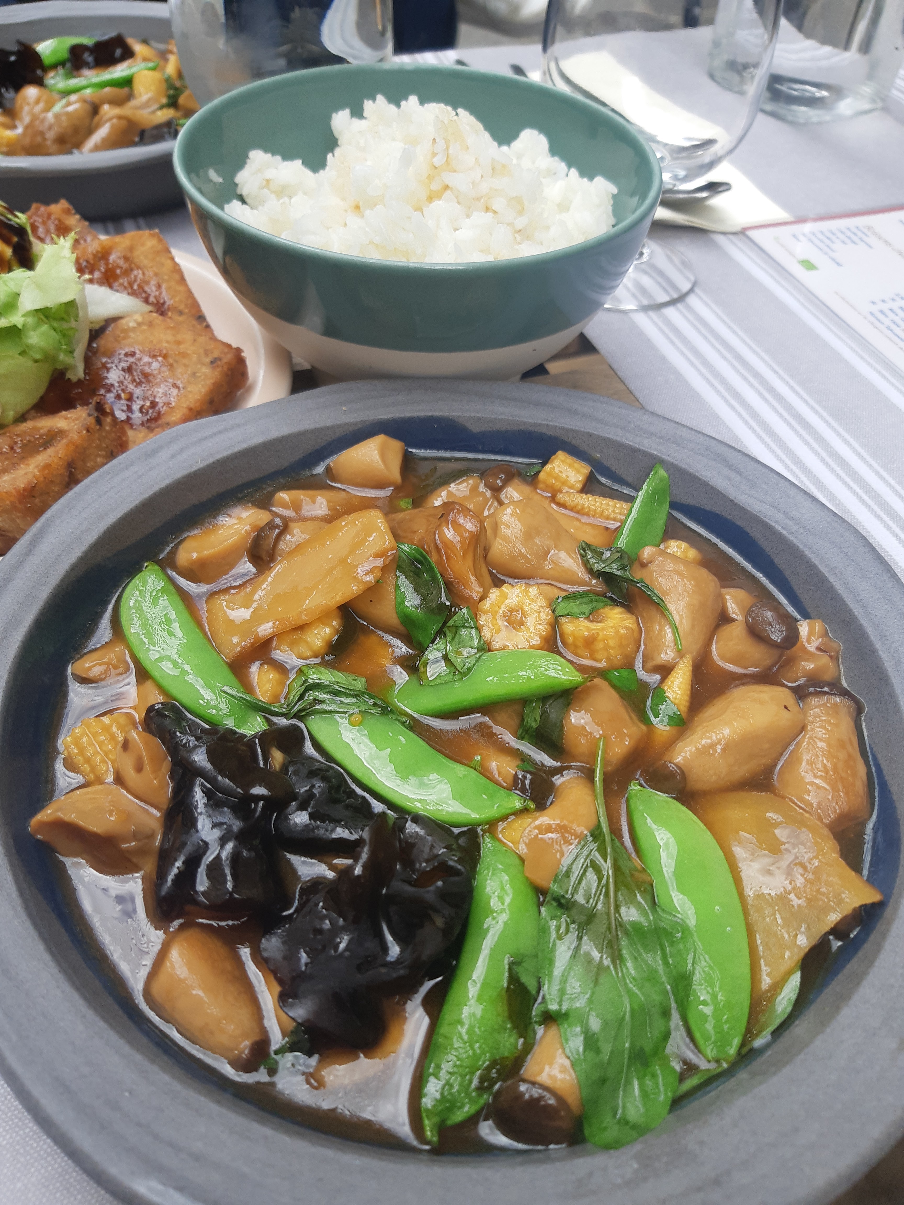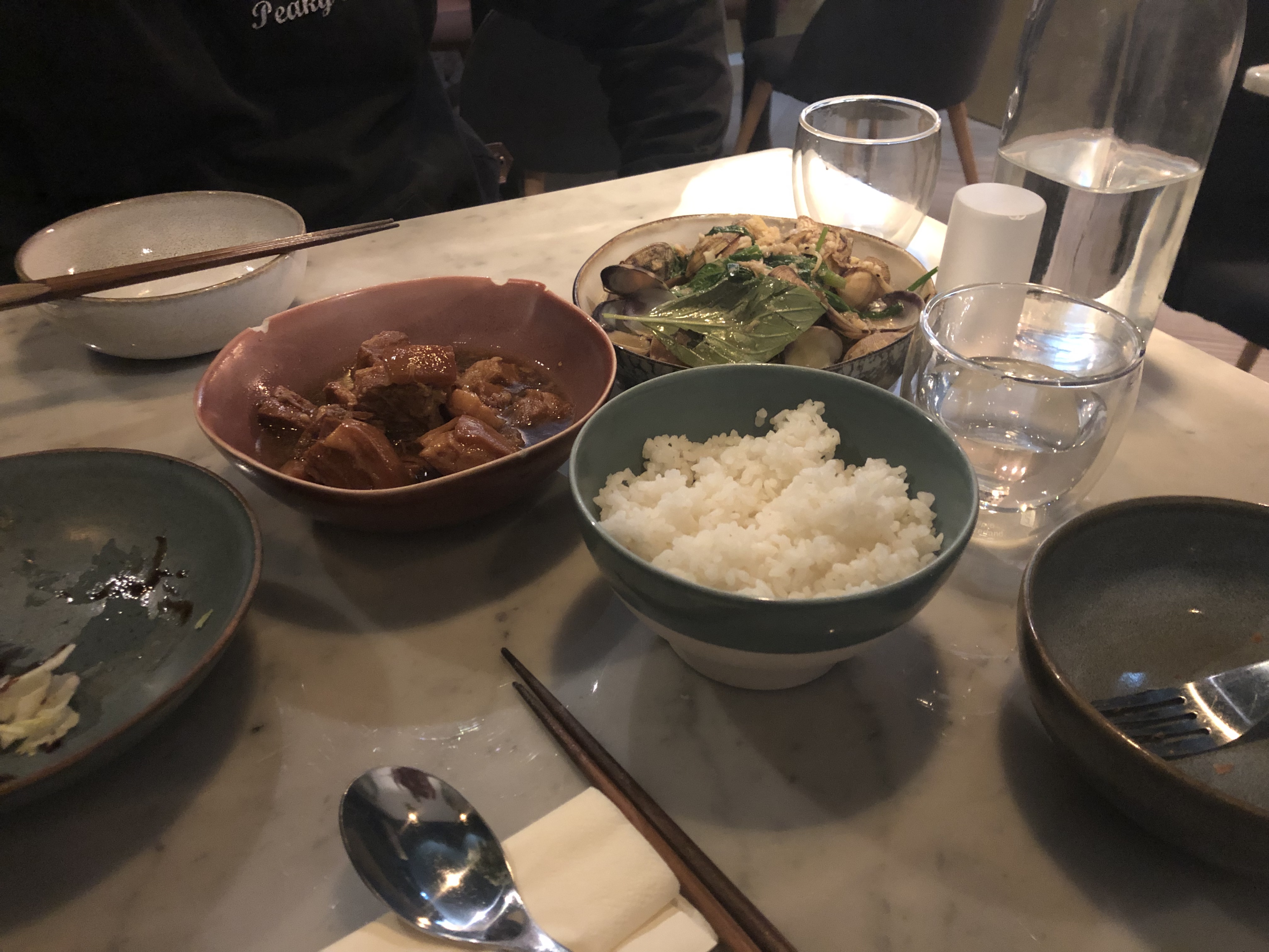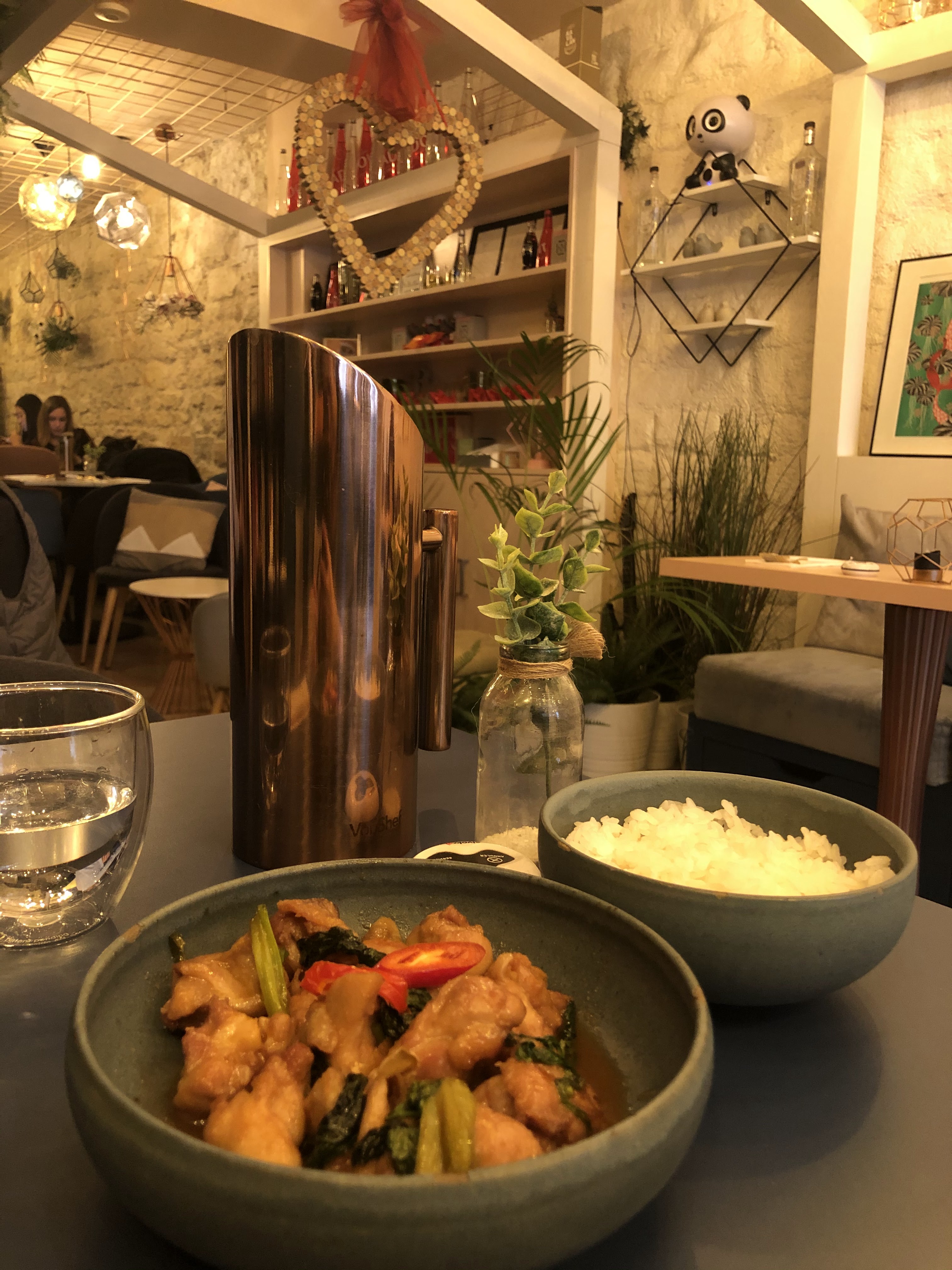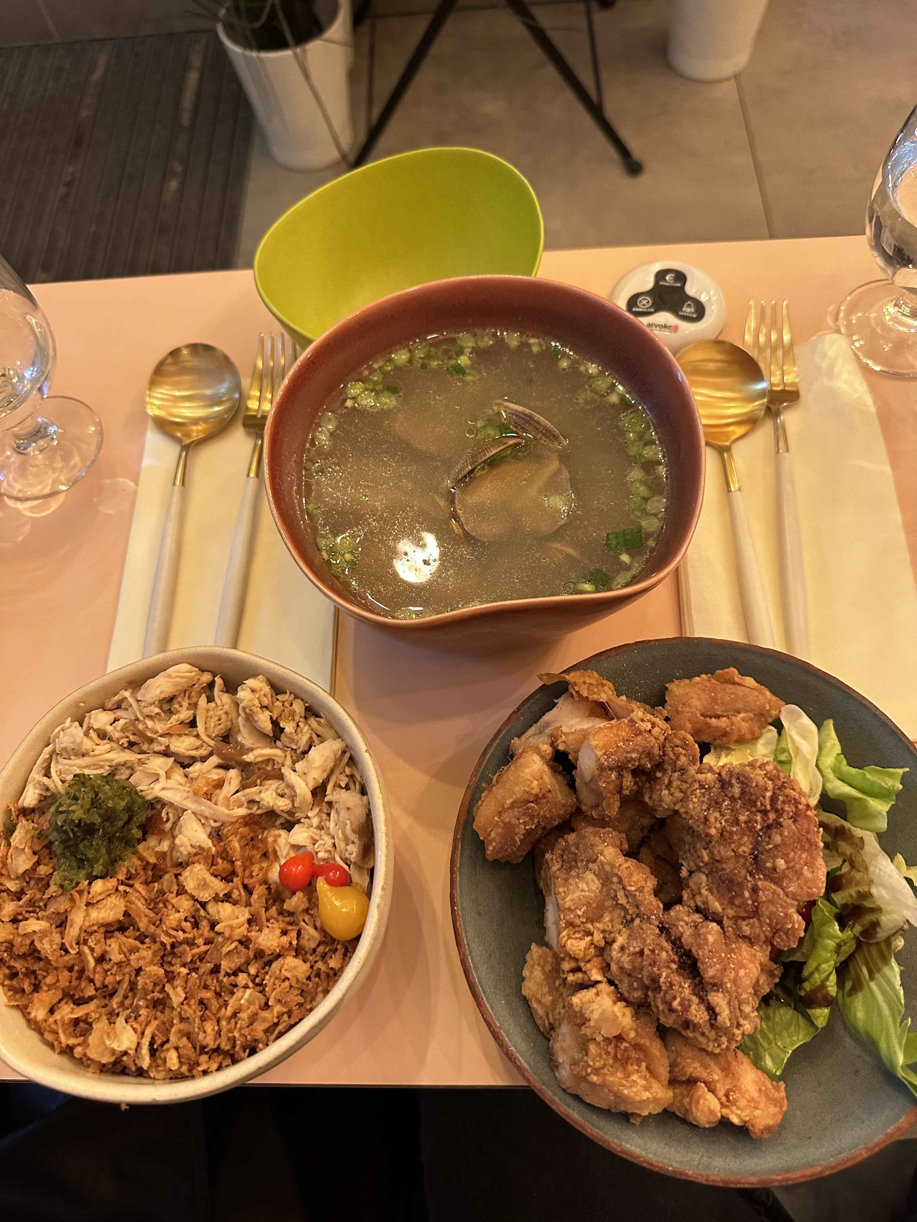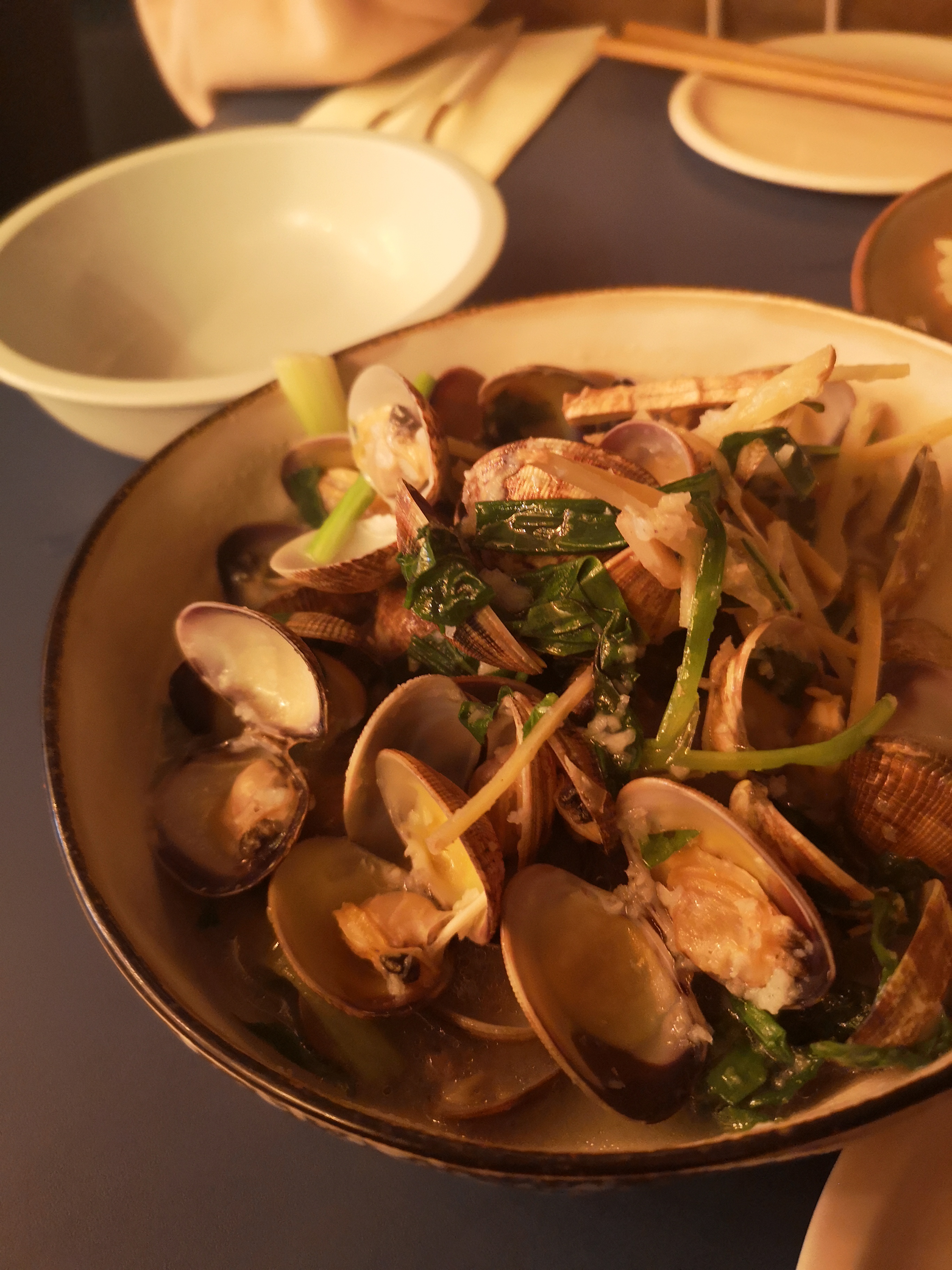 Le décor était sympathique et très agréable. Les serveurs sont très polis et attentionnés et enfin le temps d'attente était raisonnable. Malheureusement les quantités sont largement insuffisantes pour les plats à partager. Pourtant le serveur nous avait certifié qu'il y en aurait assez pour trois. Les crevettes et les palourdes étaient excellentes mais nous aurions apprécié que le riz soit offert en accompagnement. D'ailleurs le prix de la coupelle (3€) me semble un peu cher au vu de la quantité servie.