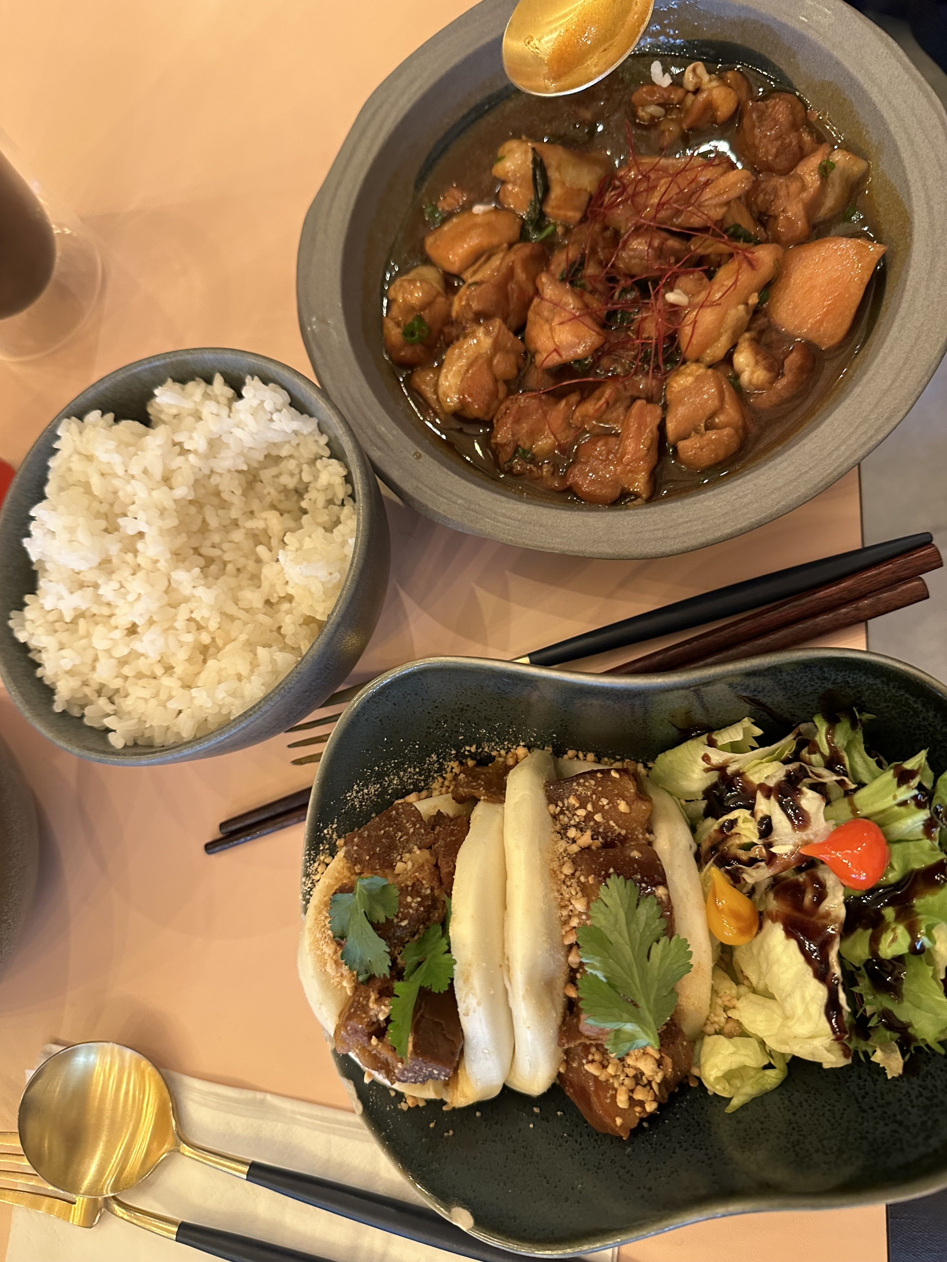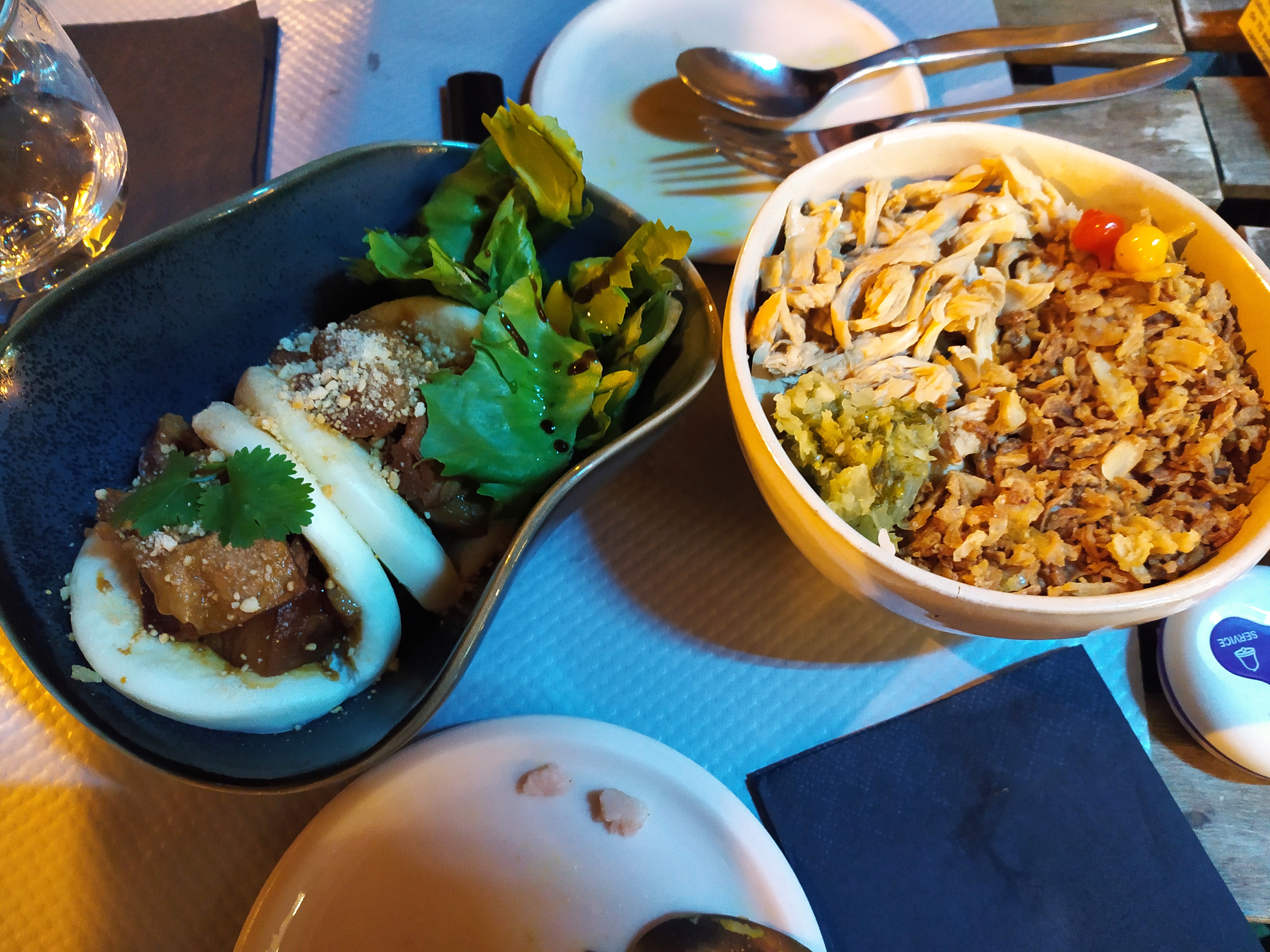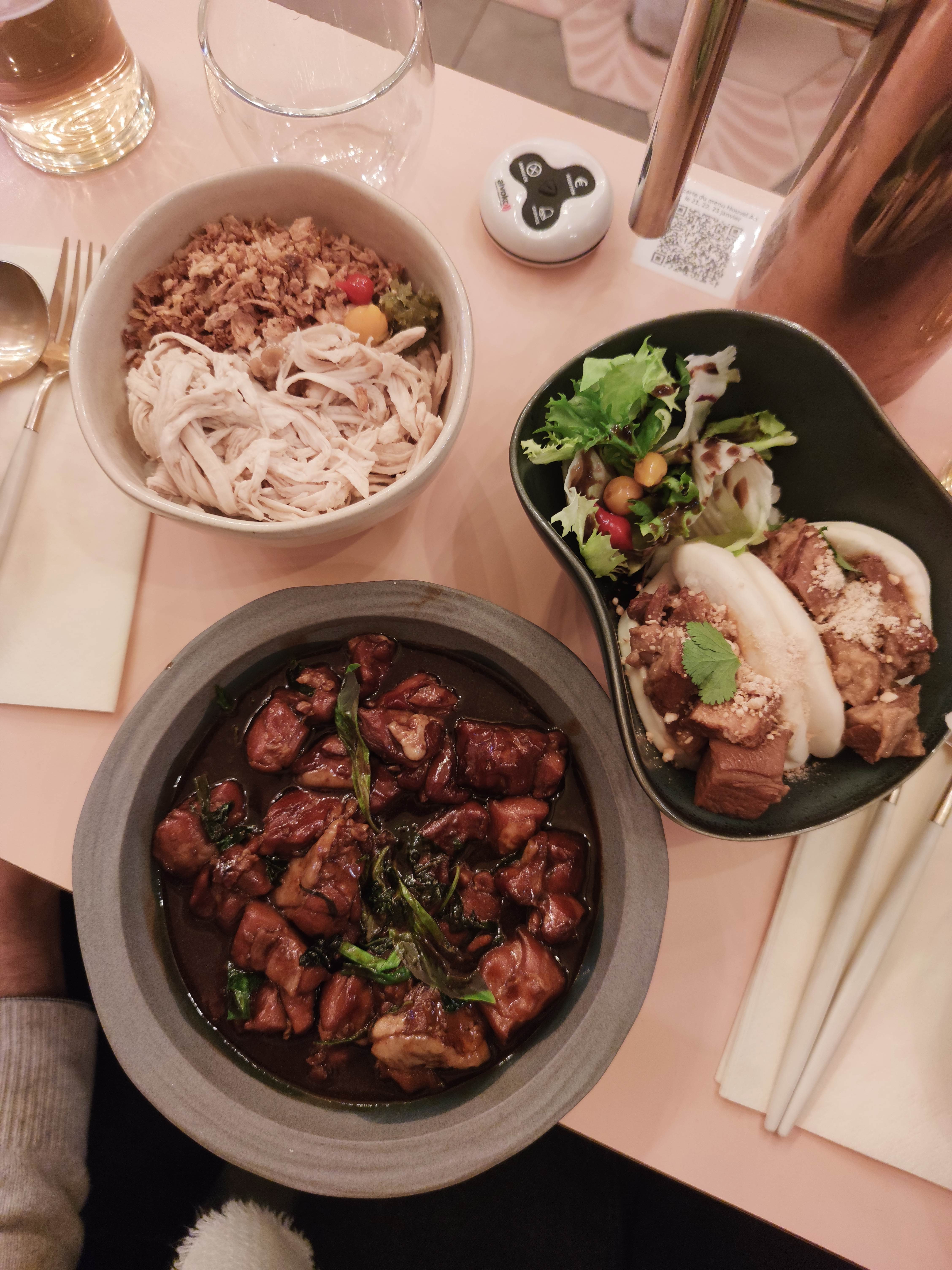 Nous avions réservé une table pour deux. Nous avons été placés tout au fond de la salle. Cet endroit n'est pas joli: peinture mal faite, fils qui pendouillent. Quand des clients réservent, la moindre des choses et de leur offrir une jolie table. Nous avons pris deux plats, à 19€ chaque et deux verres de vin. Les quantités sont absolument ridicules. Le poulet spécial et le Gua Bao sont censés être accompagnés d'une salade: oui, certes, une petite poignée d'iceberg pas travaillée, insignifiante et pas goûteuse pour un sou, décorative au mieux. La viande était bonne, la brioche aussi. Mais ça ne vaut absolument pas le prix ! Les prix sont choquants. (4€ un petit bol de riz nature ? Mais vous déconnez ?) Les assiettes étaient toutes ébréchées. Nous sommes tombés des nues. Comment pouvez-vous décemment envoyer des assiettes ébréchées ? Ce n'est pas respectueux pour le client. La carafe d'eau est arrivée alors que nous avions fini de manger. (En même temps, en 10mn chrono c'est fini.) En prime, celle-ci n'était pas propre. (Traces de calcaire et poignée branlante.) Nous sommes partis 40mn après être arrivés. Nous étions mal à l'aise par l'ambiance et le peu de considération accordée, nous avions faim et le service n'était pas accueillant. En somme, un accueil pas chaleureux, des plats extrêmement chers pour la quantité dérisoire, une salle cheap, des assiettes ébréchées... On a fini par manger ailleurs. Quelle déception. Ça a gâché notre samedi soir. Ne perdez pas votre argent là-bas, il existe tellement mieux.