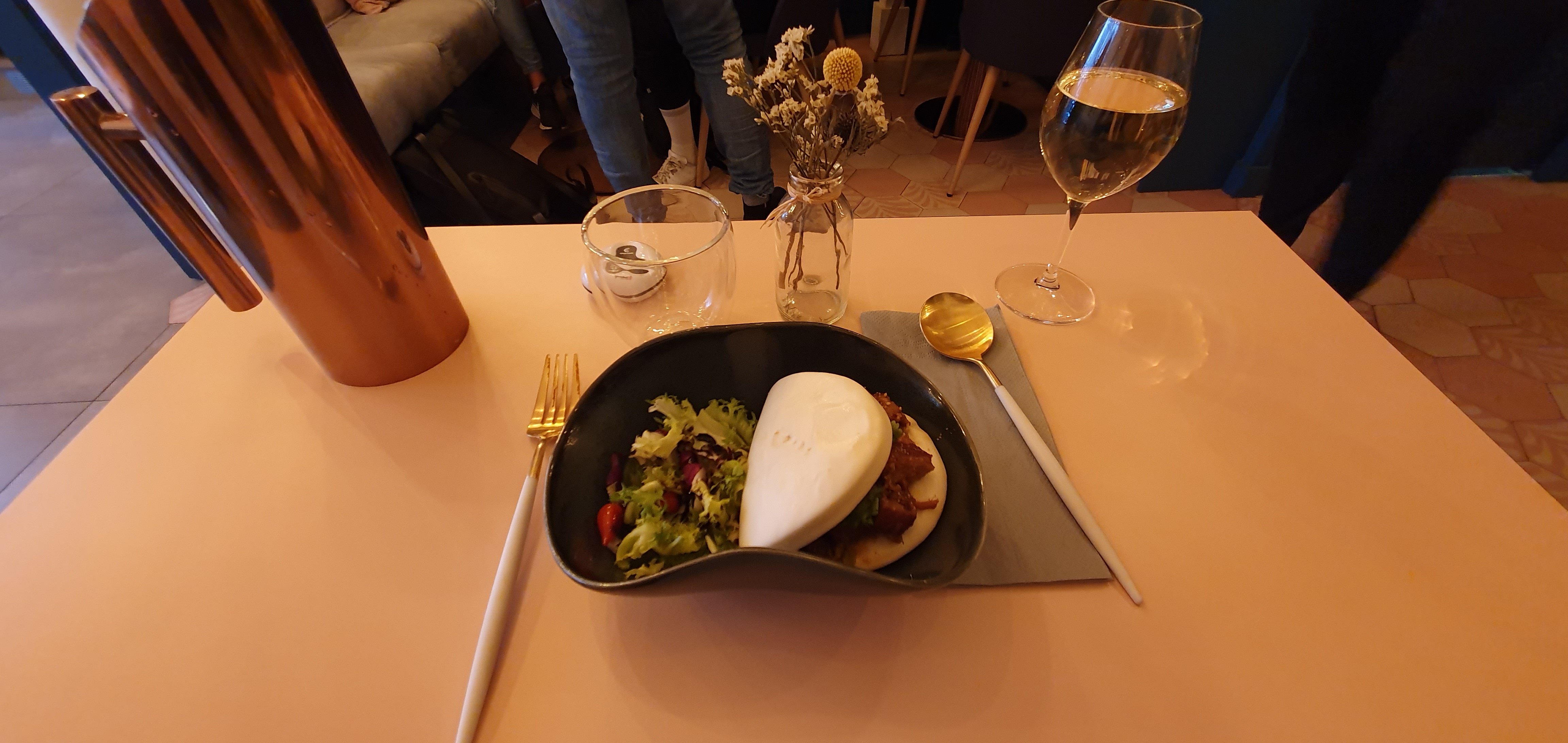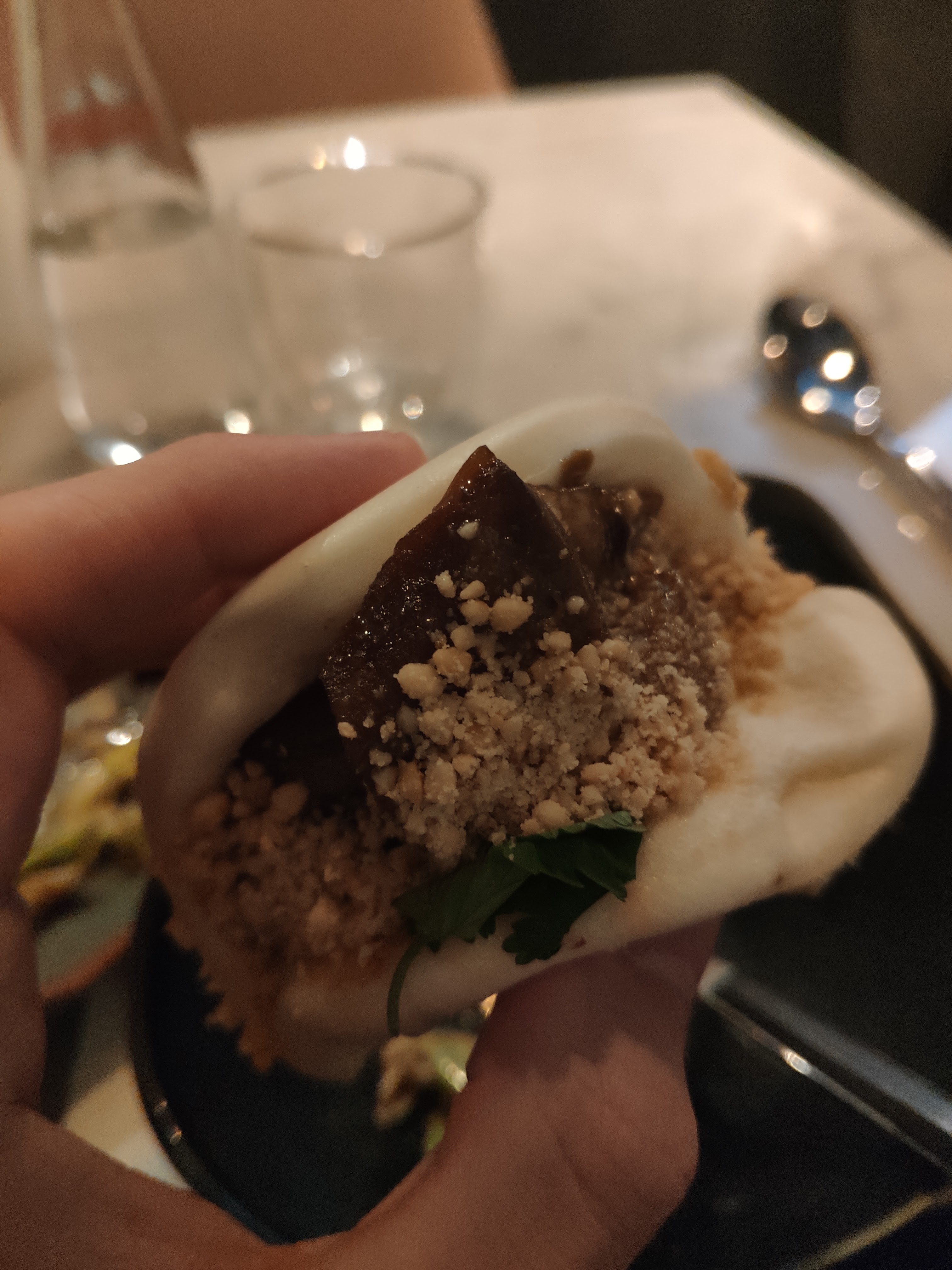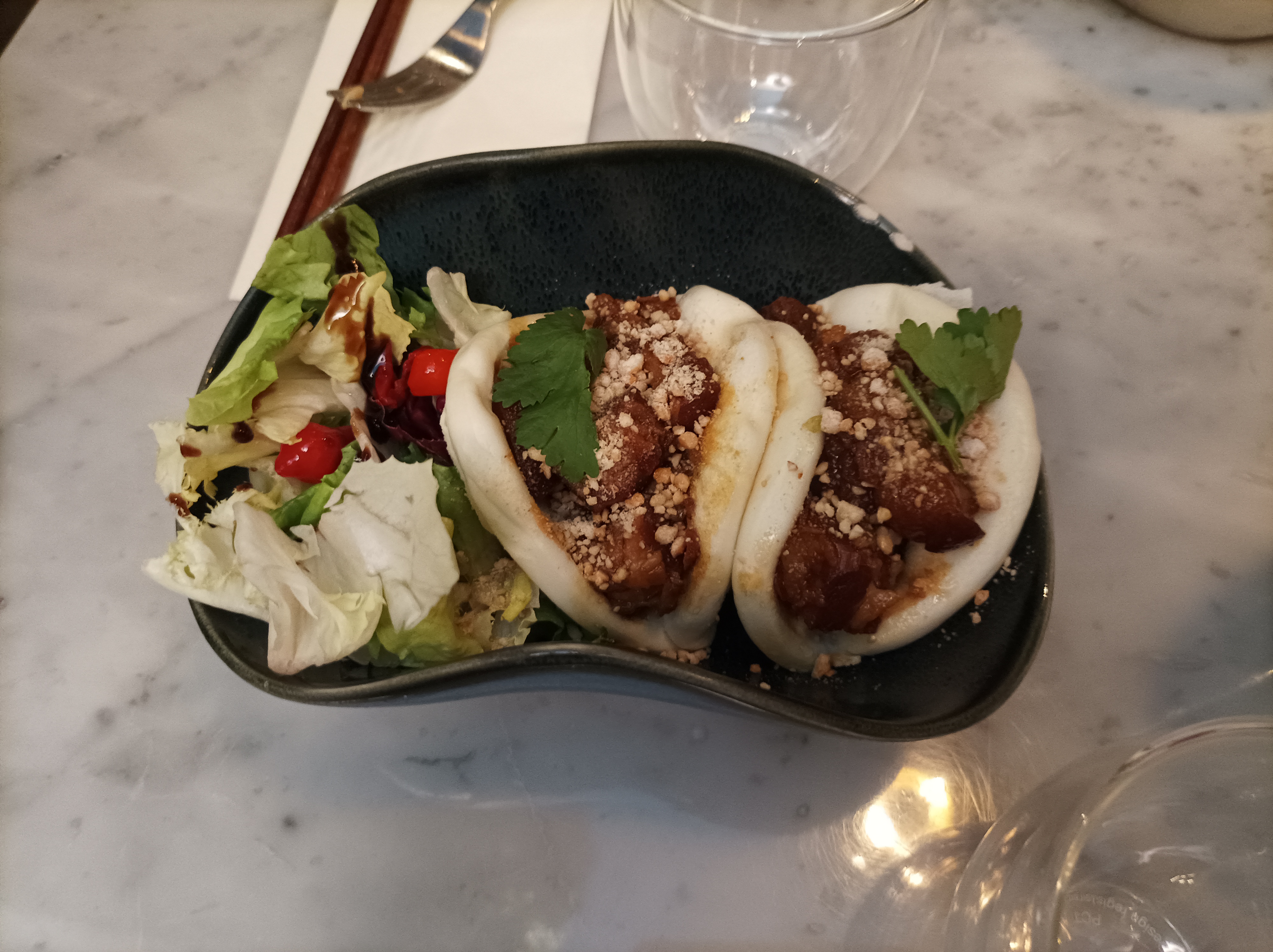 Nous avions réservé une table pour deux. Nous avons été placés tout au fond de la salle. Cet endroit n'est pas joli: peinture mal faite, fils qui pendouillent. Quand des clients réservent, la moindre des choses et de leur offrir une jolie table. Nous avons pris deux plats, à 19€ chaque et deux verres de vin. Les quantités sont absolument ridicules. Le poulet spécial et le Gua Bao sont censés être accompagnés d'une salade: oui, certes, une petite poignée d'iceberg pas travaillée, insignifiante et pas goûteuse pour un sou, décorative au mieux. La viande était bonne, la brioche aussi. Mais ça ne vaut absolument pas le prix ! Les prix sont choquants. (4€ un petit bol de riz nature ? Mais vous déconnez ?) Les assiettes étaient toutes ébréchées. Nous sommes tombés des nues. Comment pouvez-vous décemment envoyer des assiettes ébréchées ? Ce n'est pas respectueux pour le client. La carafe d'eau est arrivée alors que nous avions fini de manger. (En même temps, en 10mn chrono c'est fini.) En prime, celle-ci n'était pas propre. (Traces de calcaire et poignée branlante.) Nous sommes partis 40mn après être arrivés. Nous étions mal à l'aise par l'ambiance et le peu de considération accordée, nous avions faim et le service n'était pas accueillant. En somme, un accueil pas chaleureux, des plats extrêmement chers pour la quantité dérisoire, une salle cheap, des assiettes ébréchées... On a fini par manger ailleurs. Quelle déception. Ça a gâché notre samedi soir. Ne perdez pas votre argent là-bas, il existe tellement mieux.