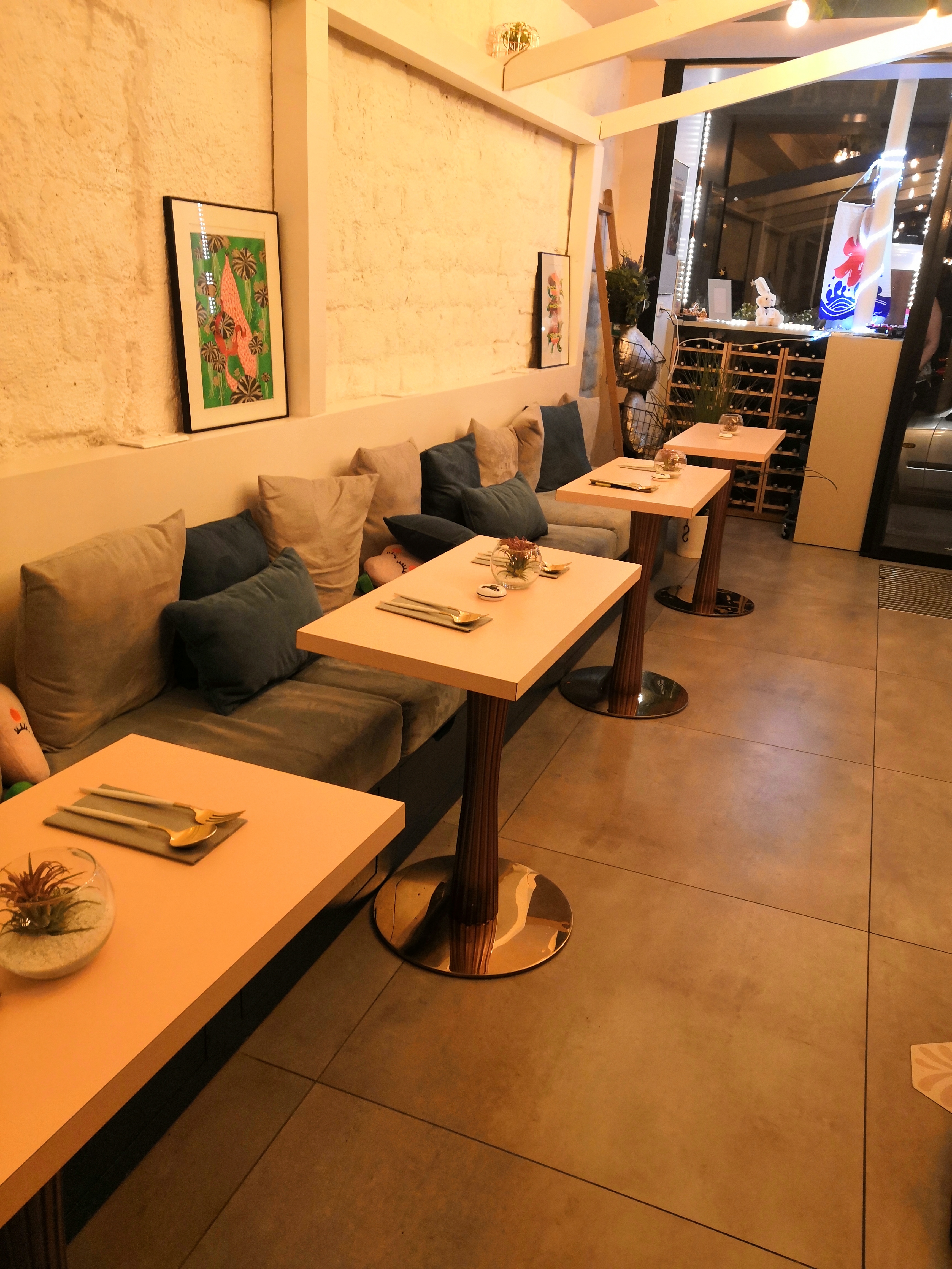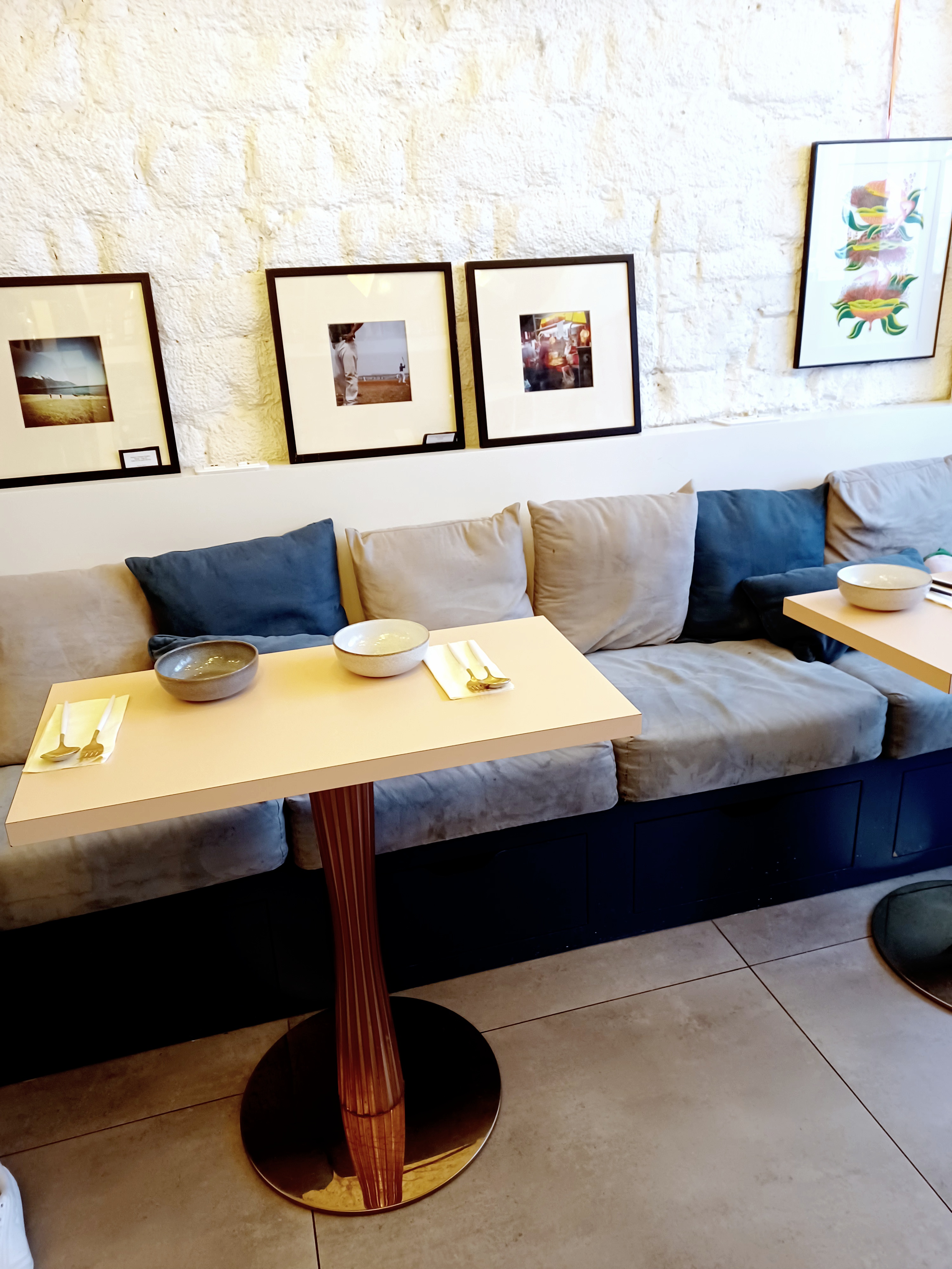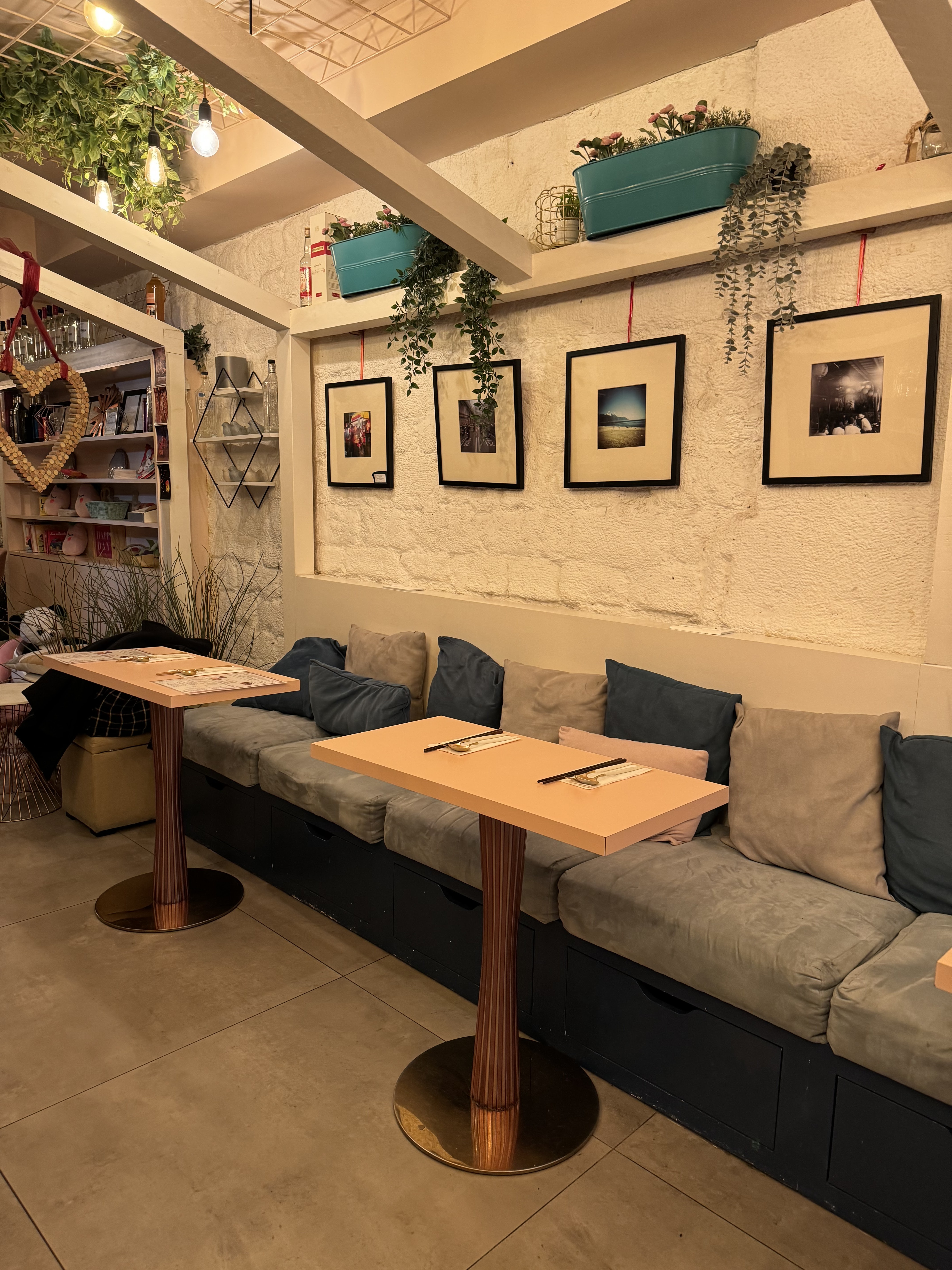 Délicieuses assiettes dégustées dans une ambiance apaisante et chaleureuse. La décoration est à l'image des assiettes, belle et sans chichi, mais colorée et personnalisée. Je recommande vivement cette adresse pour se régaler à l'abris du brouhaha du quartier, dans une atmosphère agréable portée par une équipe de serveurs aux petits soins