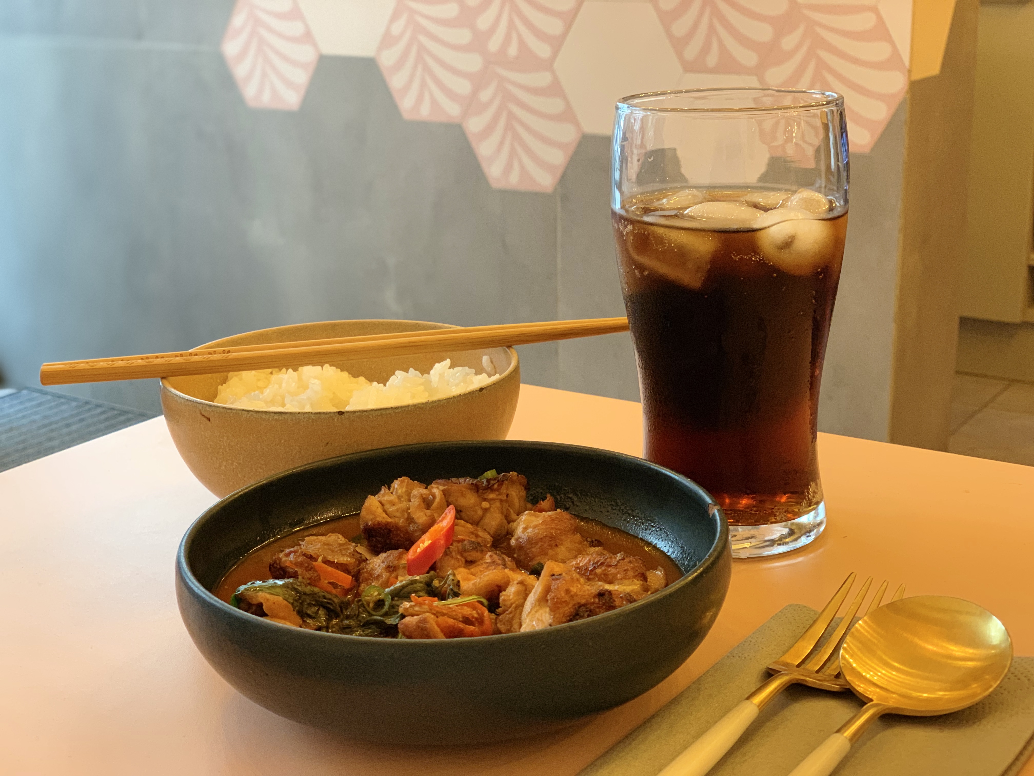 En me promenant à Paris, la pluie a encore une fois fait sa présence. Ayant un peu envie d’être dans un endroit chaud, sympa et avec des plats faits maison - je l’ai trouvé. J’ai commandé cette fois le poulet au basilic et au gingembre avec du riz blanc parfumé. Si vous avez faim, il faudra commander quelque chose de plus car ce n’est pas très généreux. Par contre, au niveau de goût, c’est plutôt réussi. On m’a dit une fois qu’il était possible de juger un restau asiatique en fonction de la qualité de son riz et je peux bien affirmer qu’il est plutôt ok. Comme dessert, j’ai pris le Hei Tang gau. Comme un bon dessert asiatique: ce n’est pas très sucré. Il est un peu sec à mon goût mais ça va. Par contre, la crème est vraiment bonne.