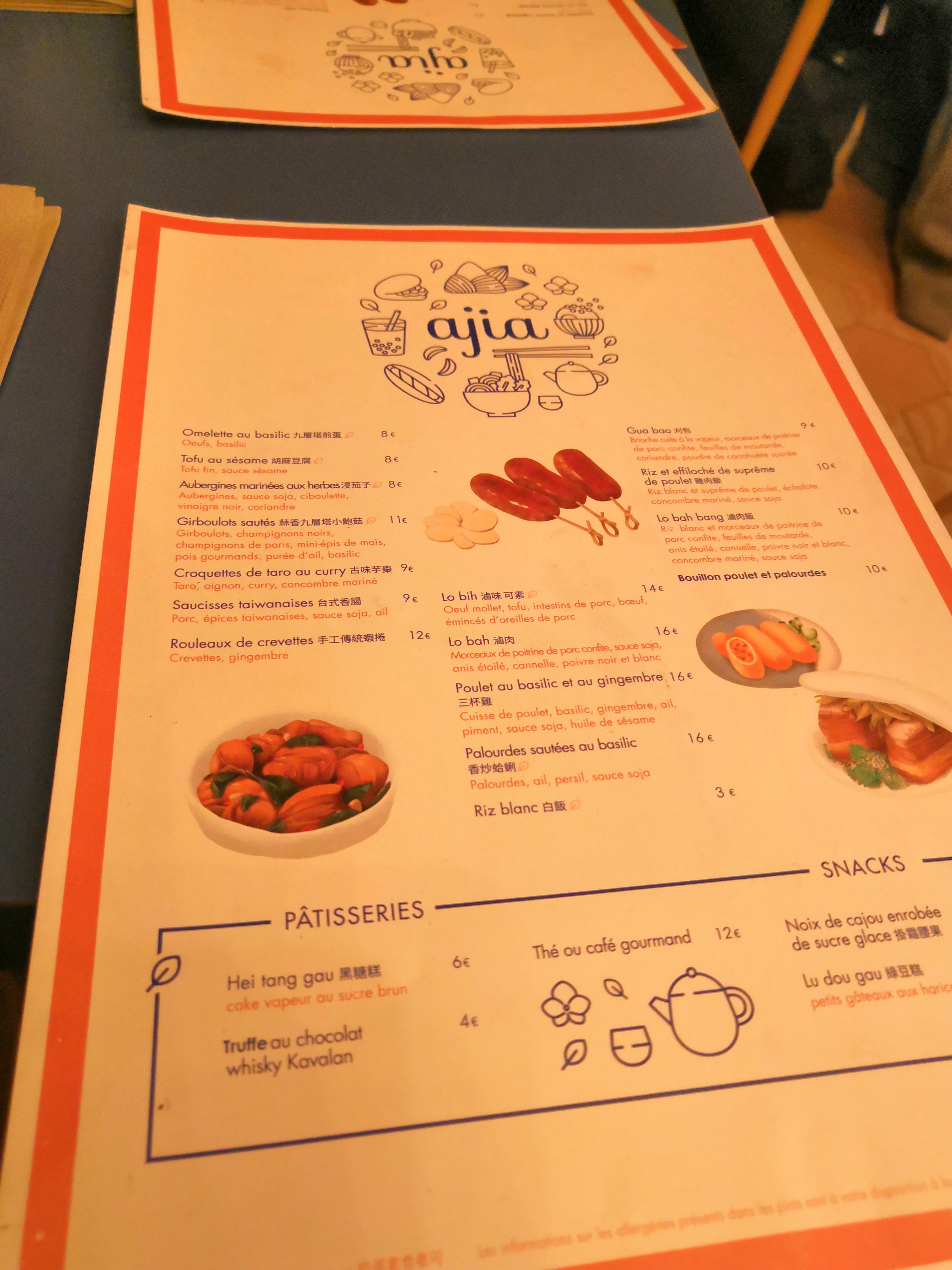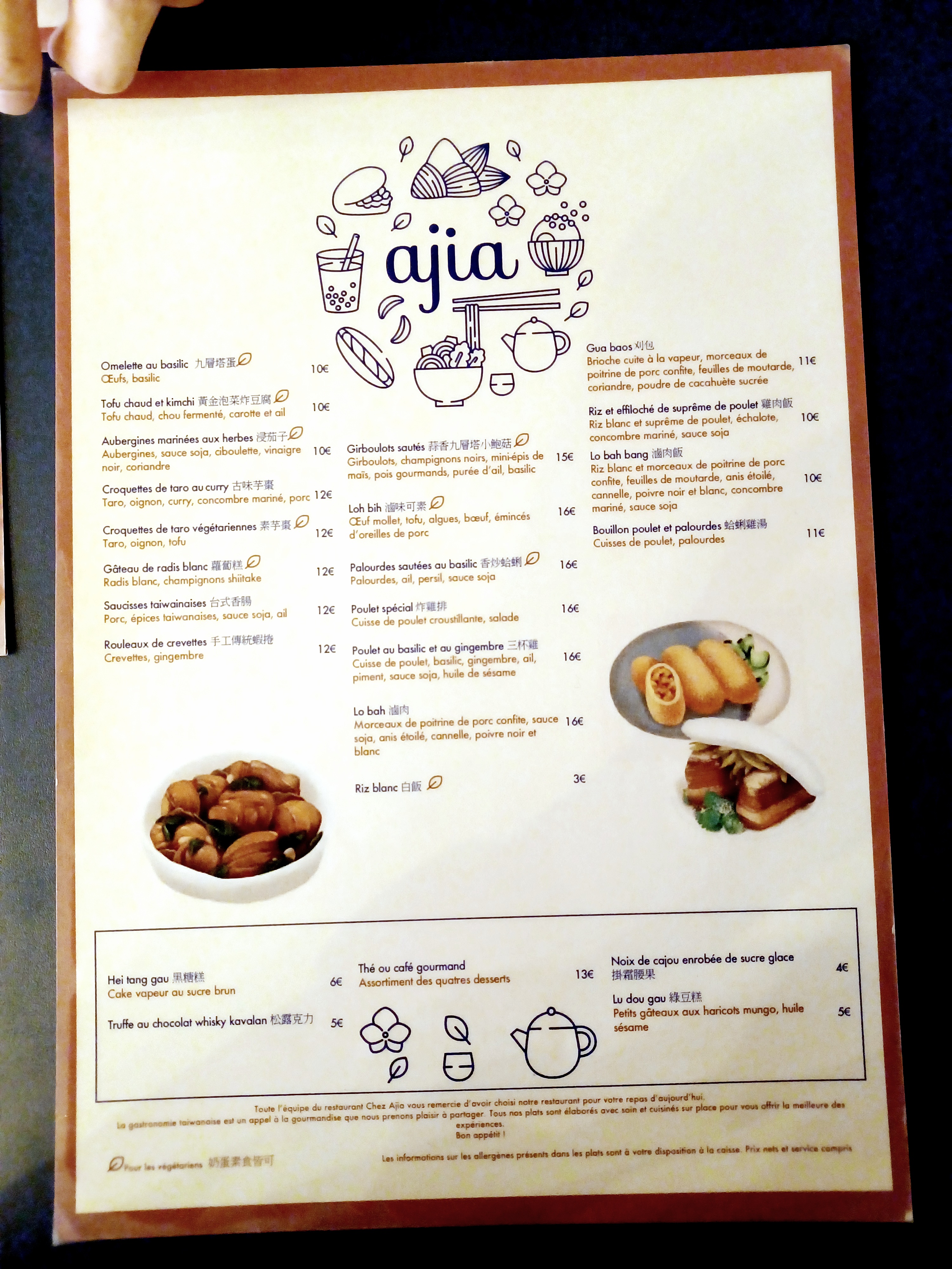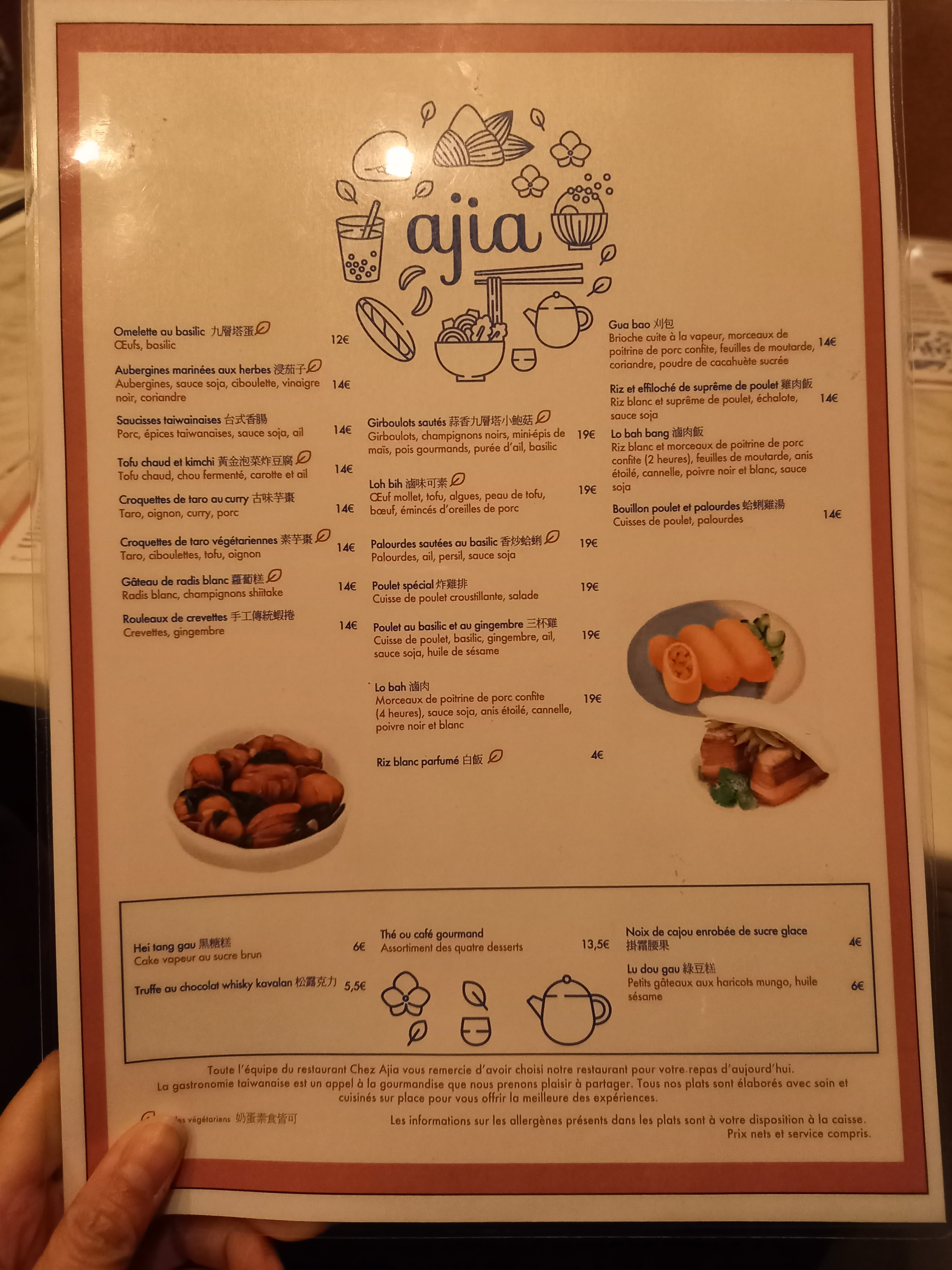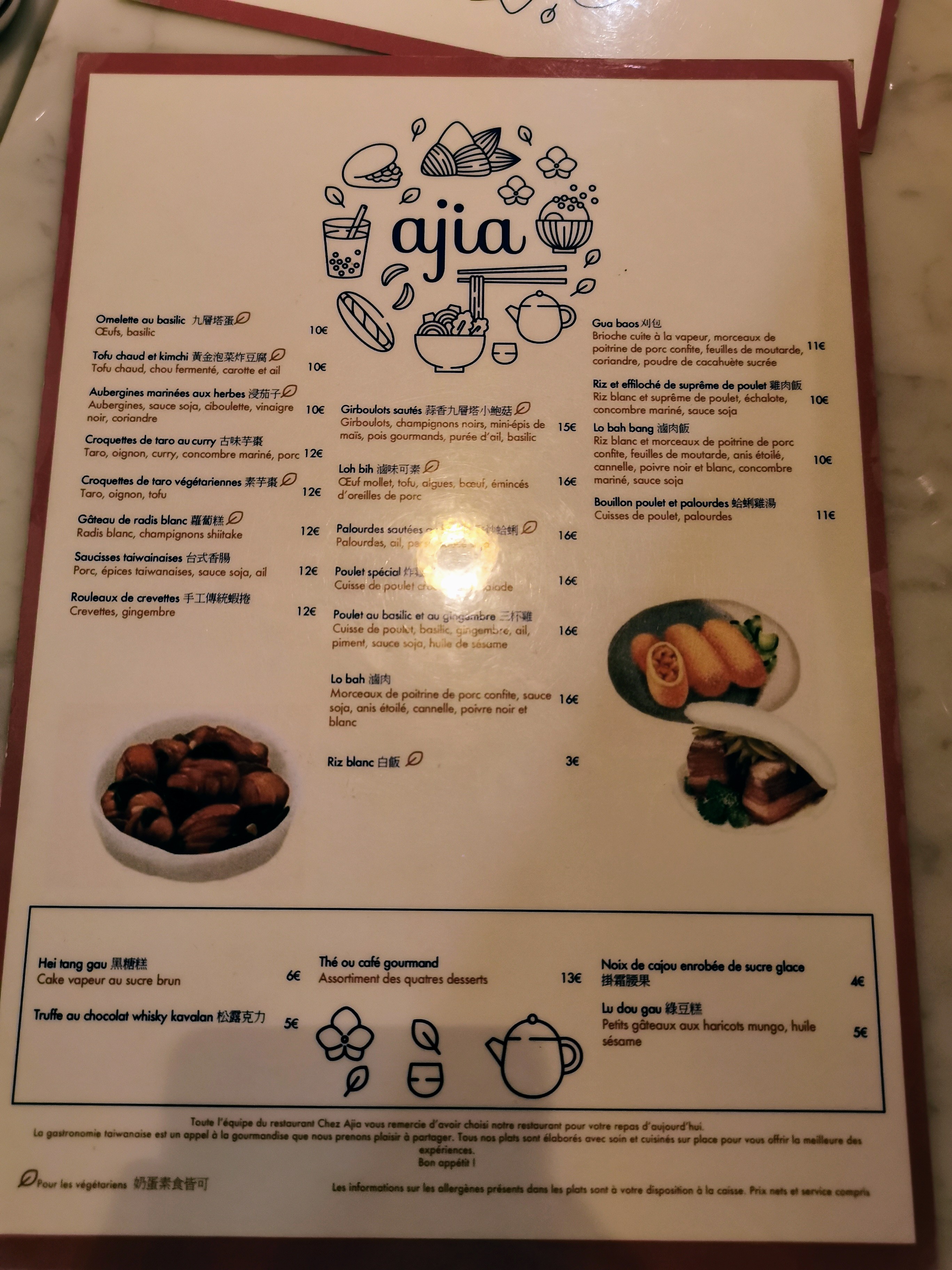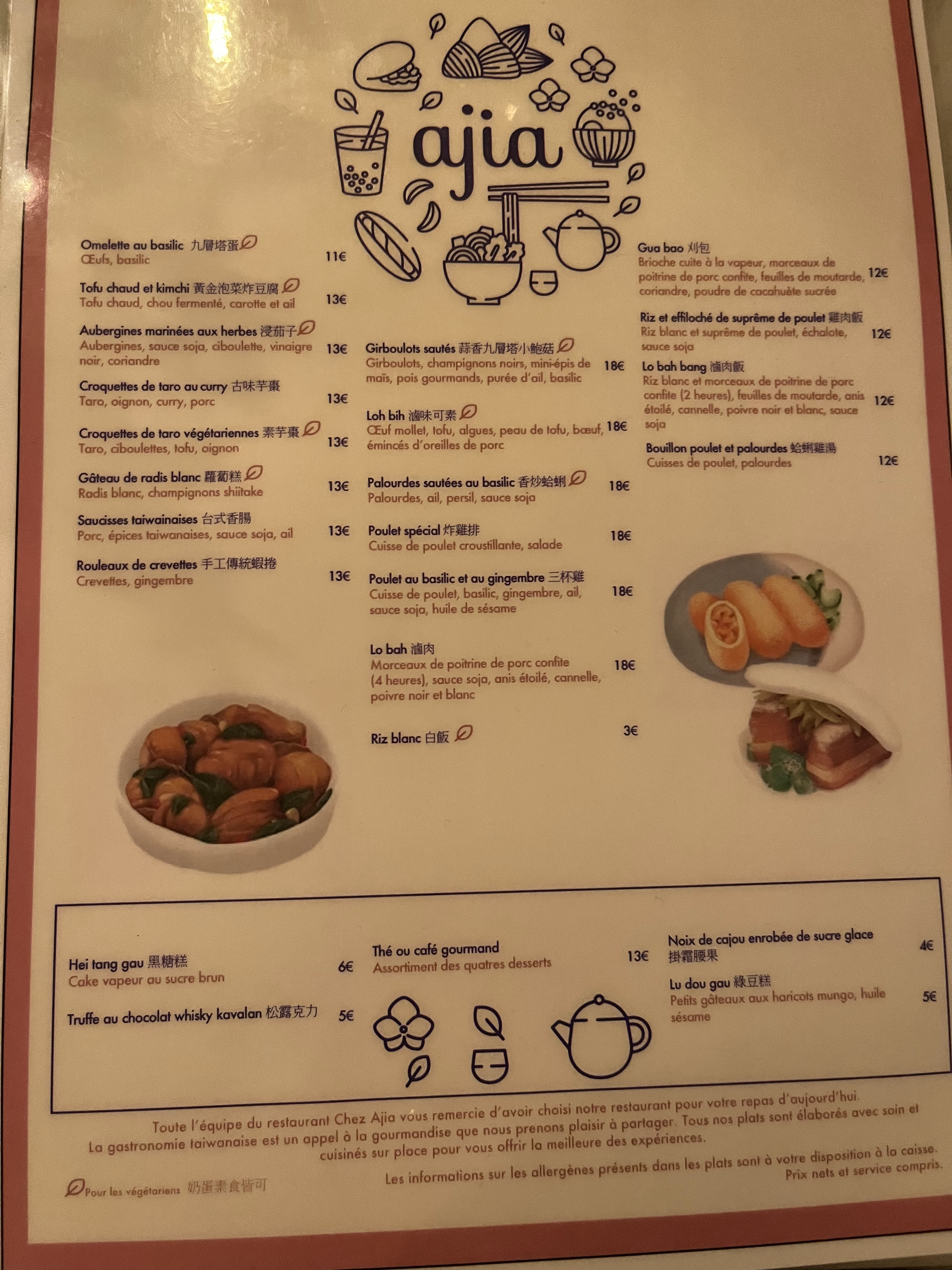 Super expérience chez Ajia :) Le patron et les serveurs sont aux petits soins avec nous. On nous a conseillé sur les plats en nous informant des spécificités taïwanaises de chaque préparation ! Les serveurs sont aimables et toujours très avenants, le cadre très cosy et moderne. La nourriture est exceptionnellement bonne, je recommande d’ailleurs les croquettes de taro et le Lo Bah qui étaient délicieux et riches en goût. Bref: allez-y, qui plus est les prix sont très raisonnables !