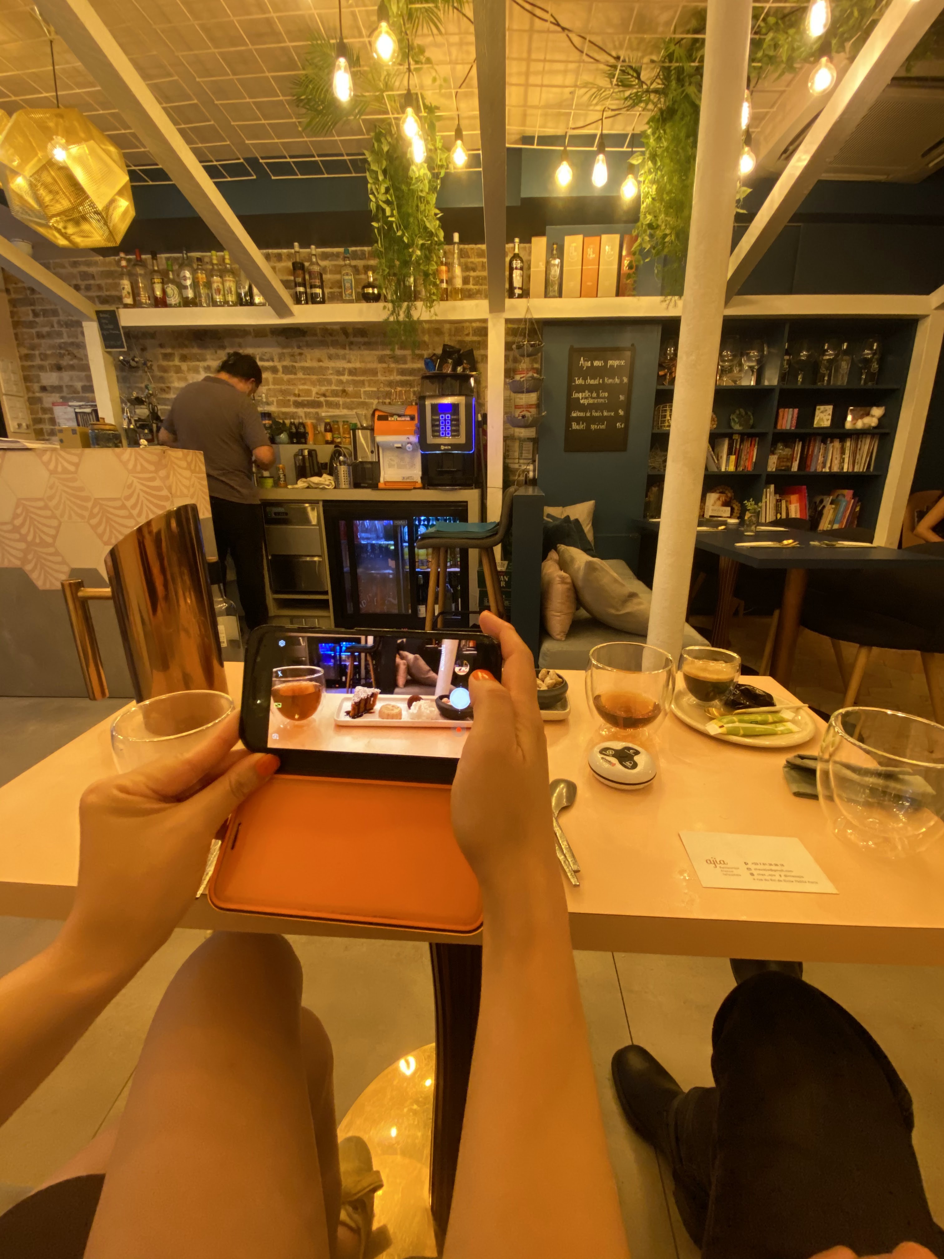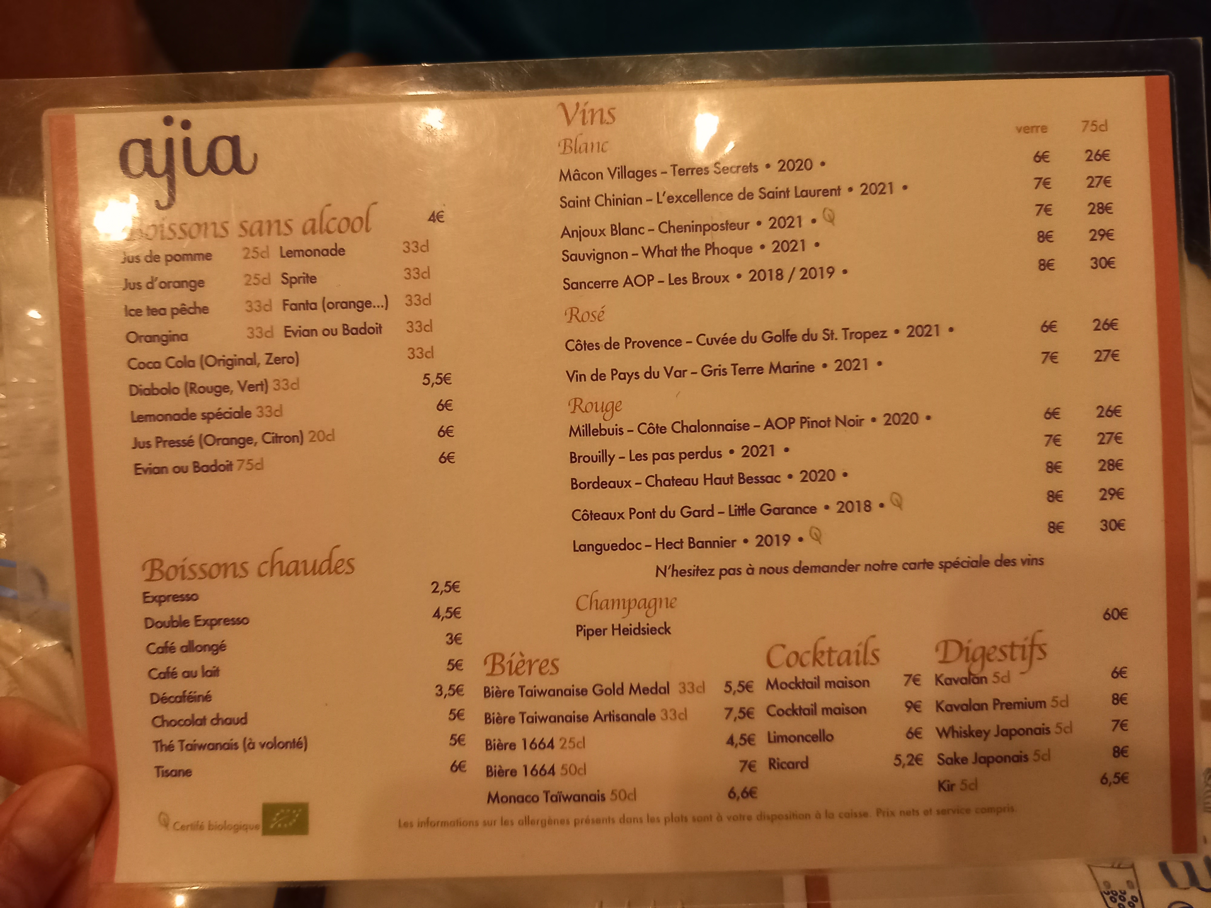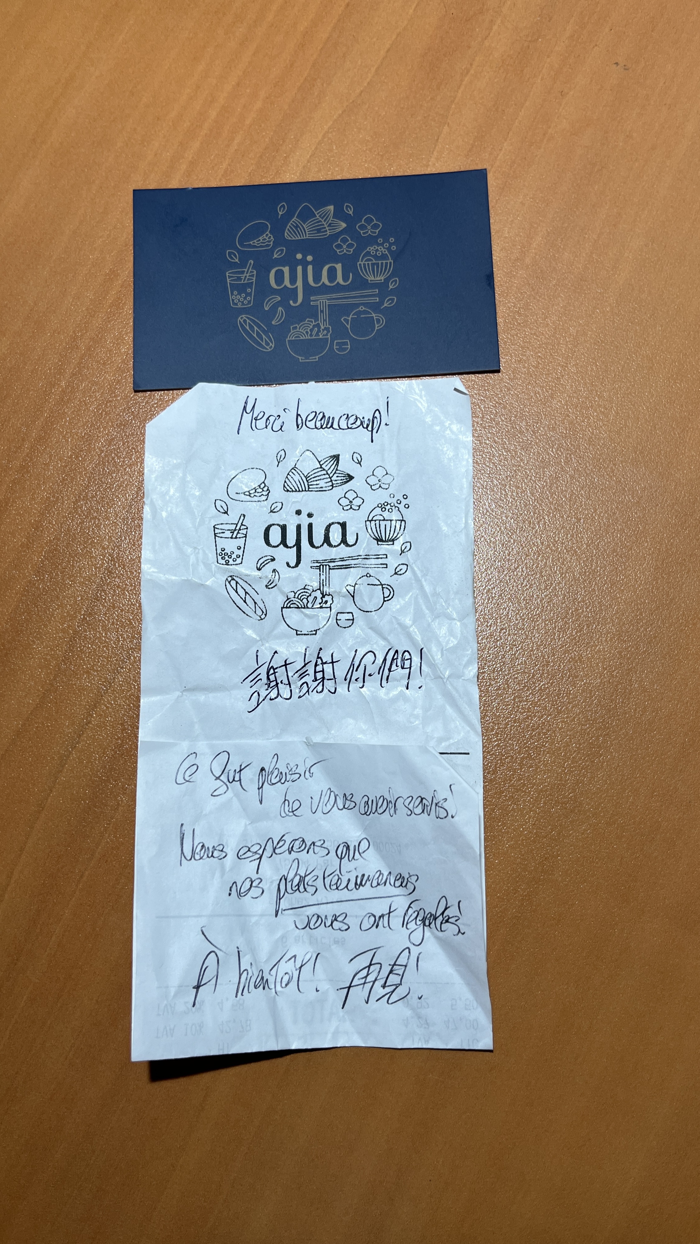 Déjeuner chez Ajia est un voyage au niveau des yeux, du palais et de la relation extrêmement personnalisée, simple et souriante. J’ai fait un certain nombre de voeux en goûtant pour la première fois plusieurs mets très bons. Regardez toutes les attentions : un tiroir pour ranger ses affaires, un petit mot sur l’addition ! Et tout ceci en fait une adresse que je recommande vivement !