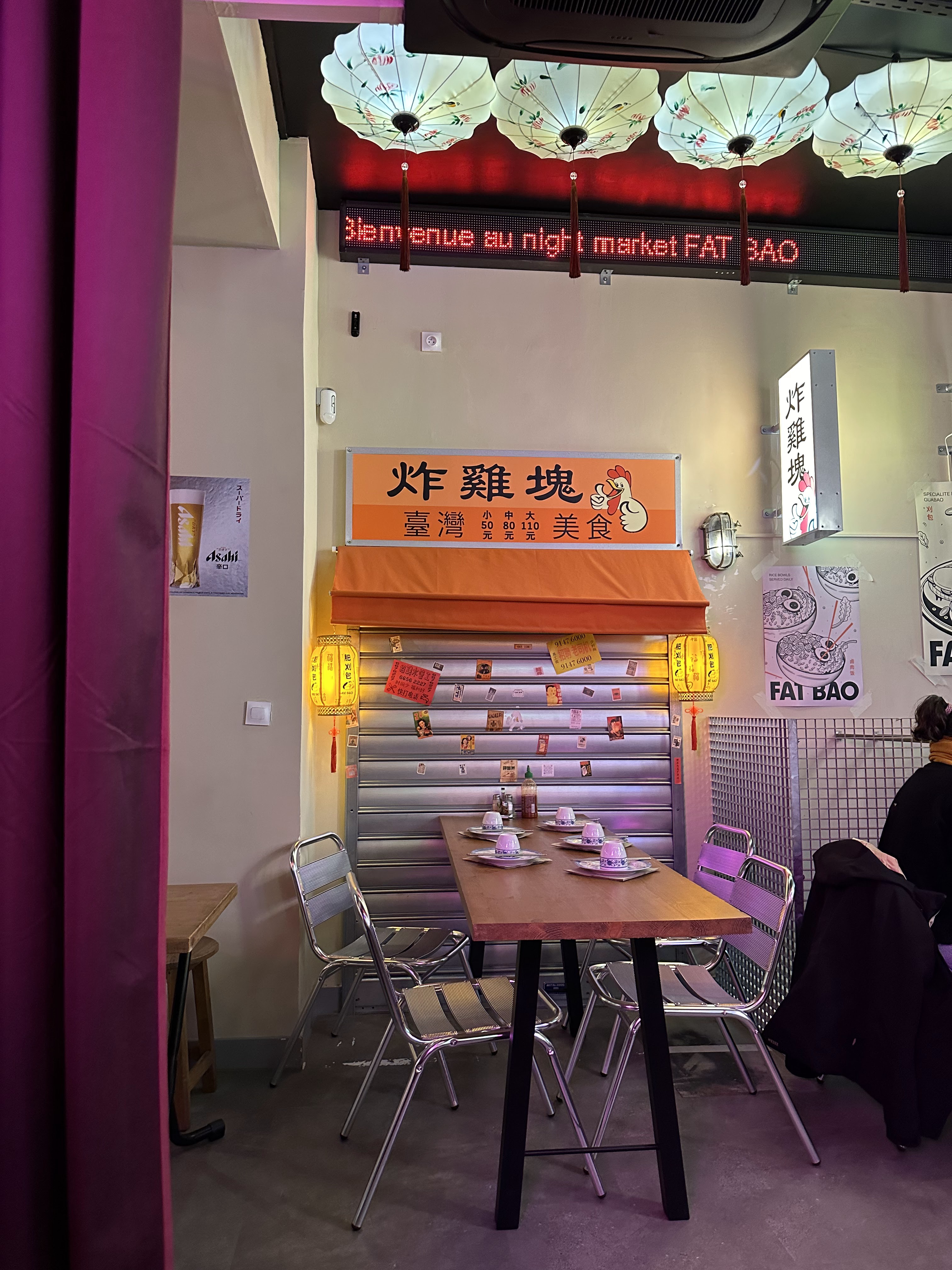 Bonjour Victoria, Merci encore de votre visite et de nous avoir laissé ce retour positif. Nous sommes ravis que vous ayez apprécié notre décoration et nos baos. Nous travaillons dur chaque jour pour vous proposer des produits frais et entièrement faits maison. Nous avons choisi d’installer des tabourets sur une partie du restaurant (l’autre partie ayant des chaises avec dossier) afin d’être fidèle à notre ambiance immersive, comme dans un marché nocturne à Taïwan. Votre remarque est pertinente et nous sommes en train de trouver une solution de crochets à installer au mur. 😁 A très vite chez Fat Bao ! Guillaume et Hélène