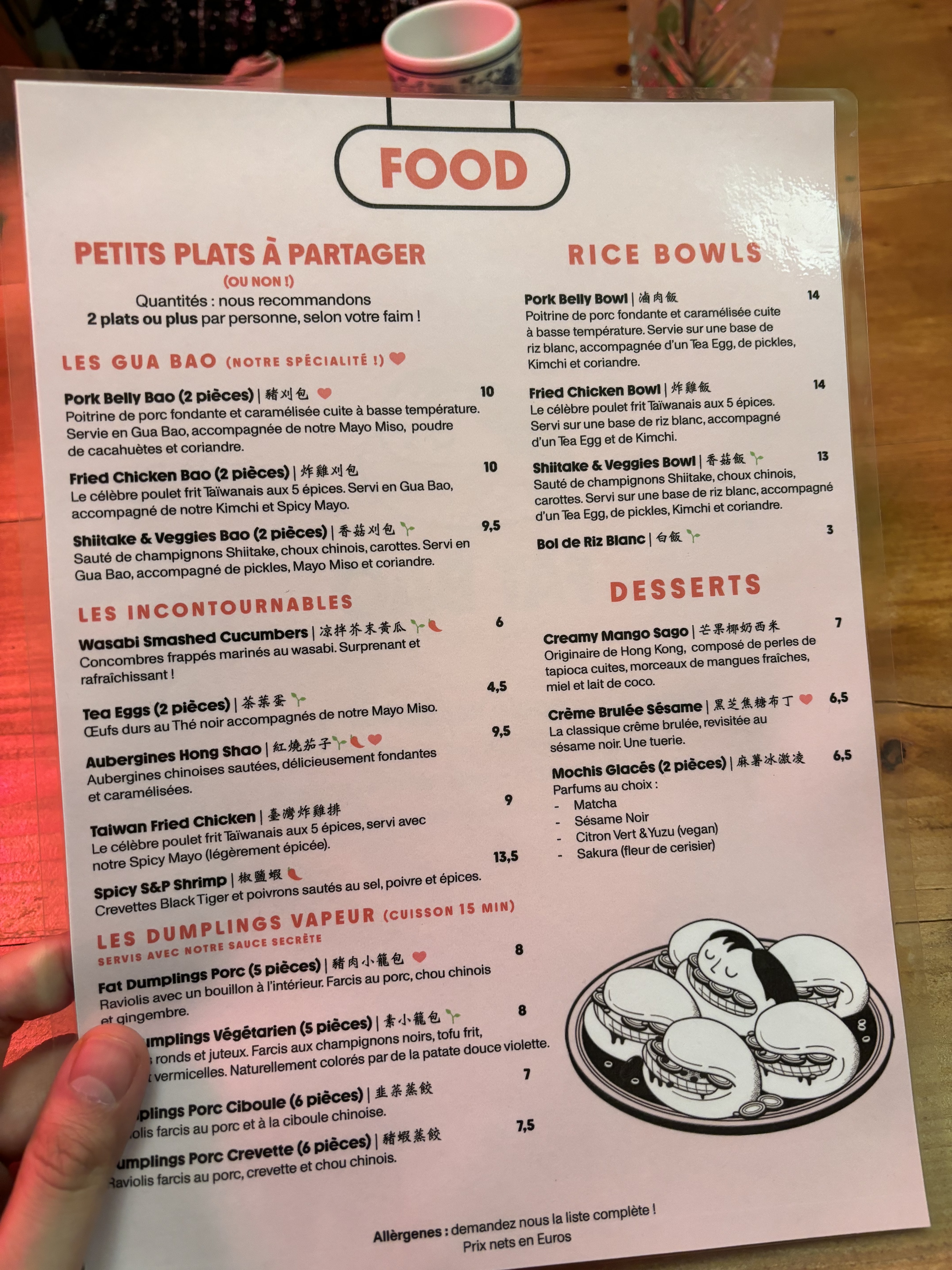 Très sympa. Effectivement les bao sont bons. Le rapport qualité-prix est correct pour Paris. Gros point positif : la salle est très propre. Le service est avenant et rapide. La déco est très sympa dans une thème “rue de Taïwan”. Seul petit bémol : les tables et tabourets sont assez inconfortables et il n’y a rien pour poser ses affaires. Prévoyez donc de venir légers !