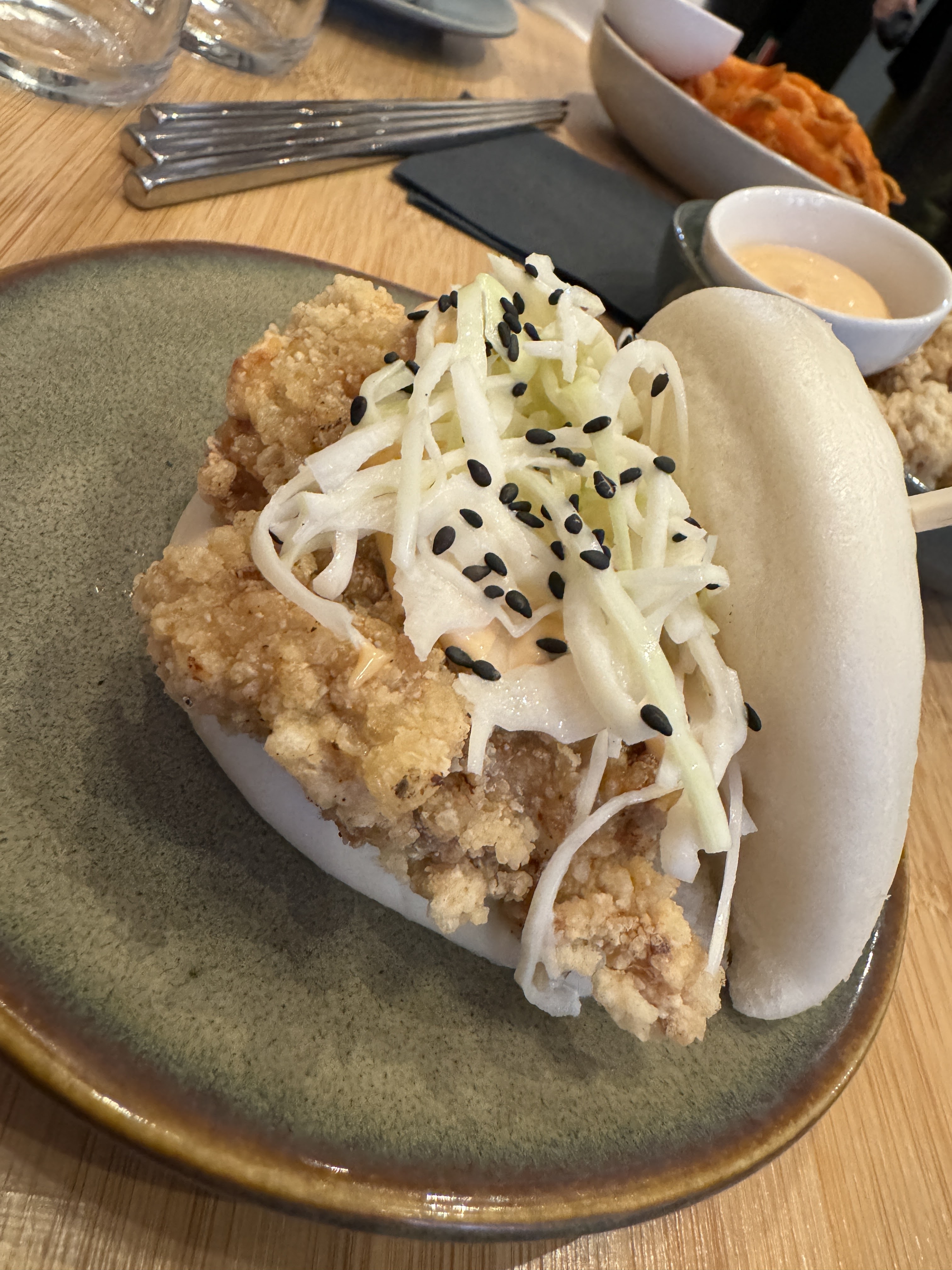 Un très bon moment de découverte avec des Gua Bao faits maison. Excellent. Accompagné de frites de patates douces croustillantes. Je recommande.