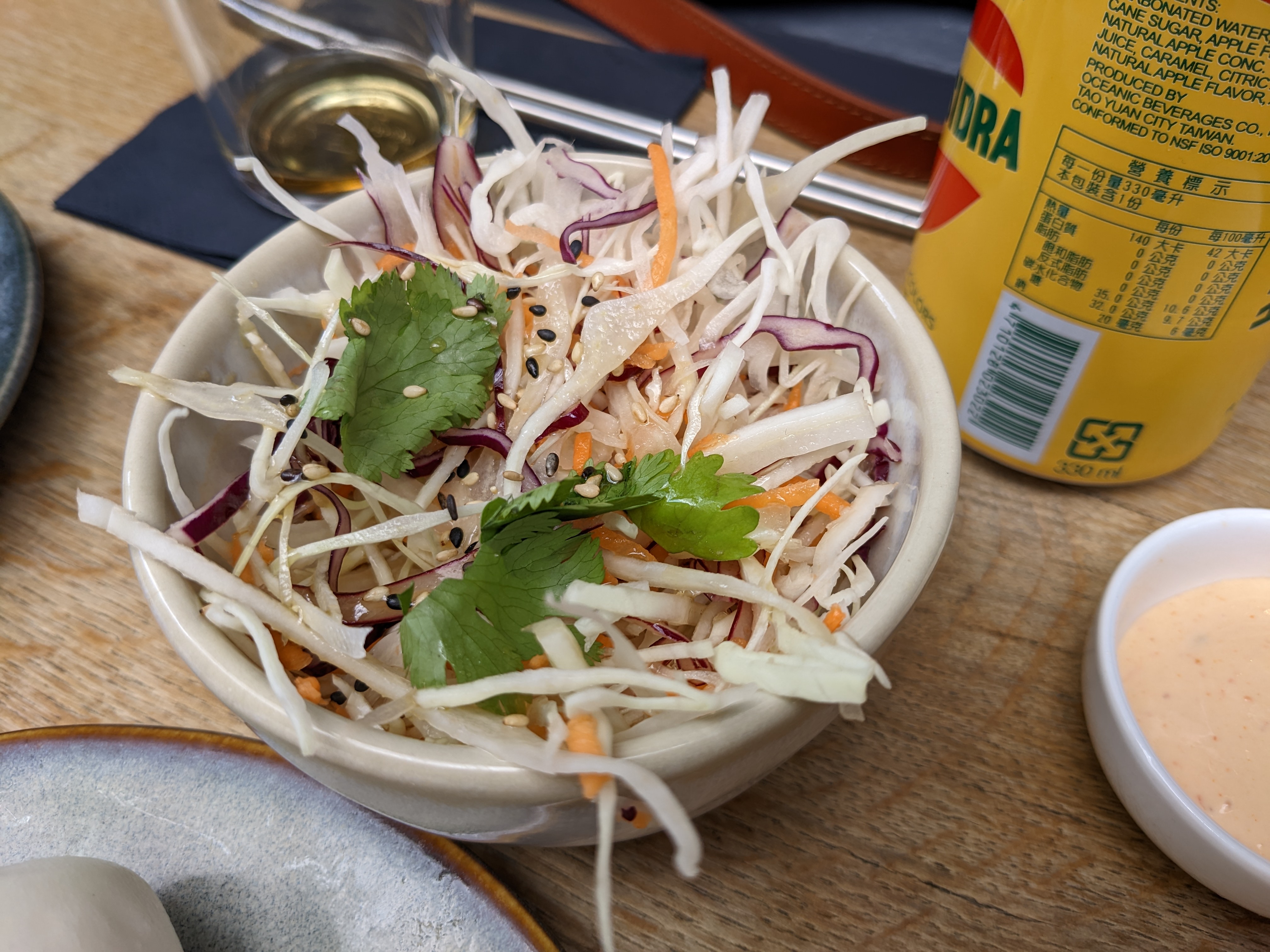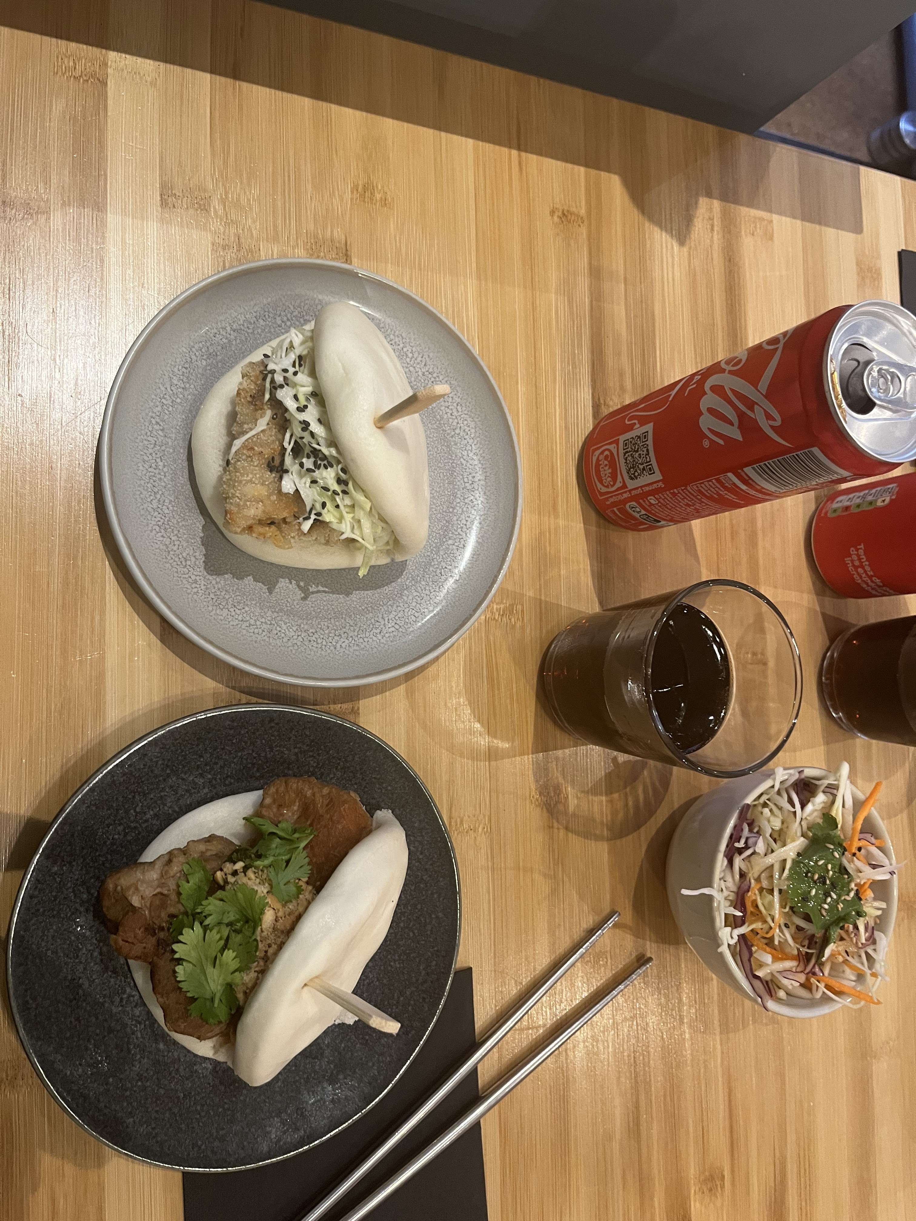 Restaurant très cosy et équipé souriante. Nous avons pris un Gua Bao classic et fried chicken accompagné de coleslaw et poulet frit. Un dessert Bao Choco. Avec une bière Asahi et un thé glacé thé vert citron et fleurs de sureau, délicieux. Tout fait maison et très bien présenté :) Je recommande :)