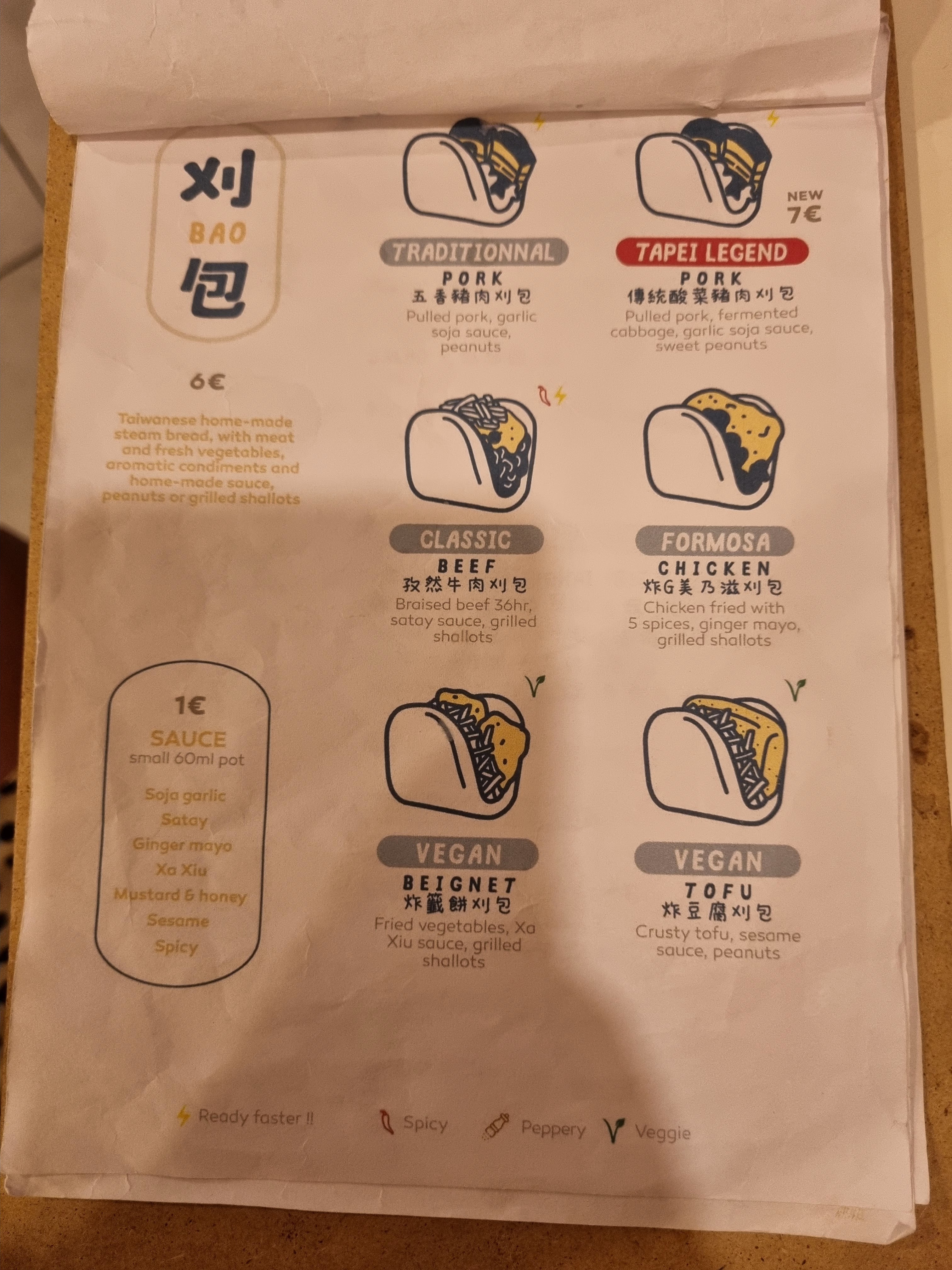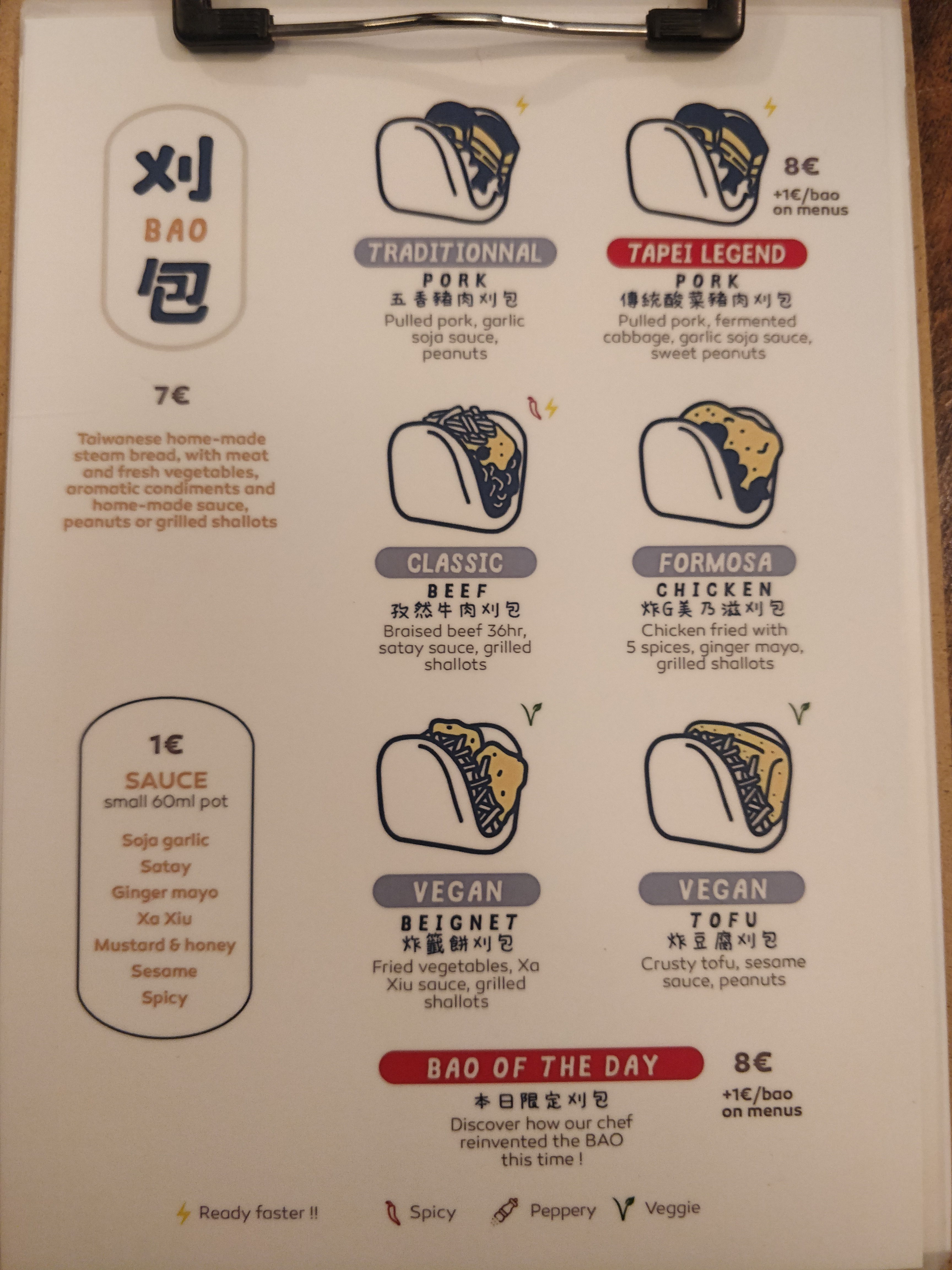 Endroit petit mais confortable, très gentil et accessible, nourriture délicieuse servie sur des plateaux. Ils ont du bao mais aussi d'autres plats, comme vous pouvez le voir sur le menu.