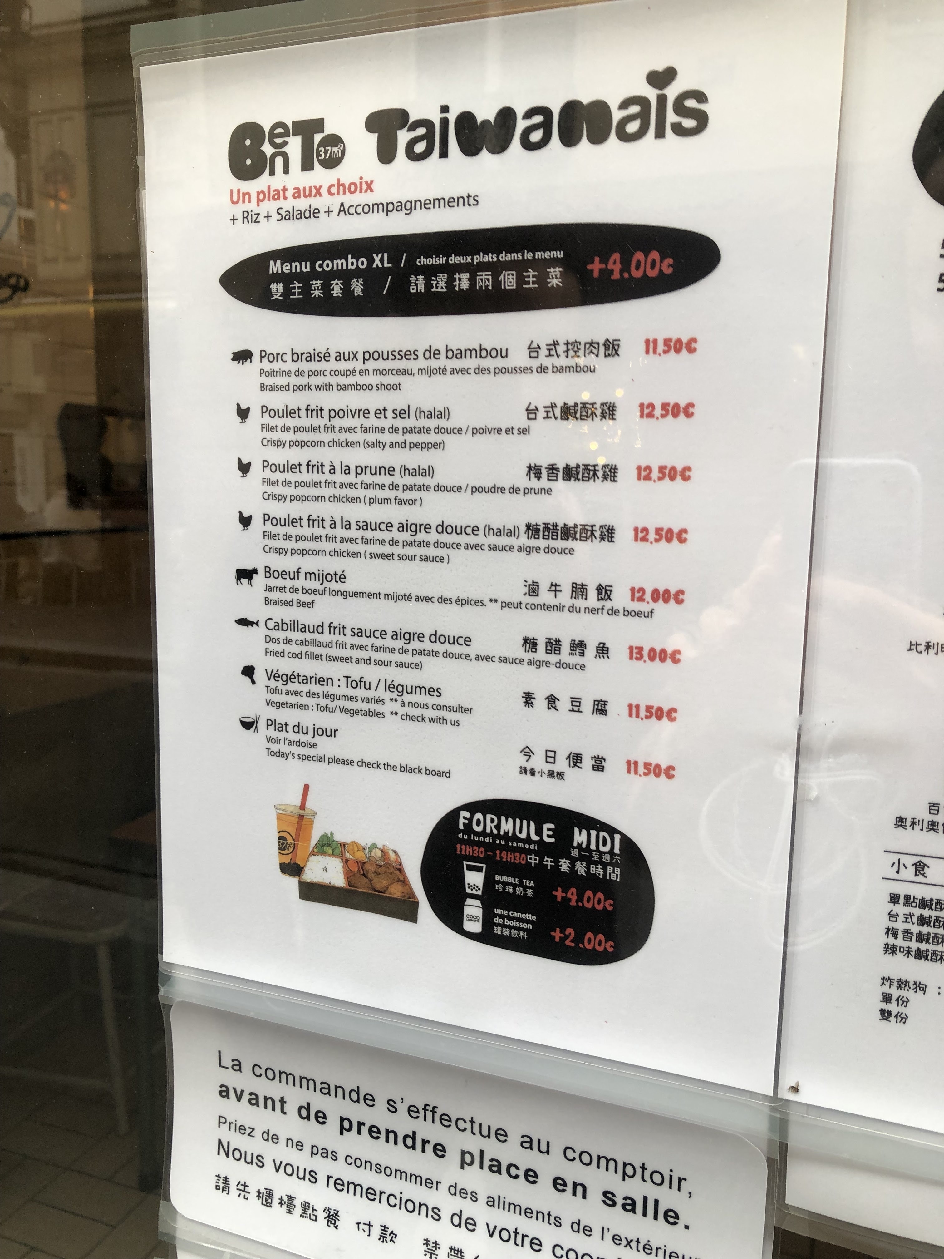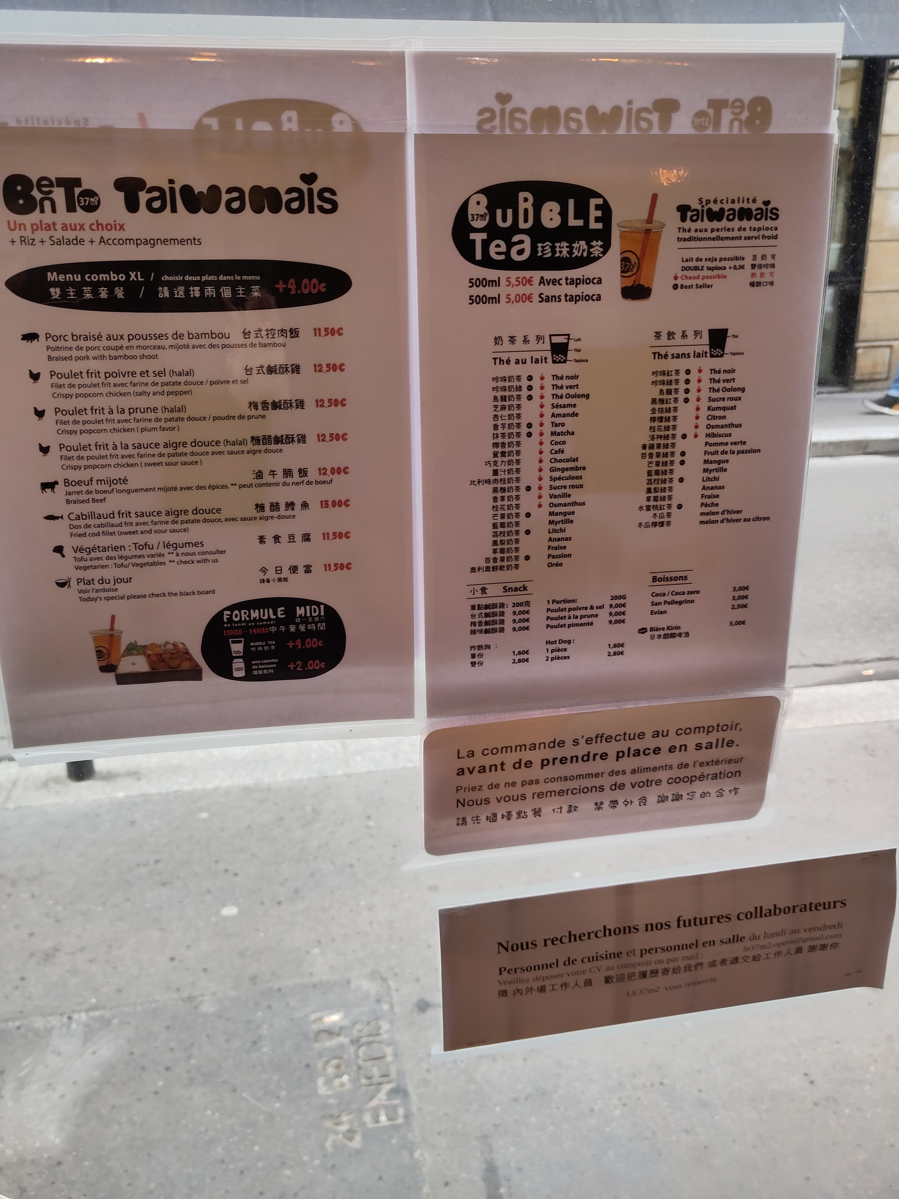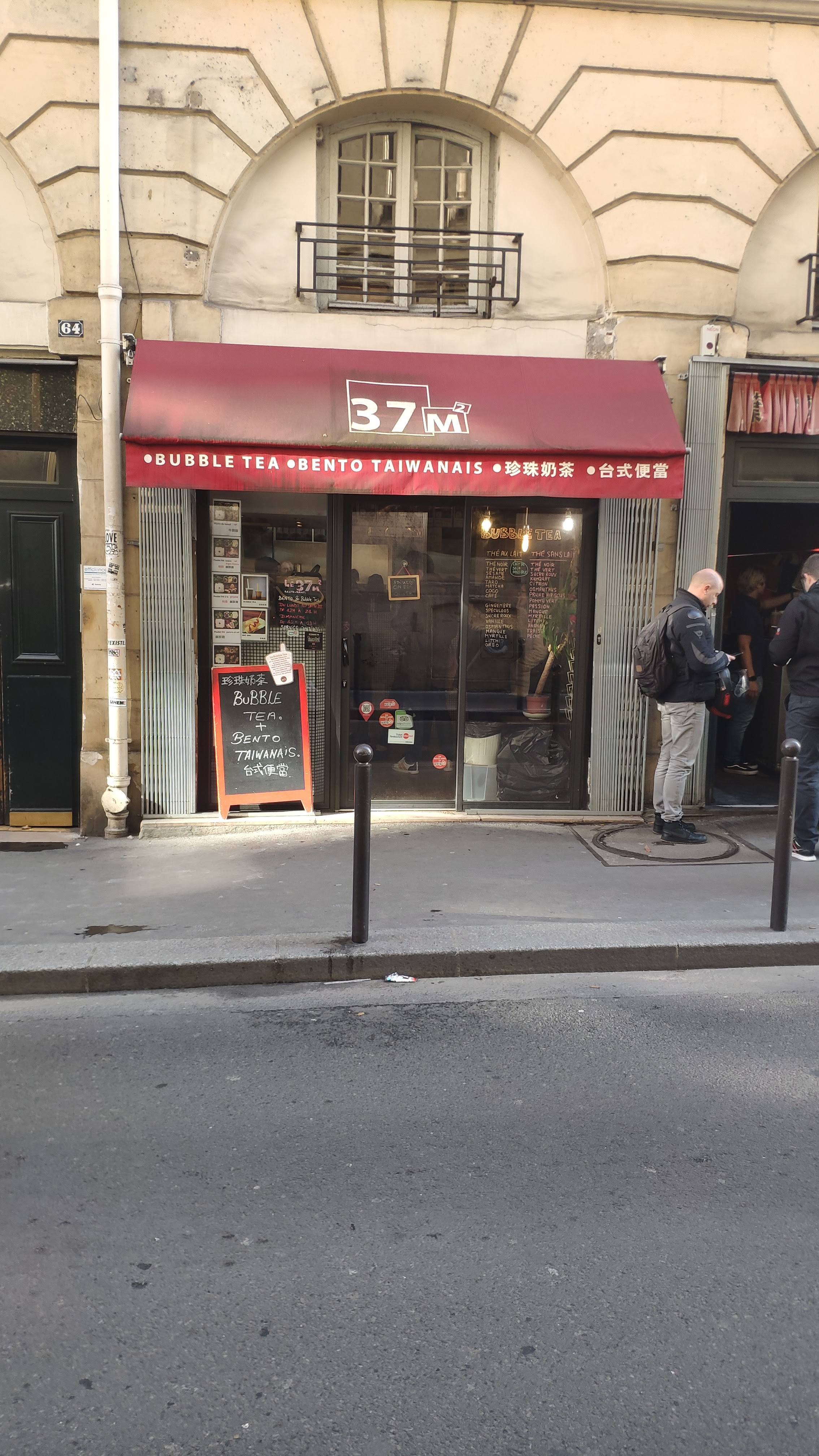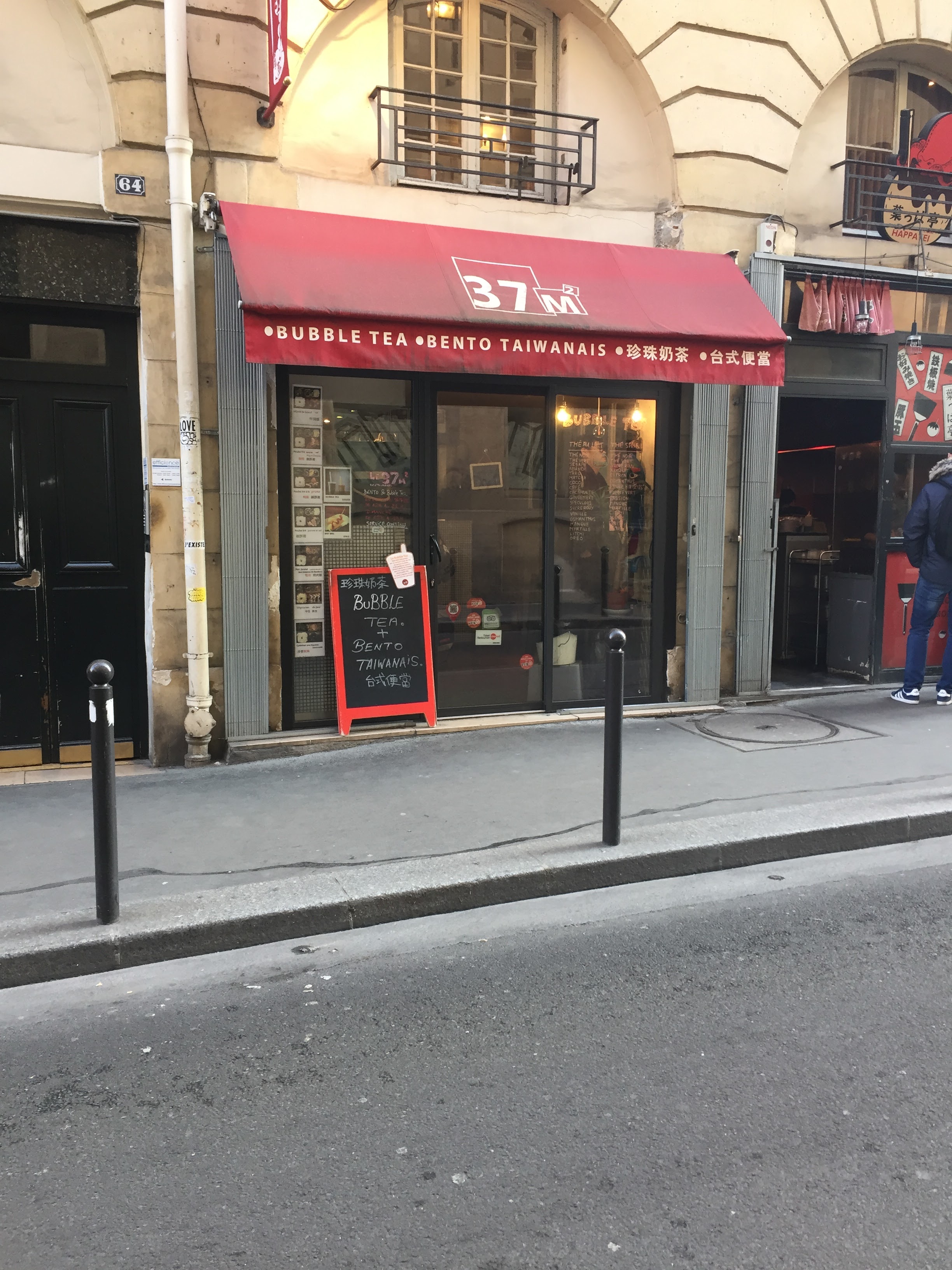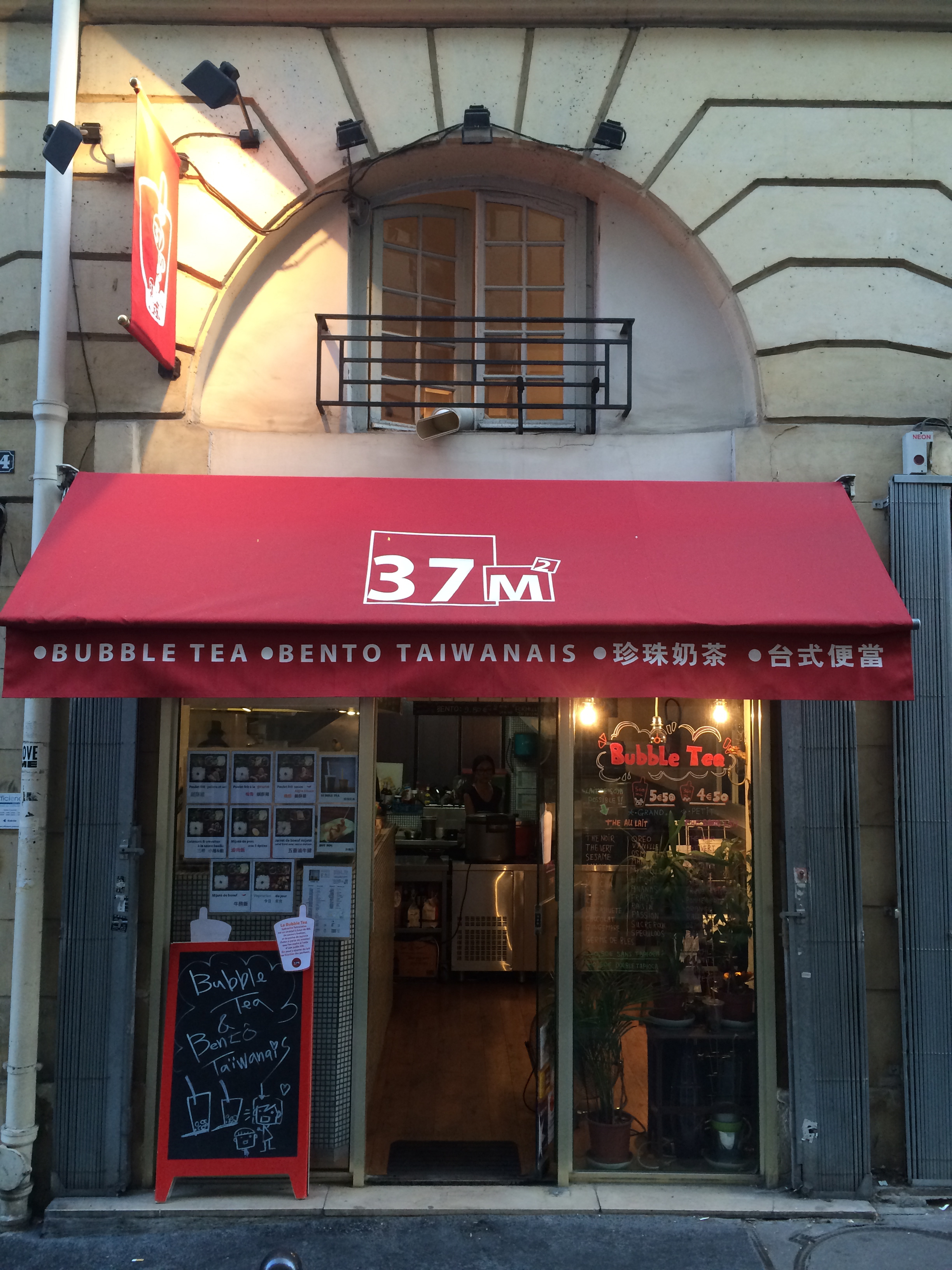 Petit resto taiwanais (un vrai taiwanais, tenu par des taiwanais), servant de délicieux bentos de super bonne qualité, avec des petits accompagnements chaque jour différent. Le poulet aigre douce et le calamar sont mes préférés, le poulet poivre et sel est aussi un délice, et ma fille ne jure que par le mijoté de boeuf aux carottes. Les bubble teas sont un régal, préparés avec du vrai thé et de bons ingrédients, pas comme la majorité des autres qui le font avec de la poudre (pour les bubble teas, il faut vraiment se limiter à 37m2 et zenzo.... le reste....oubliez). Le service est impeccable, les employés sympas et souriants, tout le monde est toujours de bonne humeur. Un gros point positif, le service est continu de 12h à 21h... donc on peut venir manger même en plein milieu de l'après midi ! C'est mon restaurant préféré à Paris. Quand il est fermé pour les vacances, c'est horrible... Mais demain c'est ouvert, alors j'y vais !!! Merci 37m2 !!!!!!