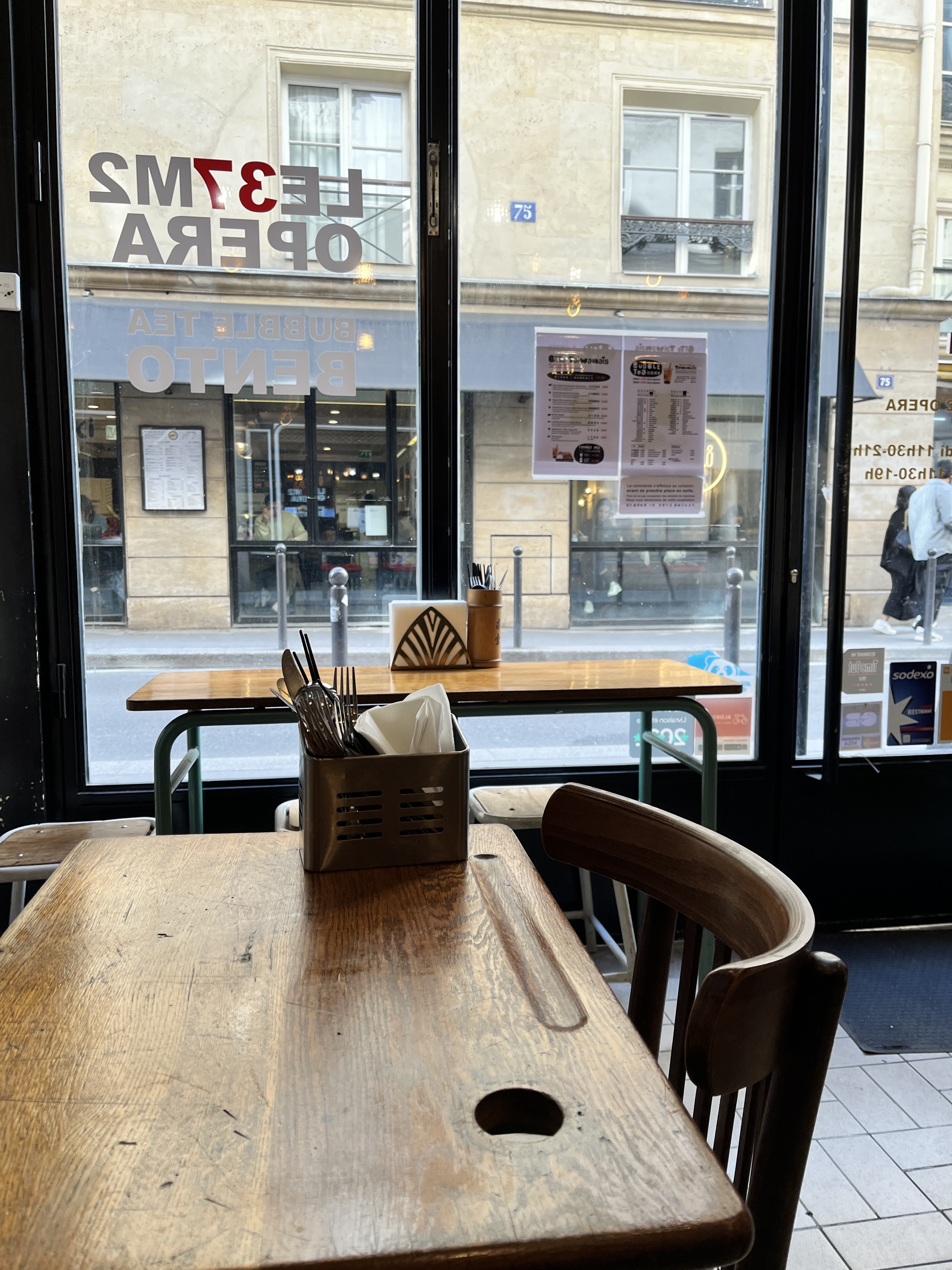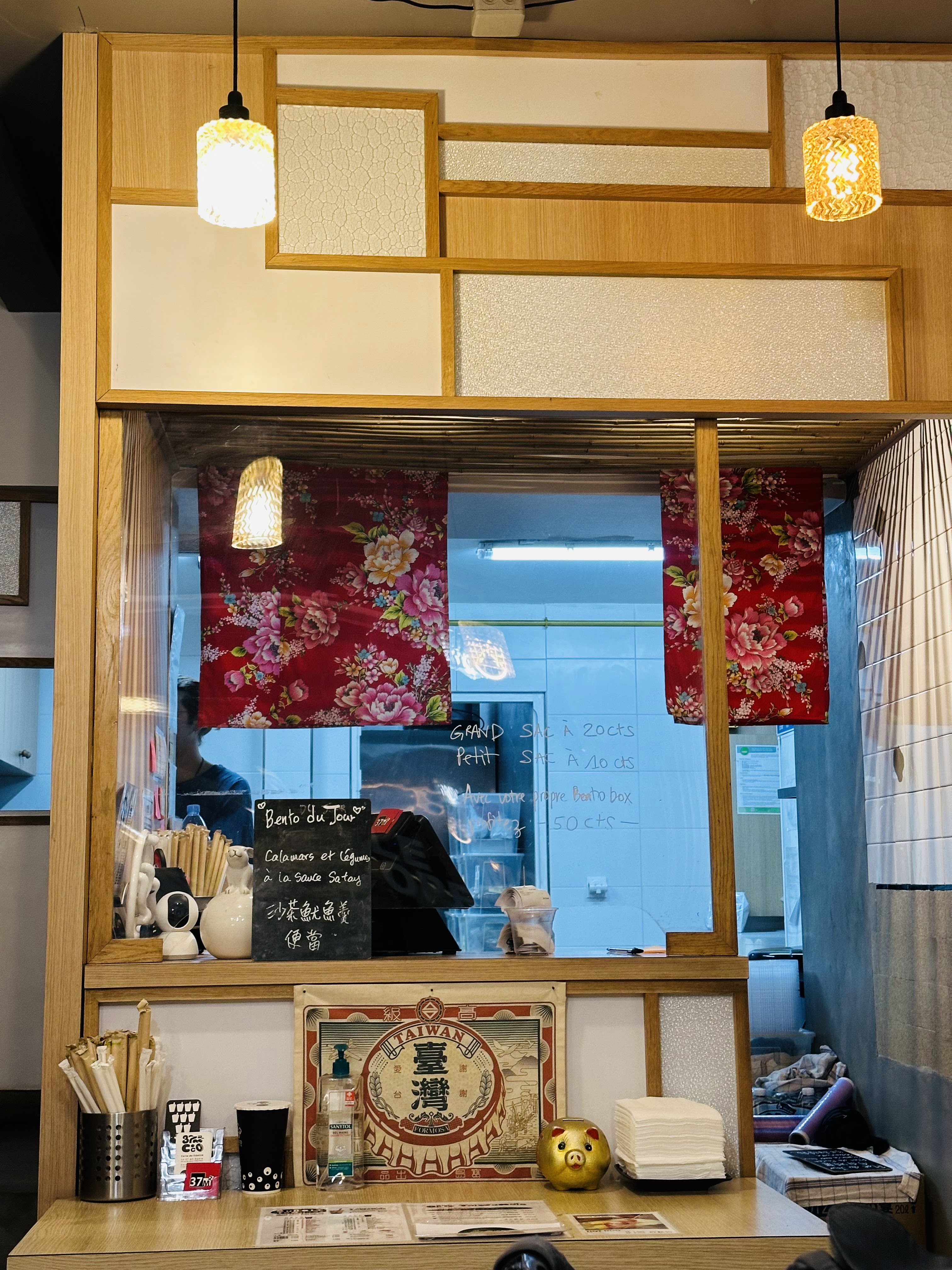 J'ai été pour la 1e fois dimanche dernier et j'ai adoré le concept du bento. J'ai commandé celui au calamar vraiment c'est simple et bon. Le petit hot dog était pas mal non plus. J'adore l'atmosphere qui me rappelle vraiment l'Asie #la déco usée#, particulièrement ça à un charme, tous les restaurants ont le même style dans le quartier et je trouve que visuellement ça fait du bien de voir un restaurant qui sort un peu du lot même en terme de déco, on voit qu'il y a une identité et il y a une petite banquette sympa en plus. Le prix vraiment très abordable dans le quartier opera et j'adore le personnel qui m'ont appris à dire #au revoir# en taiwanais mais que jai déjà oublié comment le dire. Foncez à cloche pied mais sans tomber ! :)