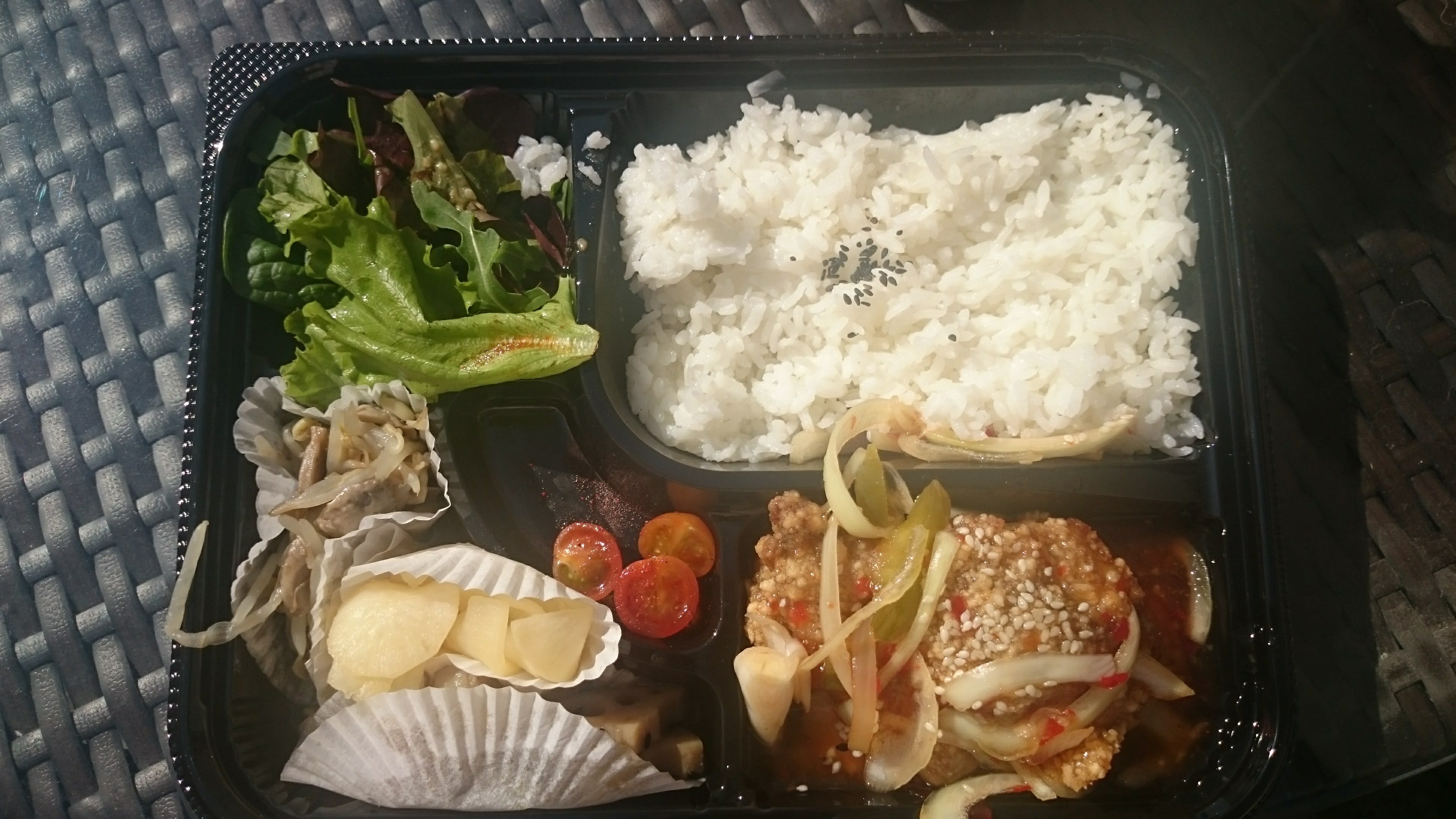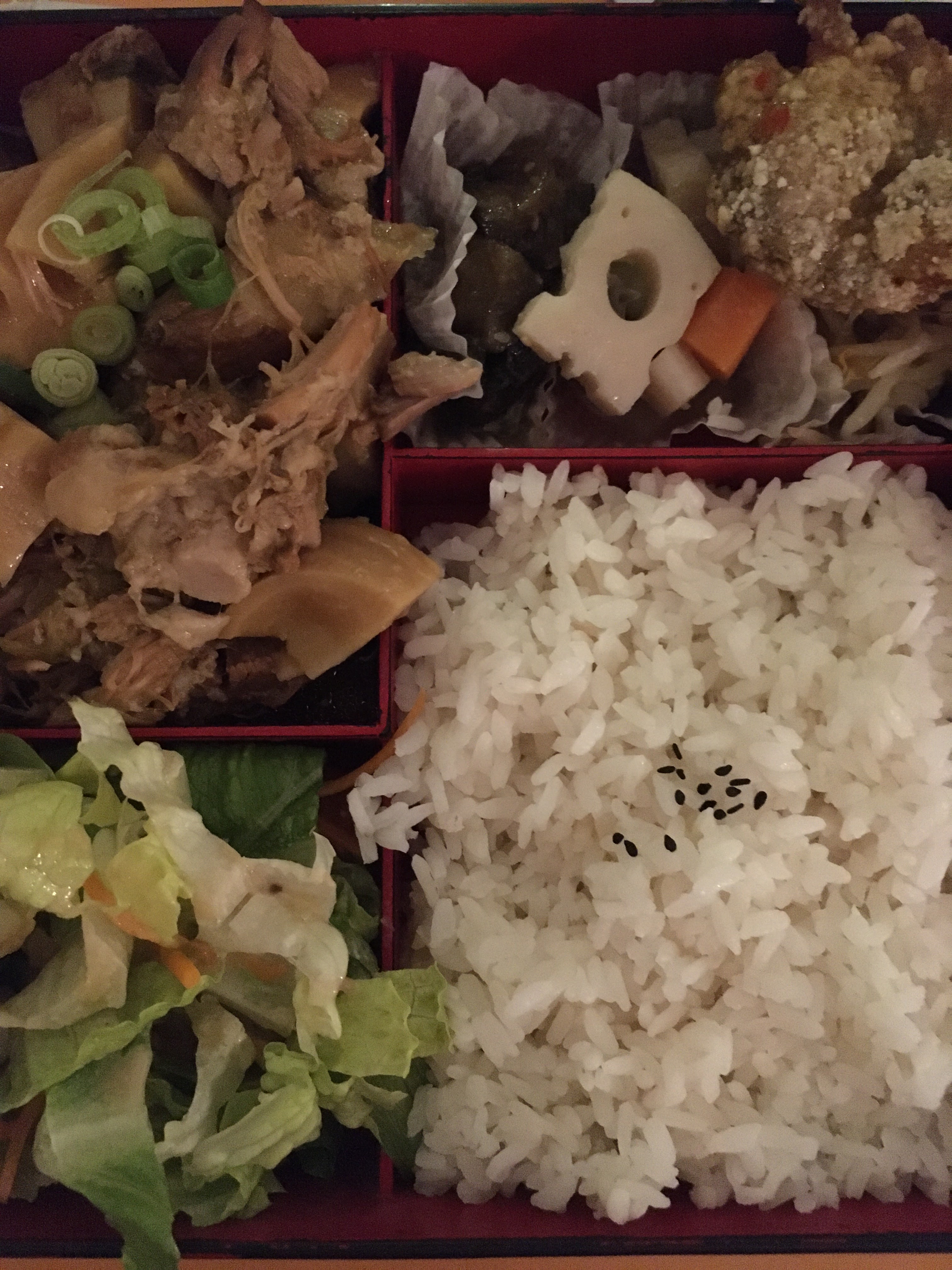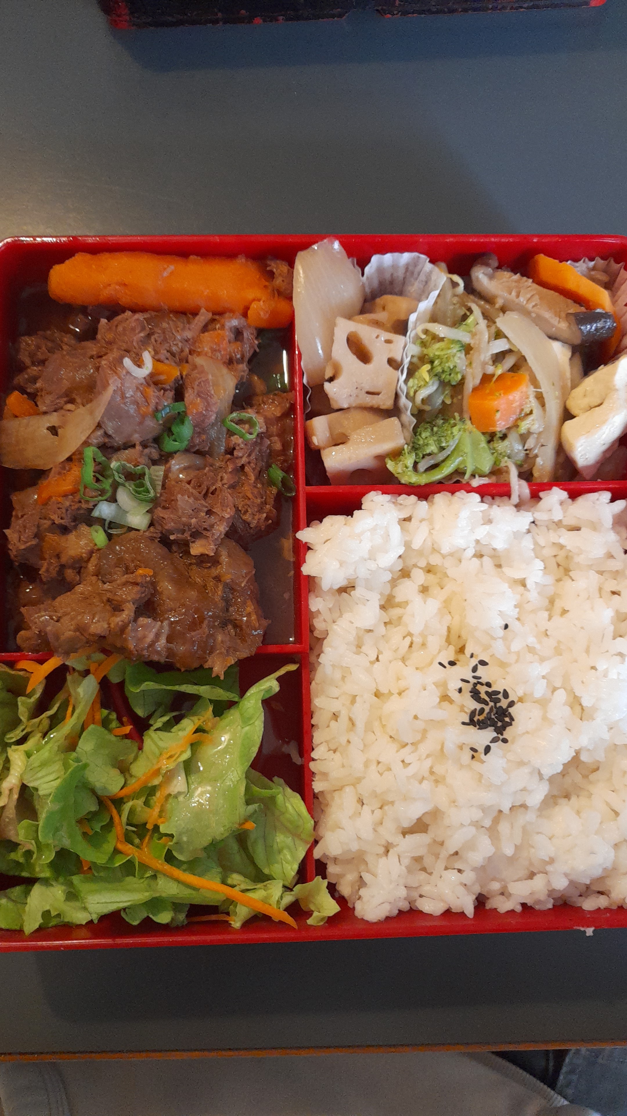 Très bon bento avec plusieurs petit légumes et la quantité est importante !! Pour 12€ environ vous ressortez rassasié !