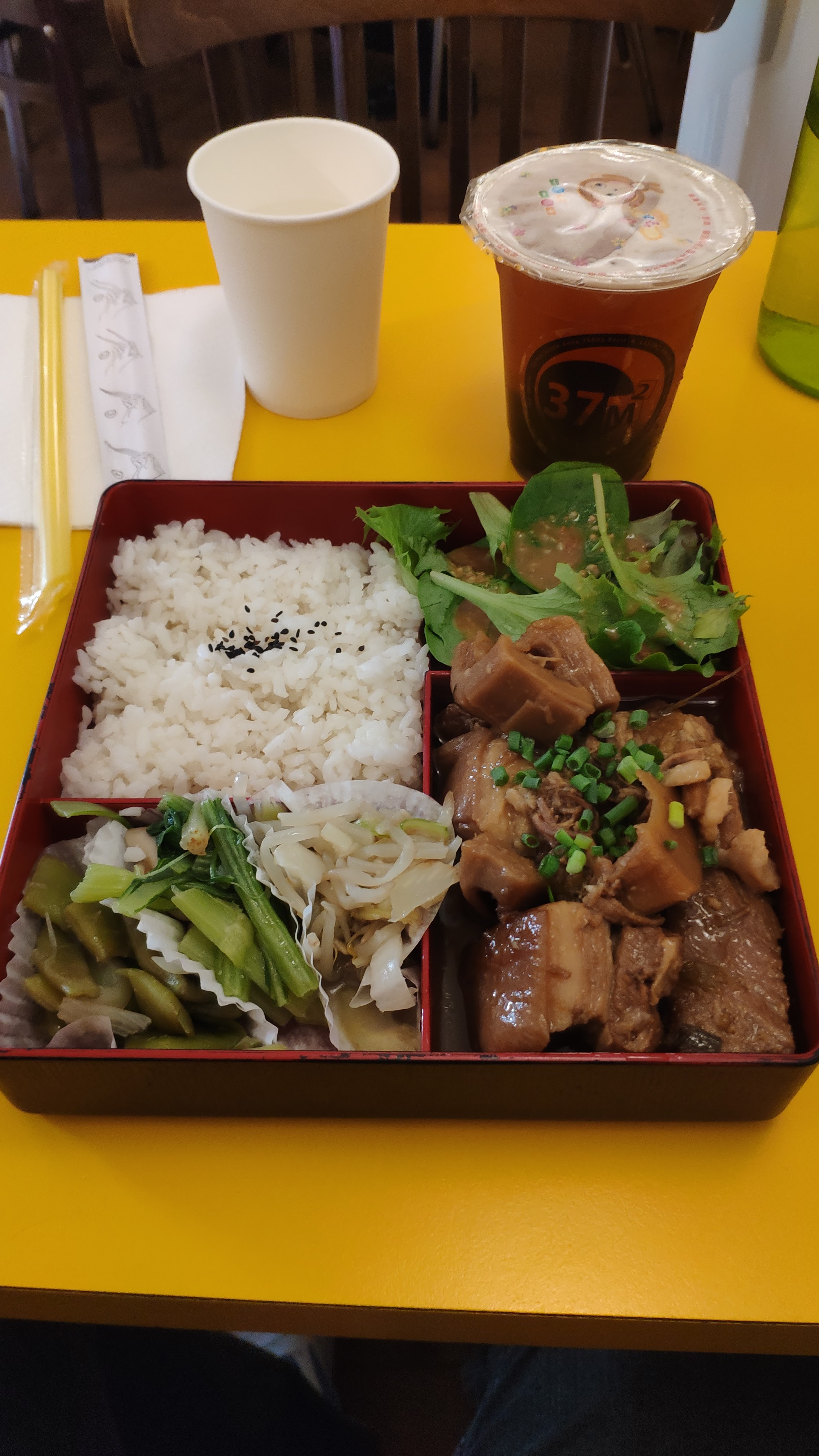 Le restaurant 37m2 propose des bentos déjà composés où l'on peut choisir sa « viande » parmi du bœuf, du poulet ou même du tofu. Les plats sont faits maison, et ça se sent ! Les viandes sont parfaitement mijotées, et le poulet est bien croustillant. C'est un vrai régal, surtout avec un Bubble Tea en accompagnement. Je recommande vivement ! Une petite salle se trouve à l’étage, mais attention il y a peu de place. Le personnel est adorable merci à eux pour ce lieu convivial ✨ Je joins quelques photos du menu pour vous donner un aperçu.🍱