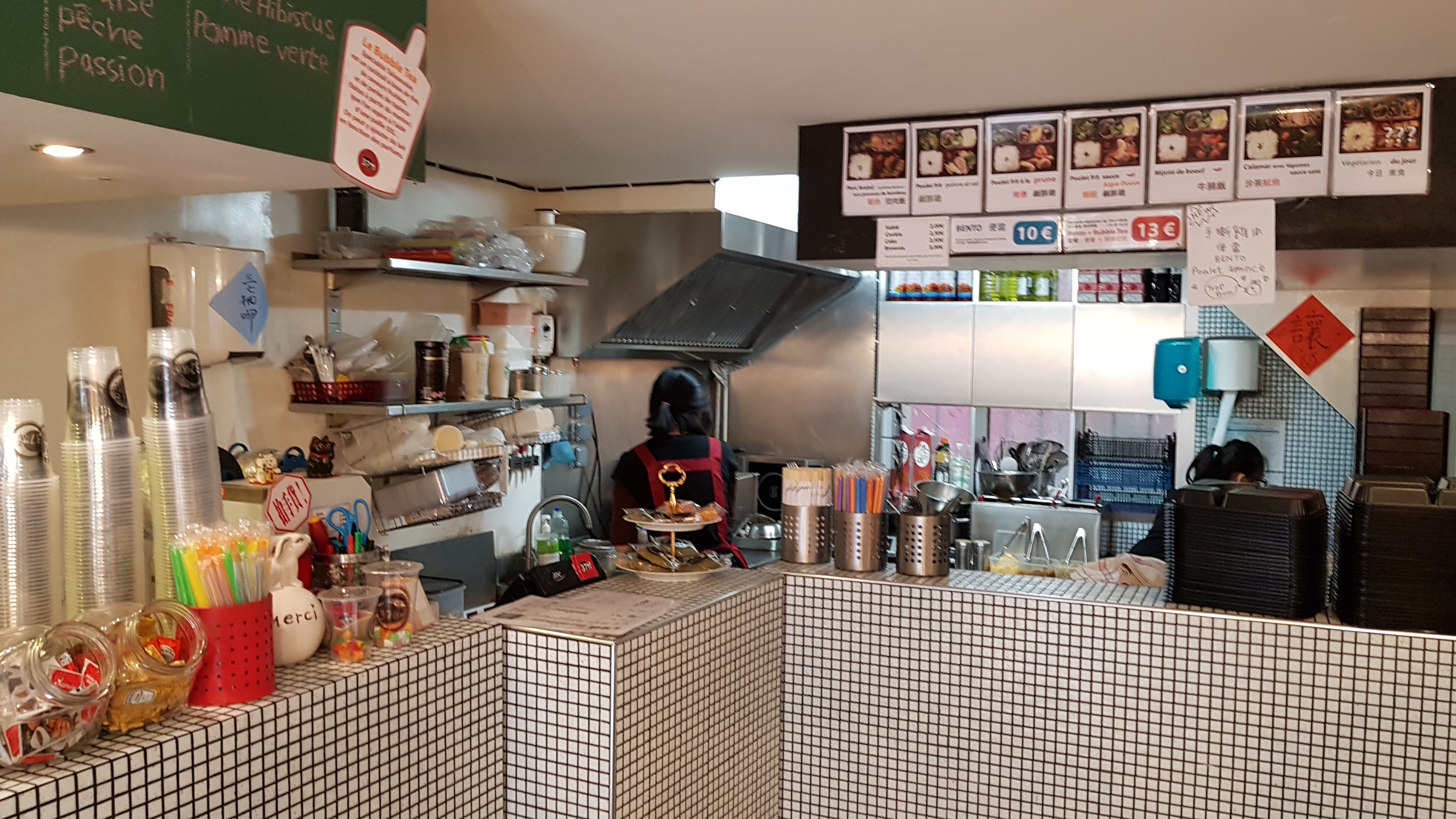 Les bentos sont tops (grosse préférence pour le poulet prune). gros choix de Bubble tea. la formule à 13€ reste surtout dans le quartier.