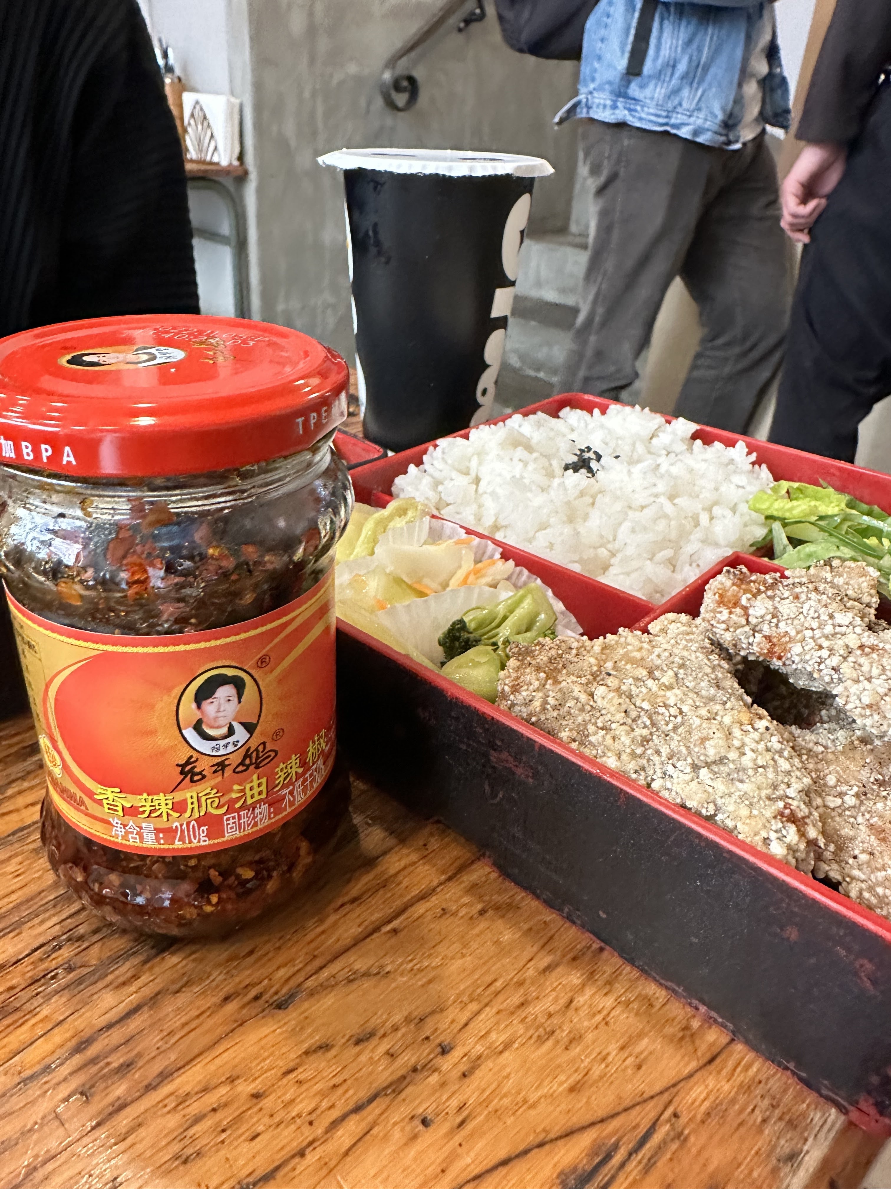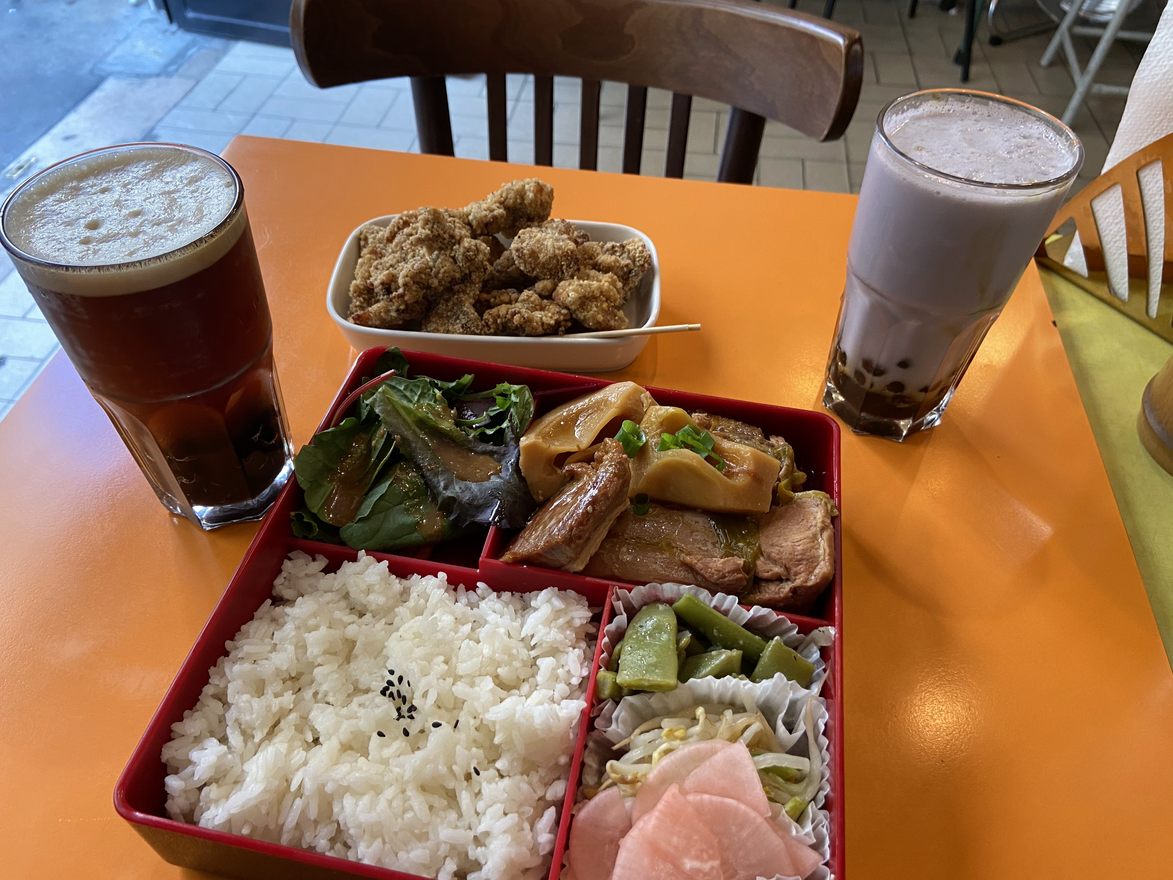Le cadre étroit et façon ancienne cantine est assez amusant, le personnel est très serviable. Mais le manger! Top, pris à emporter, par ce jour de pluie, 10-15min après la panure du poulet et du poisson était toujours super croustillante. Le bubble tea à l'osmanthe impeccablement sucré (pas TROP comme ailleurs) par contre pas beaucoup de perle de tapioca. Un soupçon de poudre de prune en plus sur le poulet et ce serait parfait!