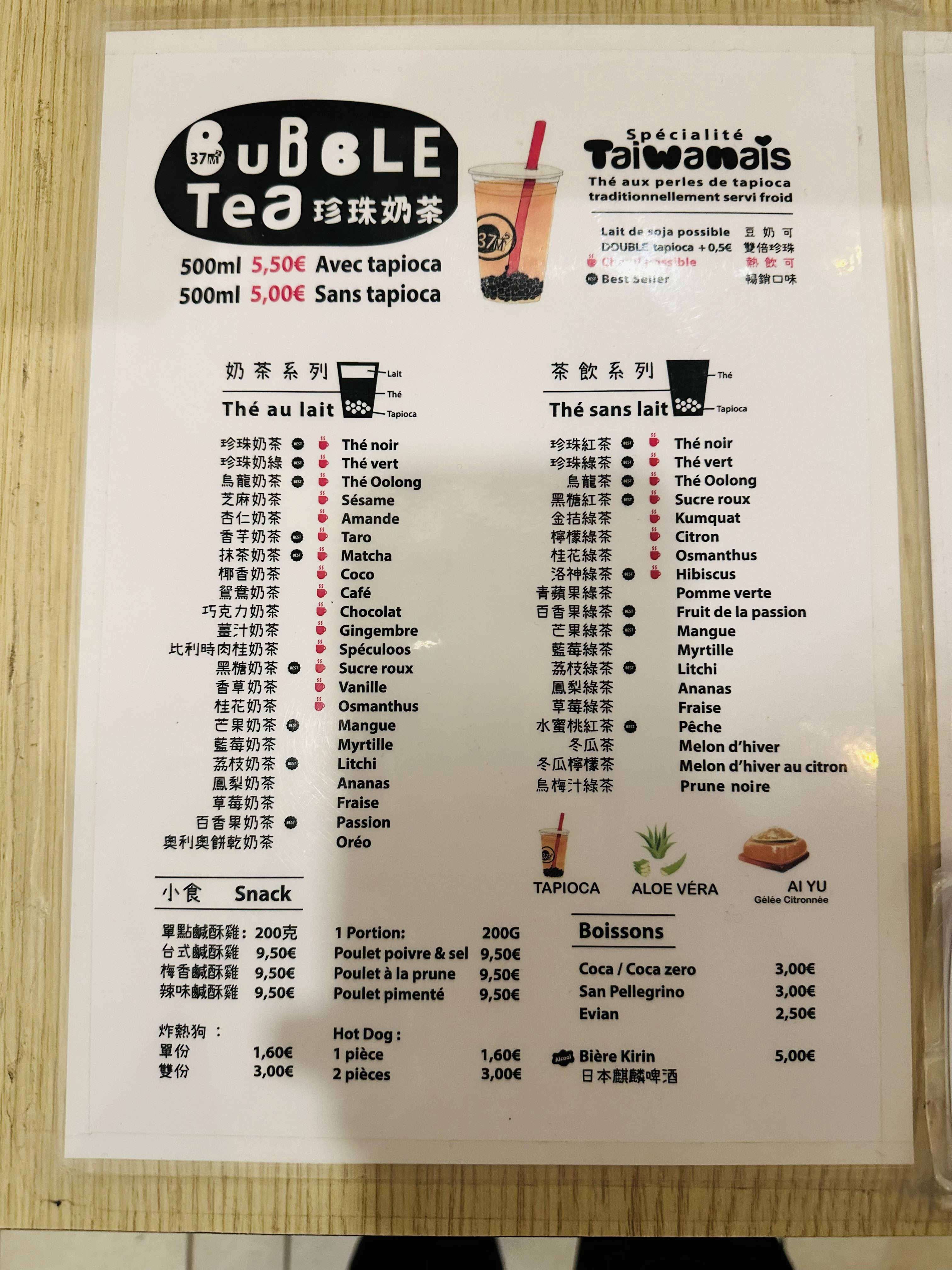 J'adore le bubble tea café froid avec perle de tapioca avec sucre 30%, c'est super bon et même leurs plats sont pas mal, j'aime y aller en été ou au printemps c'est super agréable, je vous conseille vivement de le tester, c'est petit mais agréable.