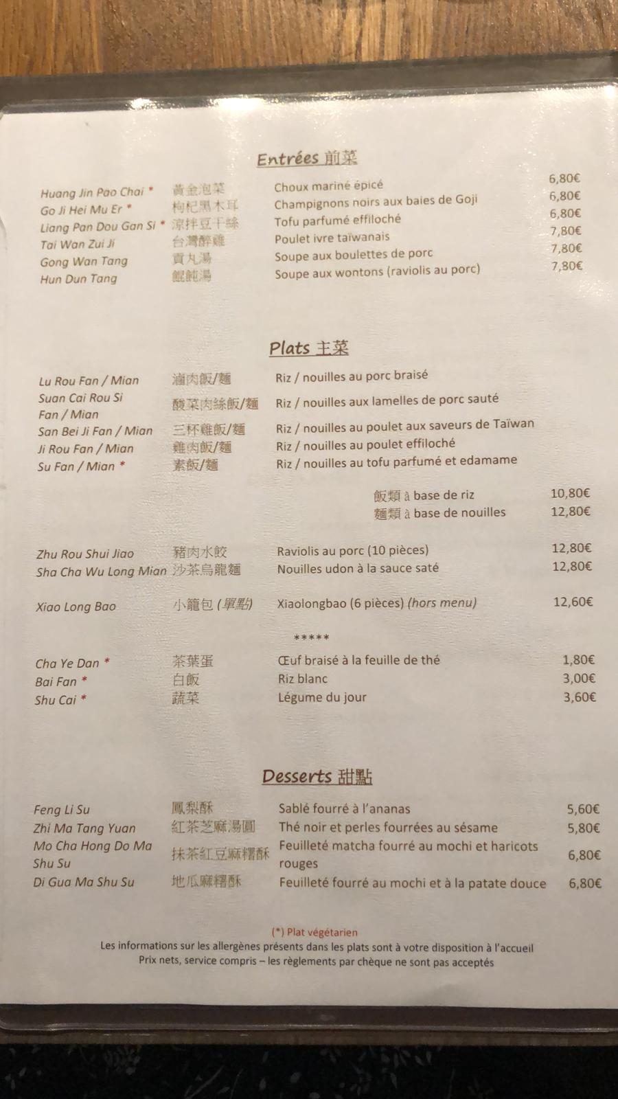Expérience très mitigée. Au niveau du restau : le lieu est extrêmement petit et étroit, donc ne pas venir très nombreux (max 6 personnes). Concernant la déco, sobre voire inexistant. Pour le service : il n'y avait qu'une serveuse qui faisait le service et l'encaissement. Personne sympathique et communicante. Pour le plat : mangeant pour la première fois dans un restaurant Taiwanais, j'avais un peu d'attente sur sa gastronomie : en terme de quantité, personnellement il n'y en avait pas beaucoup, j'ai pris des nouilles qui étaient visuellement plutôt collantes et empaquetées, mais en goût pas trop mal. J'ai pris un oeuf braisé car l'intitulé du plat à retenu mon attention mais finalement rien d'extraordinaire (c'est juste un oeuf dur marron). En dessert, une petite patate douce enrobée d'une sorte de petite couche de pate feuilletée : ce n'a pas comblé (de manière générale les desserts asiatiques ne sont pas tops). Vers la fin, on a dû accélérer car il y avait un second service. Prix total : 25 euros Détail : menu classique (plat + dessert) = 20 euros Plat supplément (oeuf braisé) = 3 euros Nouilles = 2 euros (n'étaient pas inclues dans le menu mais considérées comme suppléments) Je trouve que c'est assez cher pour ce que c'est.
