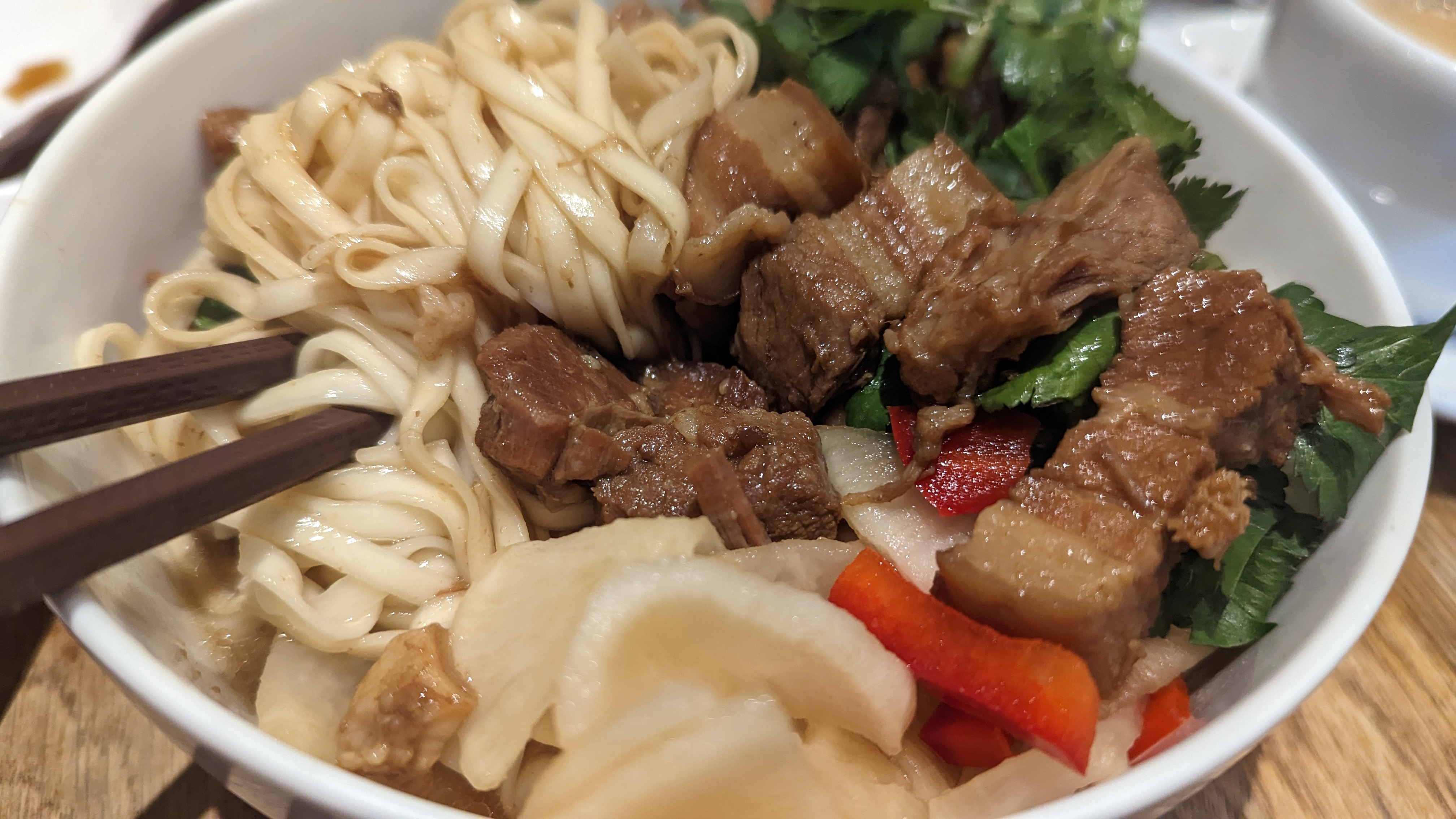 Si vous cher une cuisine familiale Taïwanaise, vous avez trouvé la bonne adresse ! La soupe de wonton était simple et succulente et le porc braisé, avec la sauce piquante maison, délicieux.