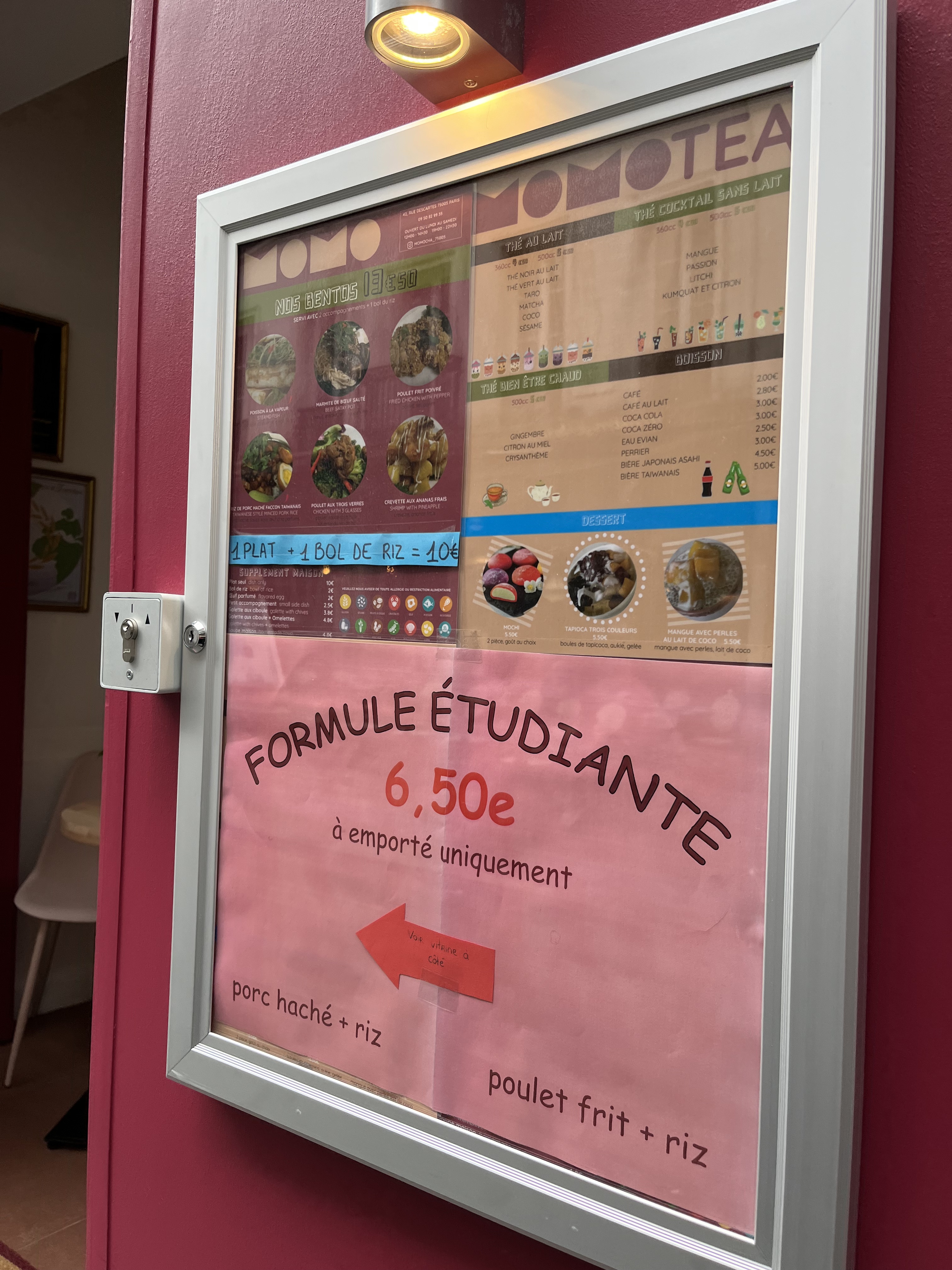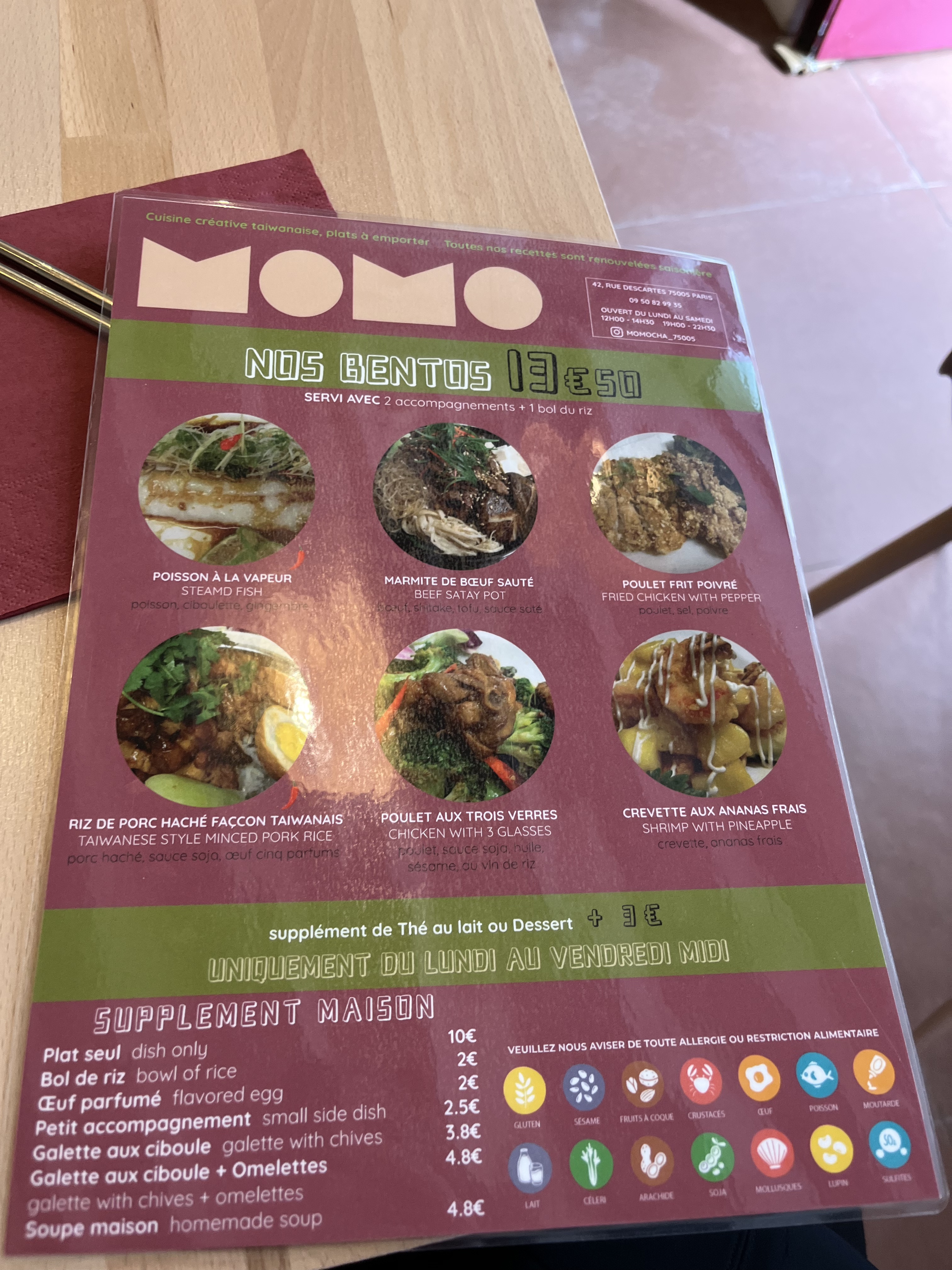 Voici toutes les informations sur le Restaurant taïwanais Momo qui ce trouve au 42 Rue Descartes, 75005 Paris (75). Sur cette fiche vous trouverez les photos, l'adresse, les horaires d'ouverture, le numero de téléphone et les avis clients.Vous pouvez églement rédiger un avis si vous le souhaitez en bas de page.