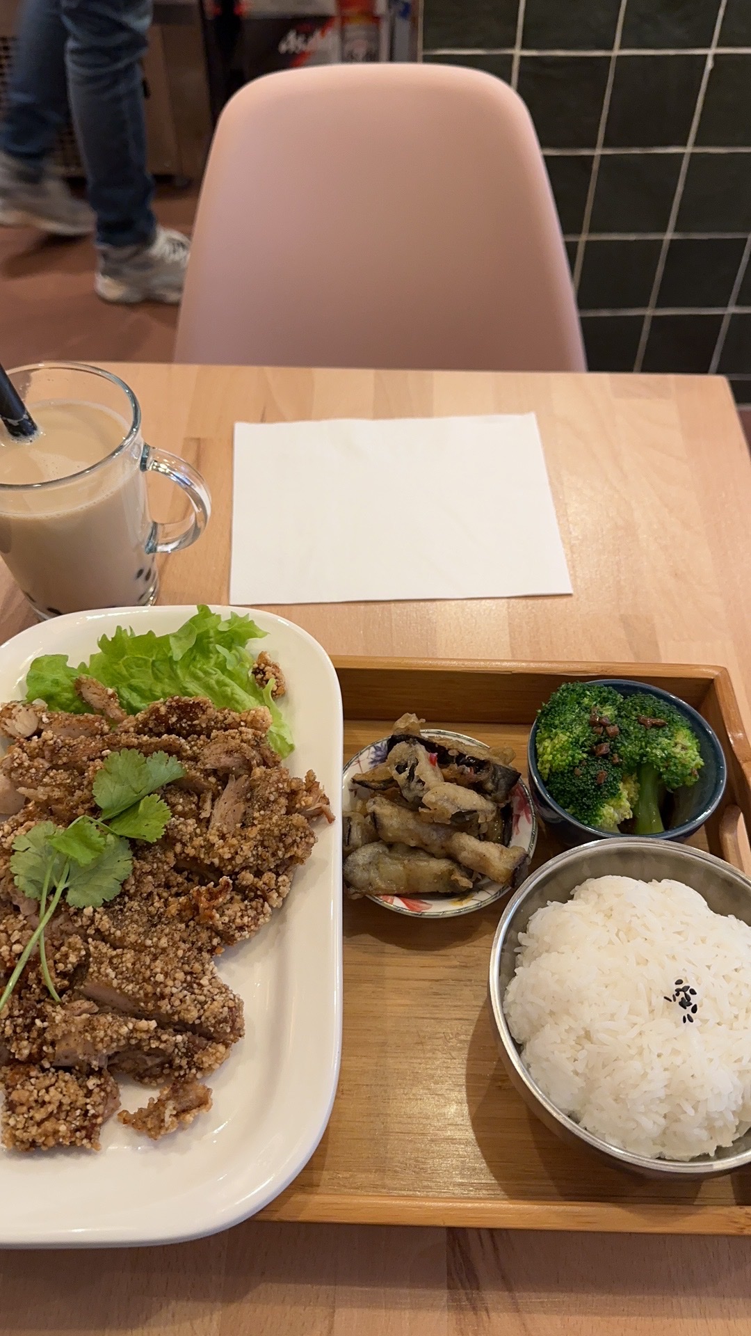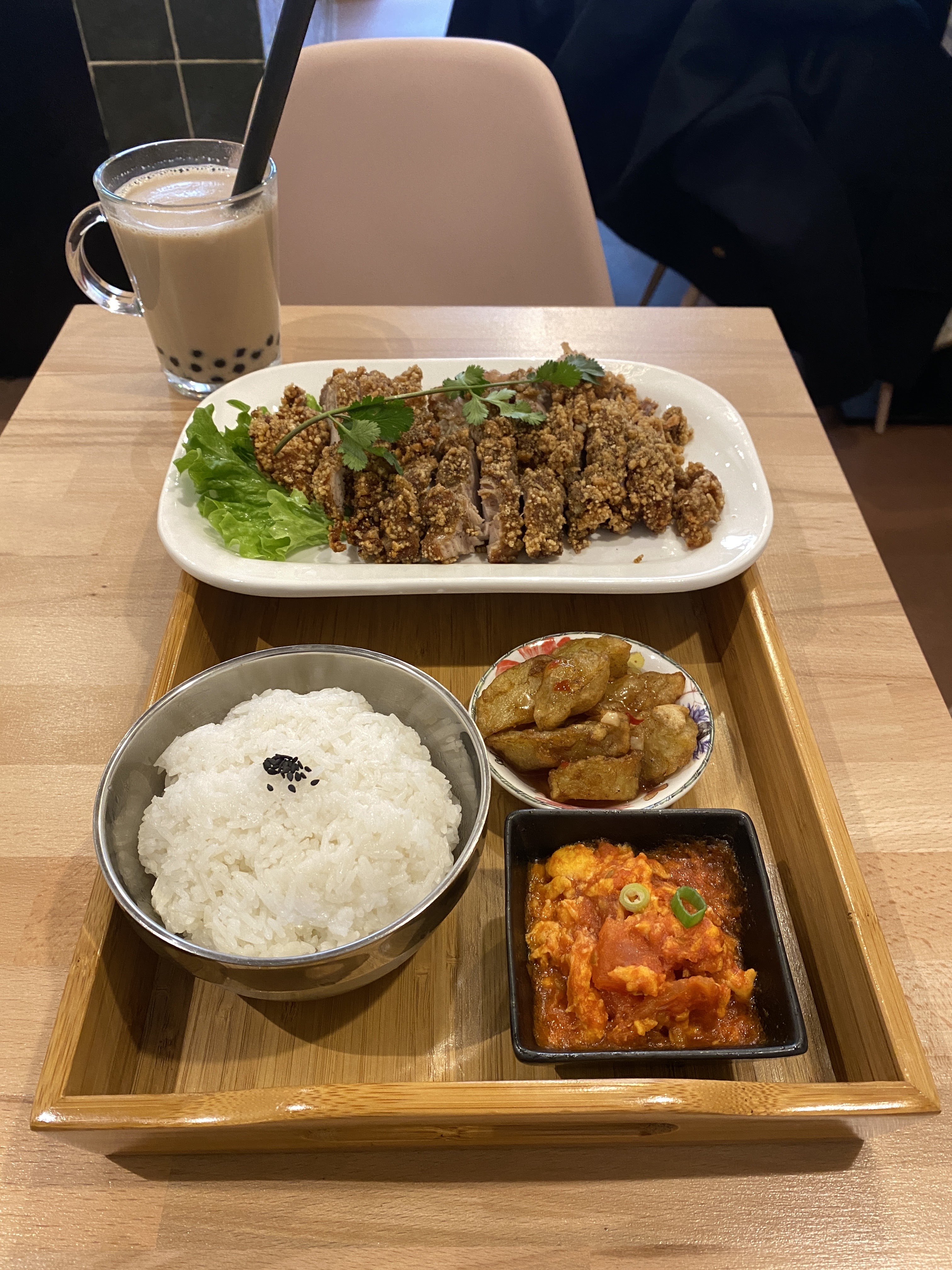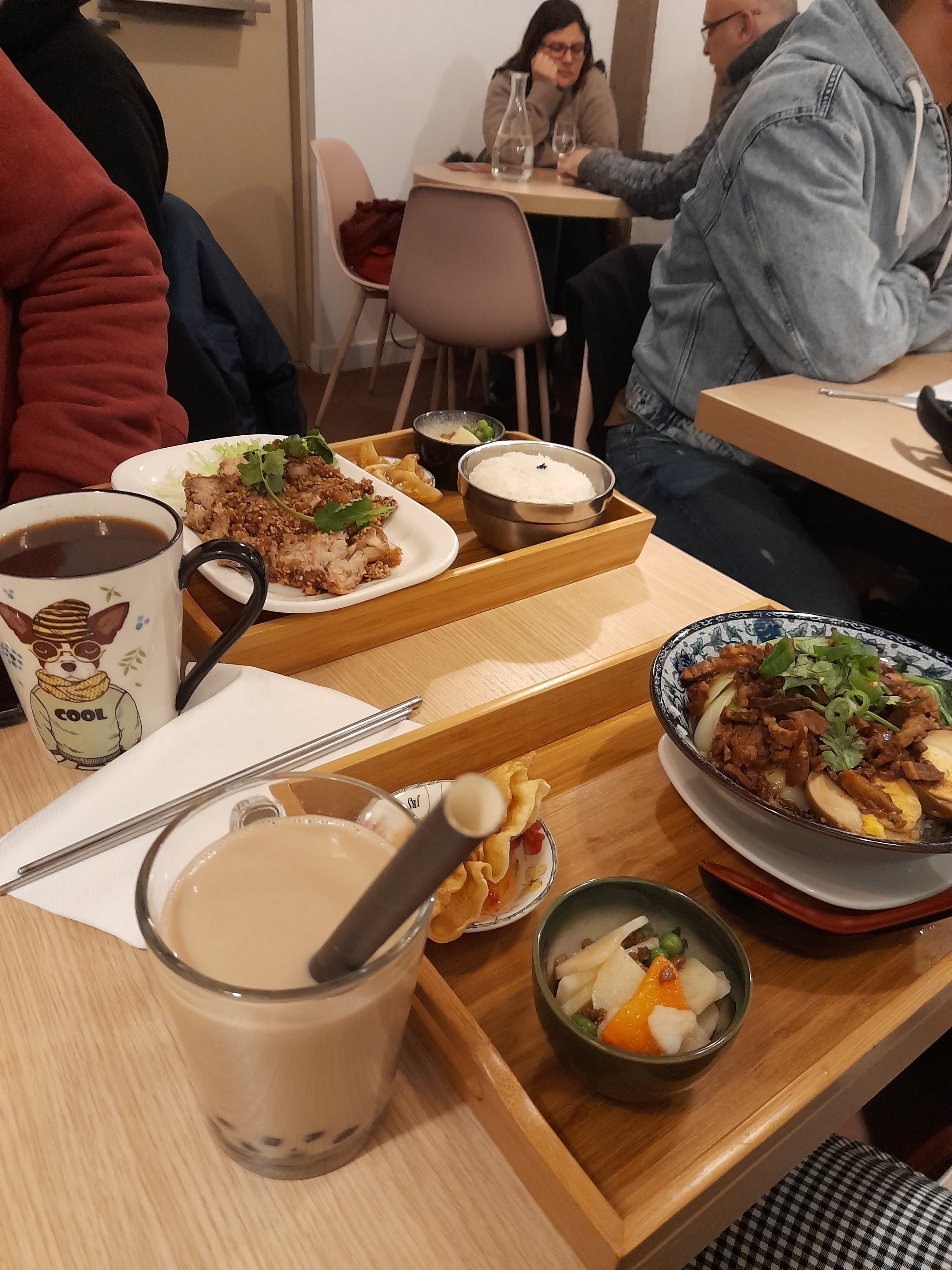J'ai essayé le menu poulet (jipai) et c'est trop bon! Même les petites garnitures étaient soigneusement préparées. Leur bubble tea est authentique taiwanais, j'adore, rien a voir avec les a la mode bubble tea store a Paris. Il y a peut-être bon lait en france mais pas de bon thé. Il faut woolong thé taiwanais pour le faire correctement. Bref, très bon restaurant.