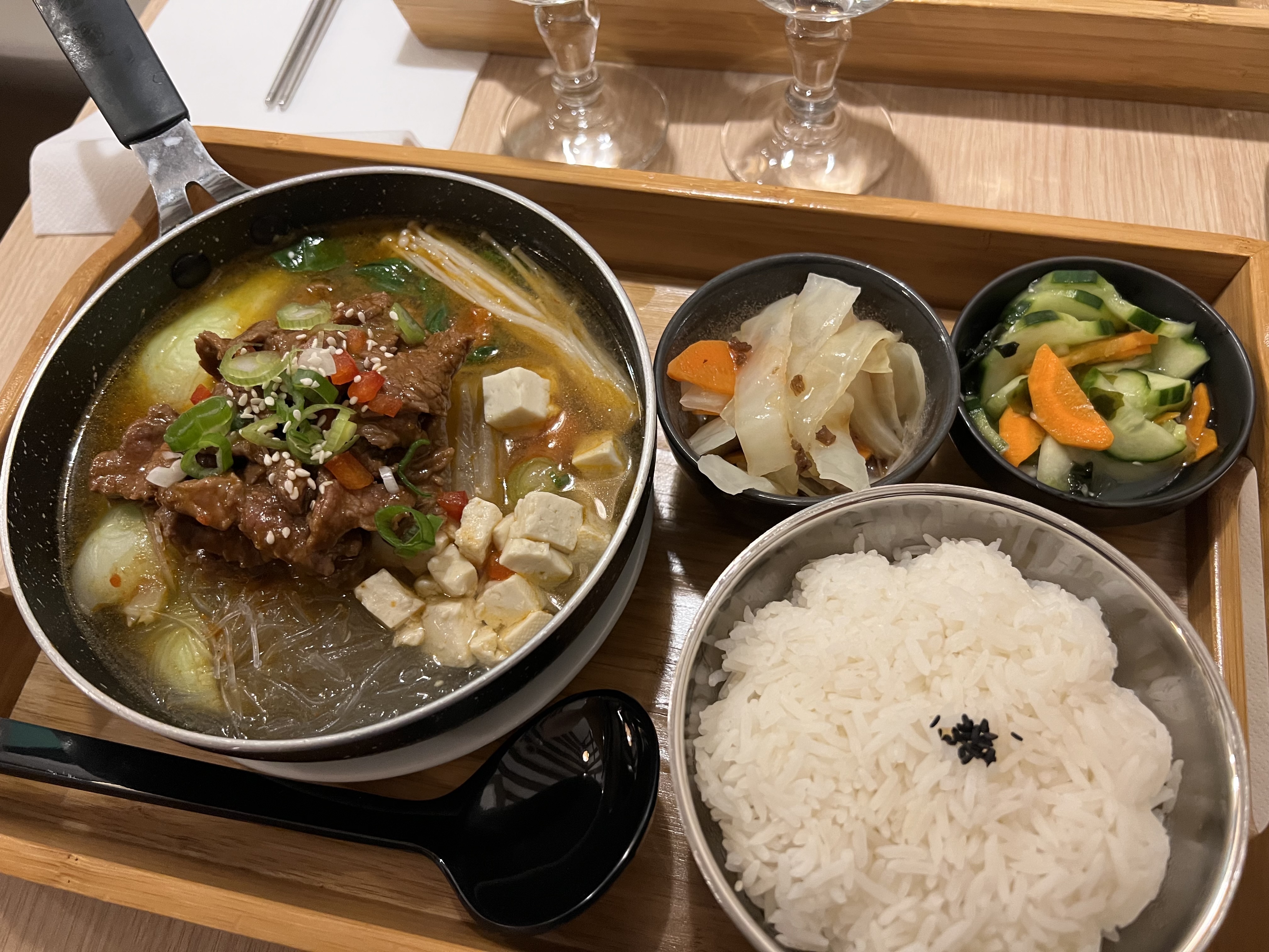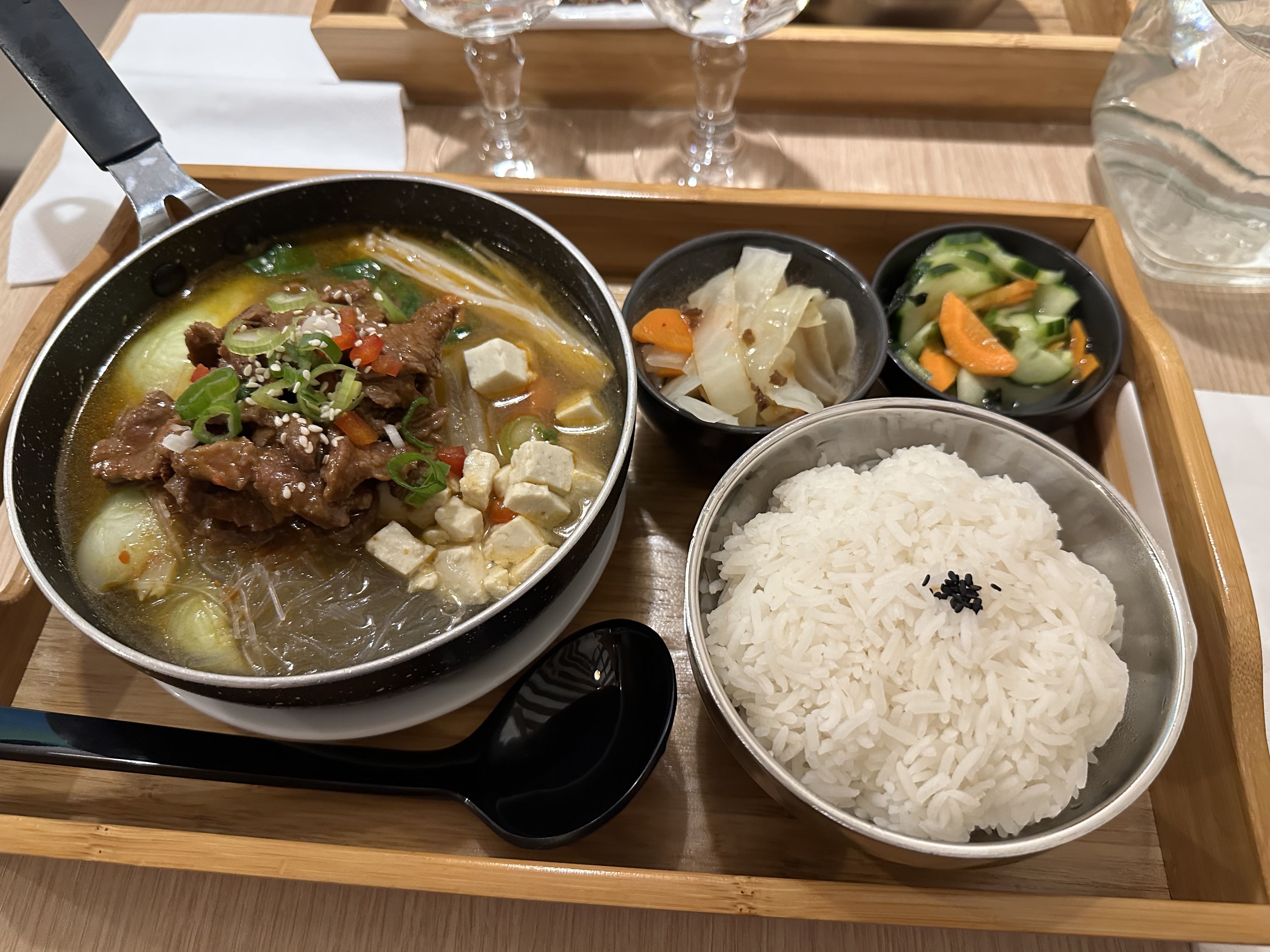 Excellent service et bonne bouffe! En particulier, la soupe au bœuf était délicieuse. Prix raisonnable : au dîner, un plat + riz + 2 accompagnements à 13,50 €