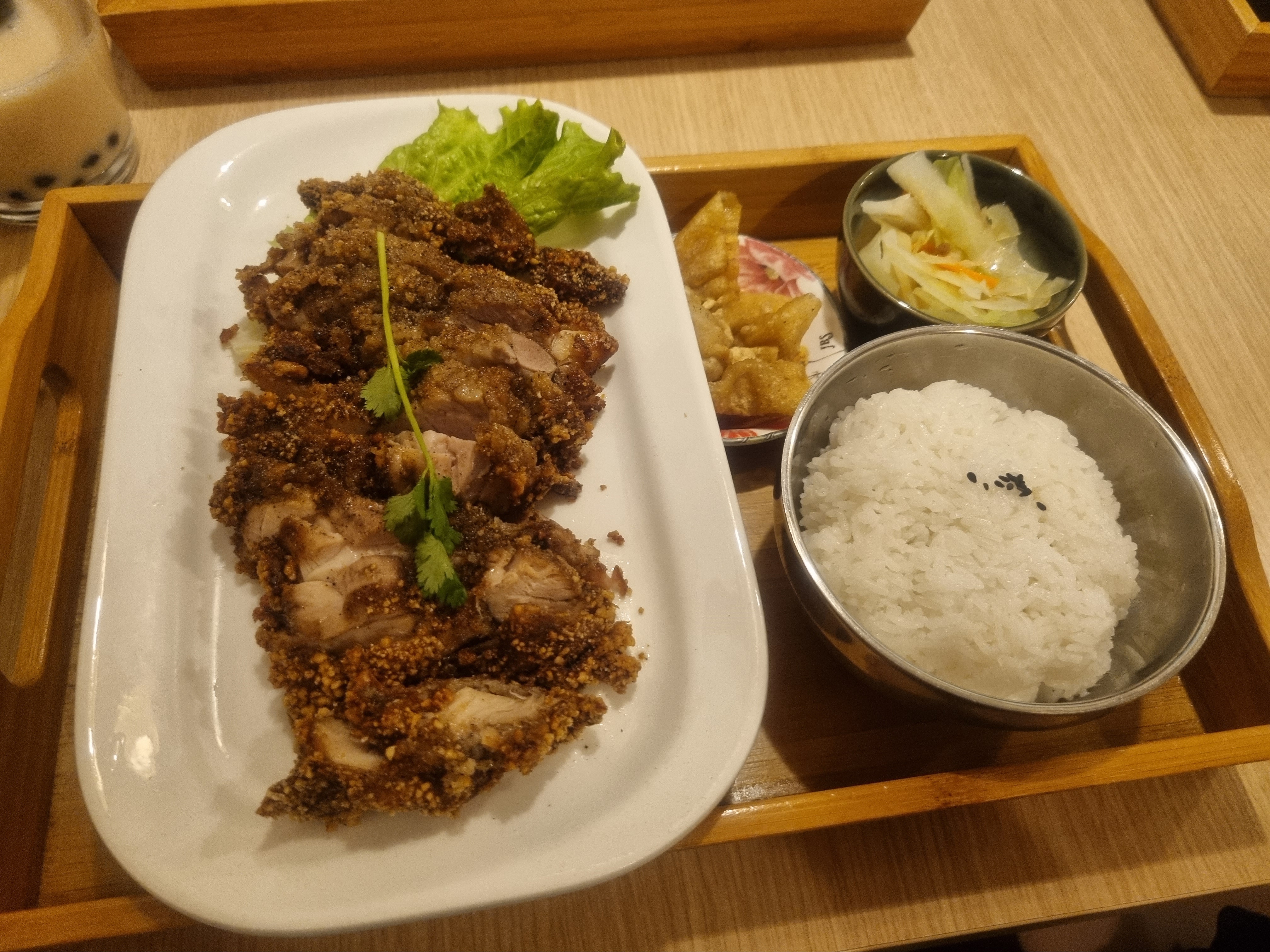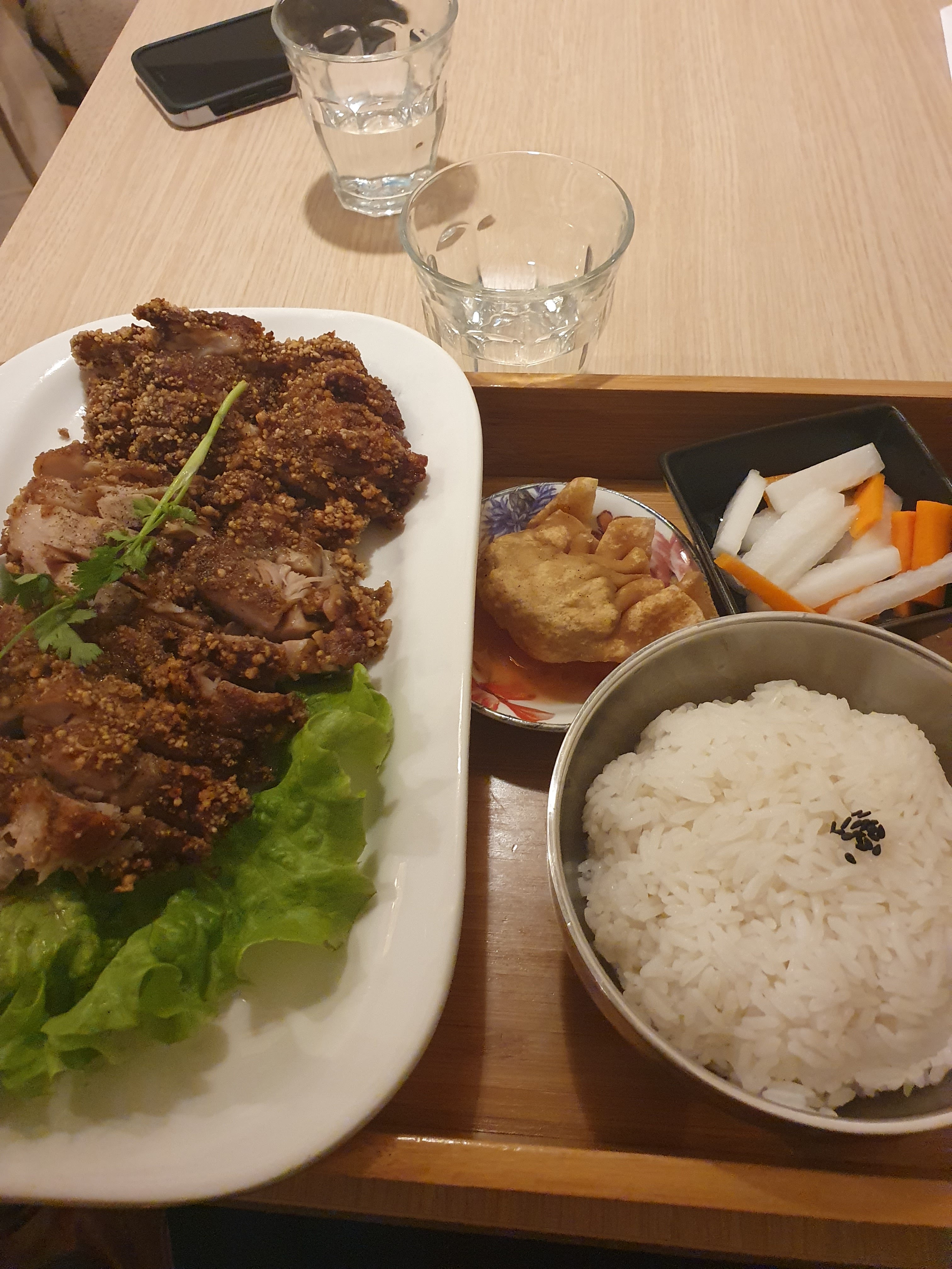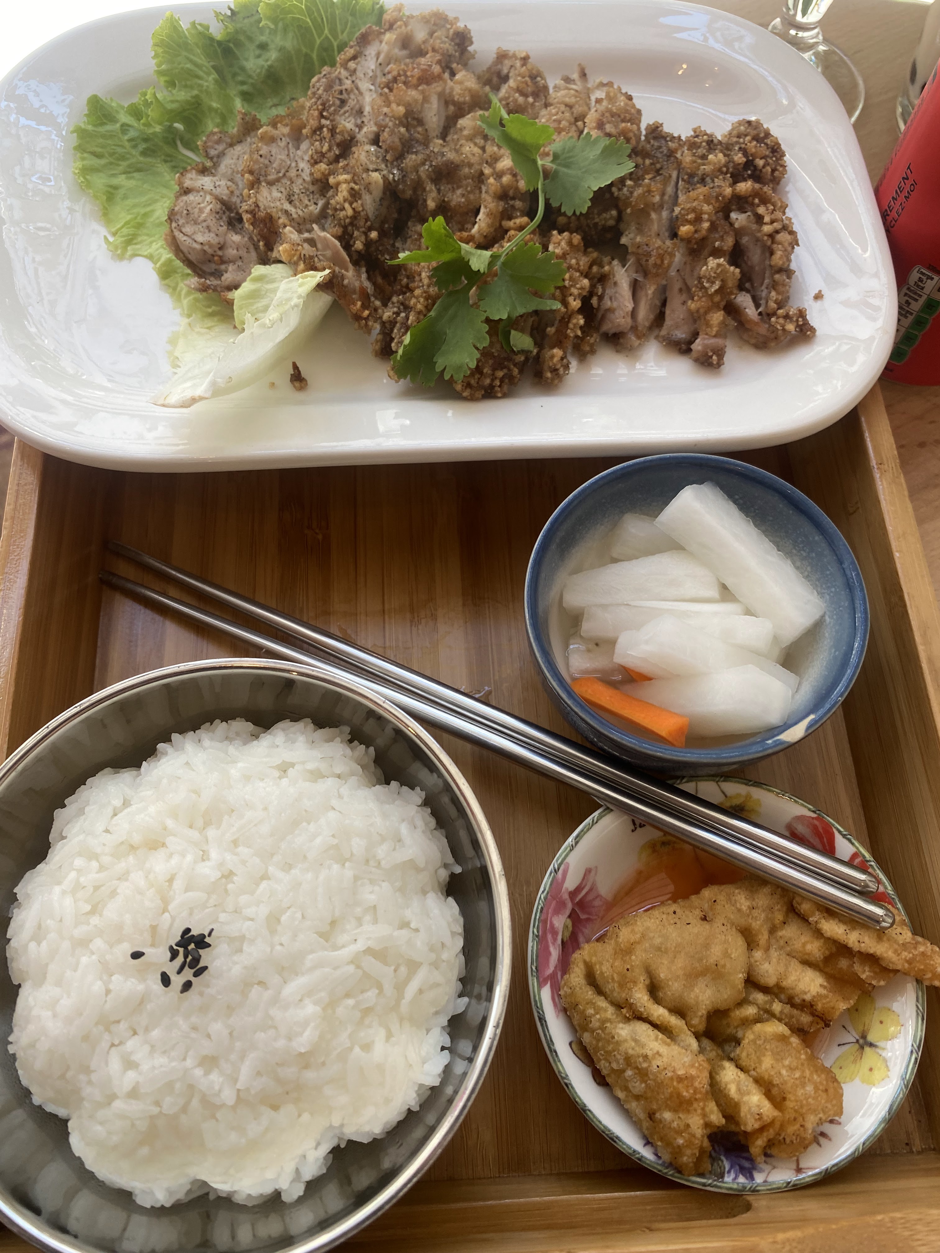 Nous avons été super bien accueillies et nous avons adoré notre plat. Le poulet croustillant était très bon et généreux. Le petit plateau est très bien pensé et suffit à bien remplir un estomac ! Nous avons pris un bubble tea pour finir qui était très bon, et pas trop sucré. Le service était adorable et nous avons convenu que nous reviendrons ! Merci pour le service ❤️
