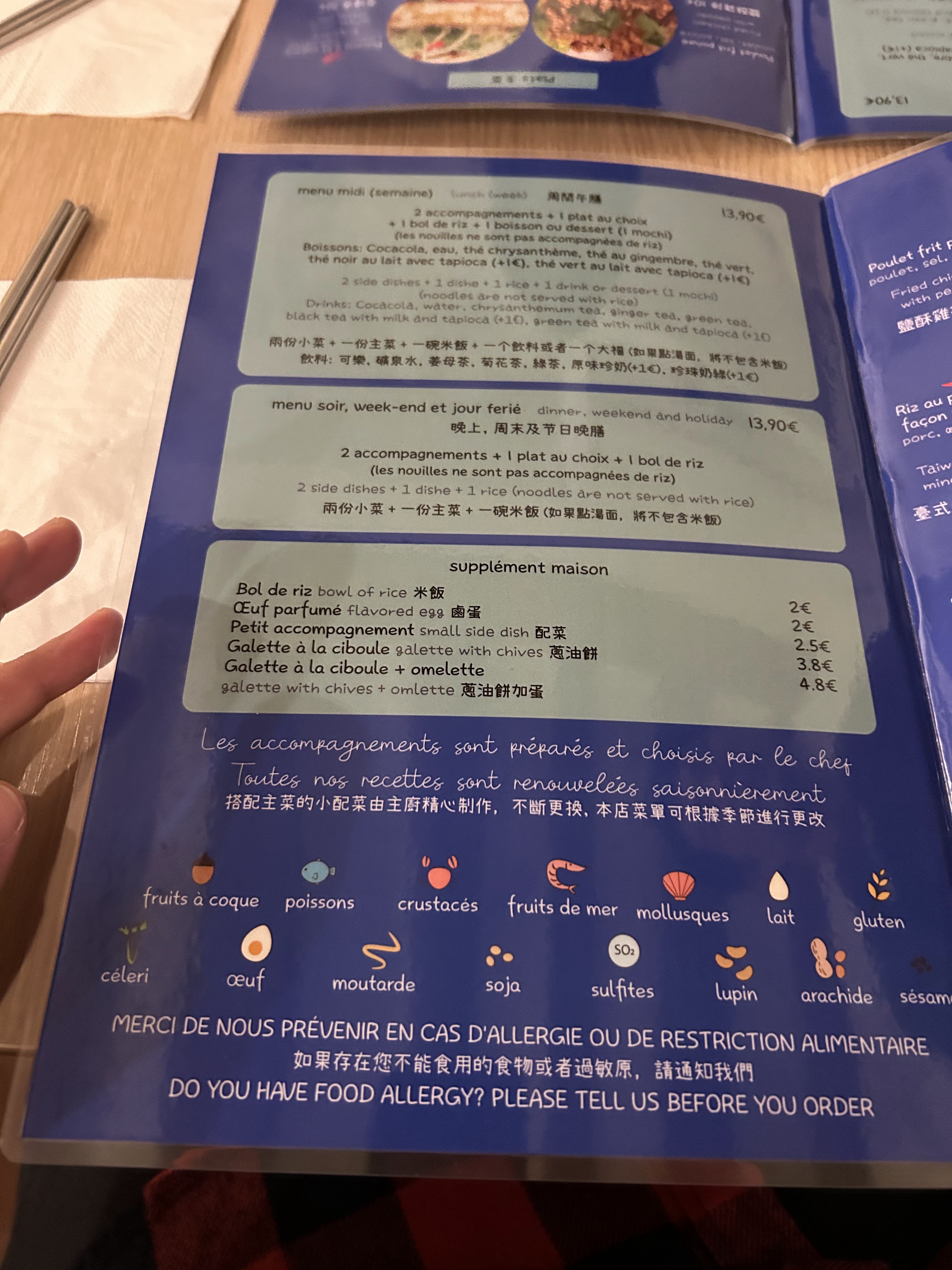 DÉLICIEUX ! J’ai trouvé ce restaurant par hasard avec des amis et je peux vous assurer que je vais y retourner de nombreuses fois, je ne m’y connais pas en cuisine taïwanaise mais c’était d’un délice. Qui plus est, le principe du menu avec choix du plat et les 2 accompagnements en surprise du chef est une idée très sympathique qui fait plaisir. Le personnel est très gentil et agréable, à ne surtout pas rater !