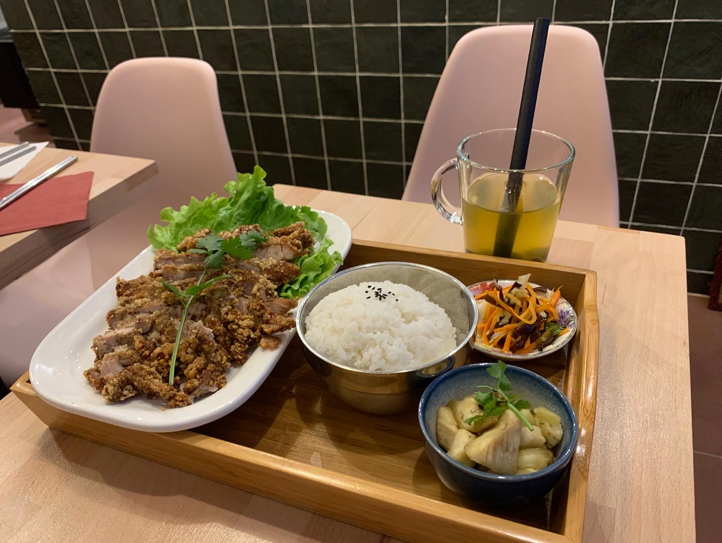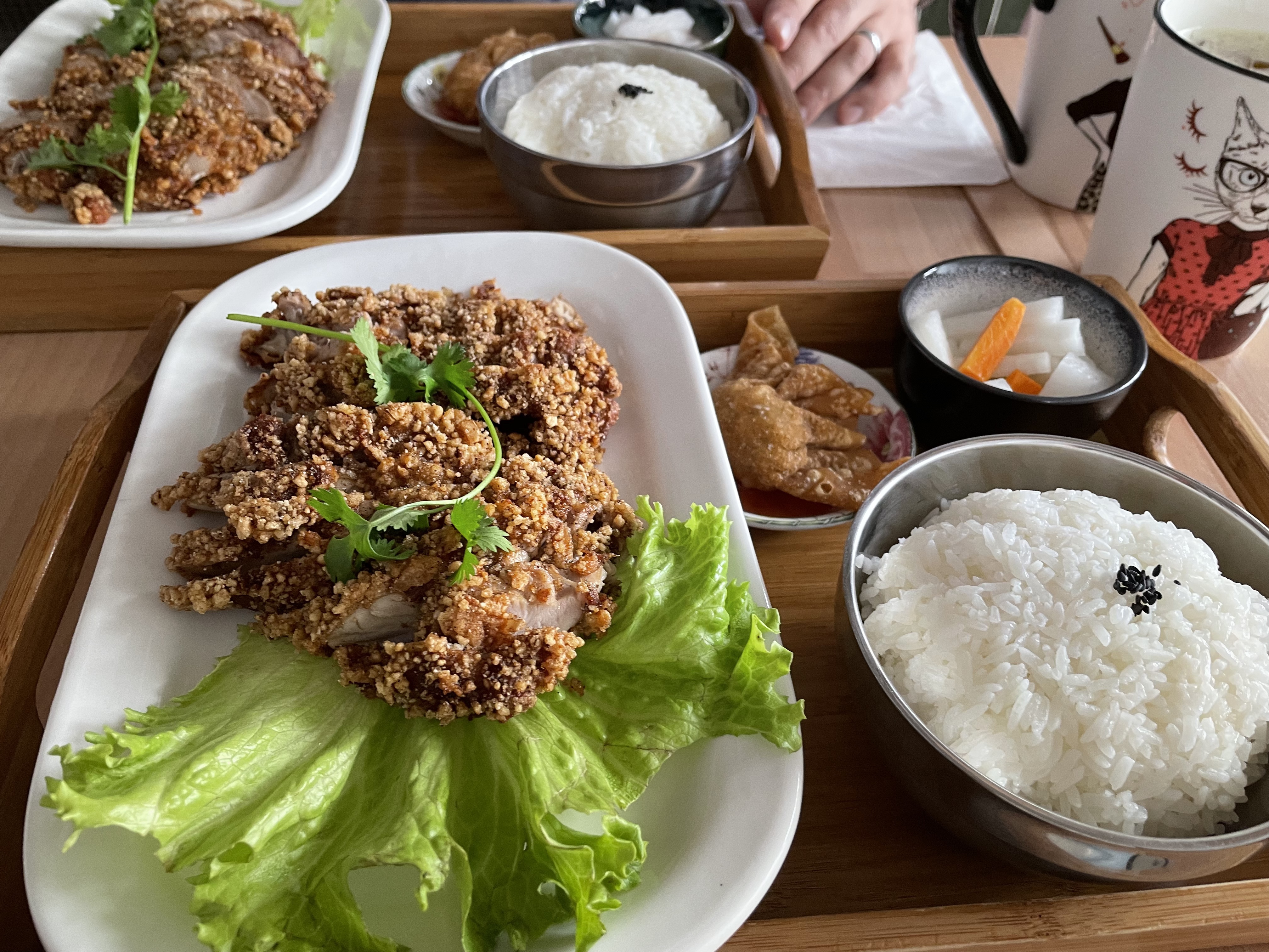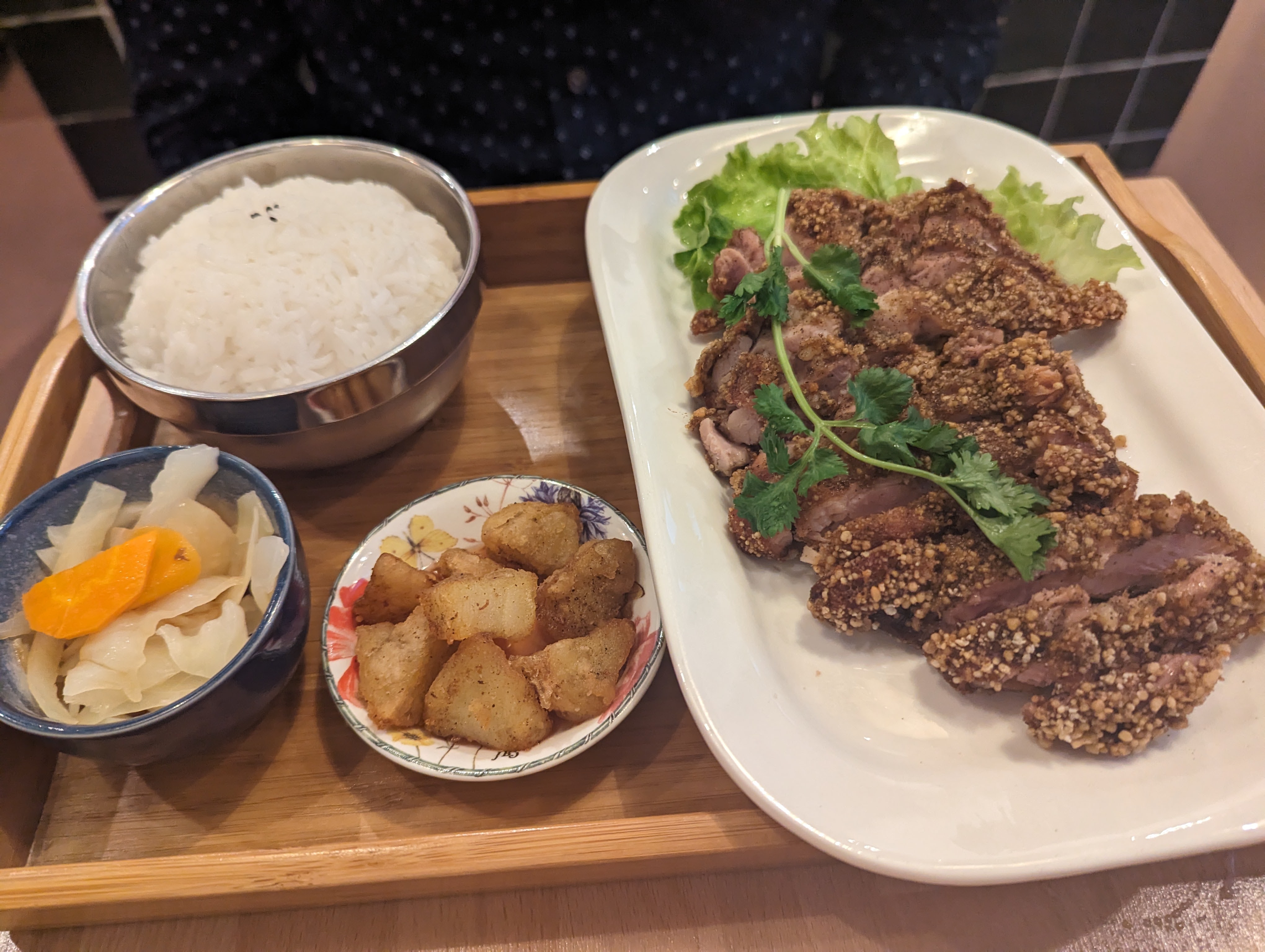 Petit restaurant avec un cadre sympathique qui propose de la cuisine taïwanaise. J’ai adoré le poulet frit poivré dont la panure est croustillant et l’intérieur tendre. Et la cuisson du riz? Elle était parfaite pour moi! Elle n’y trop cuit et pas dur non plus, juste ce qu’il faut La gérante est souriante et aimable