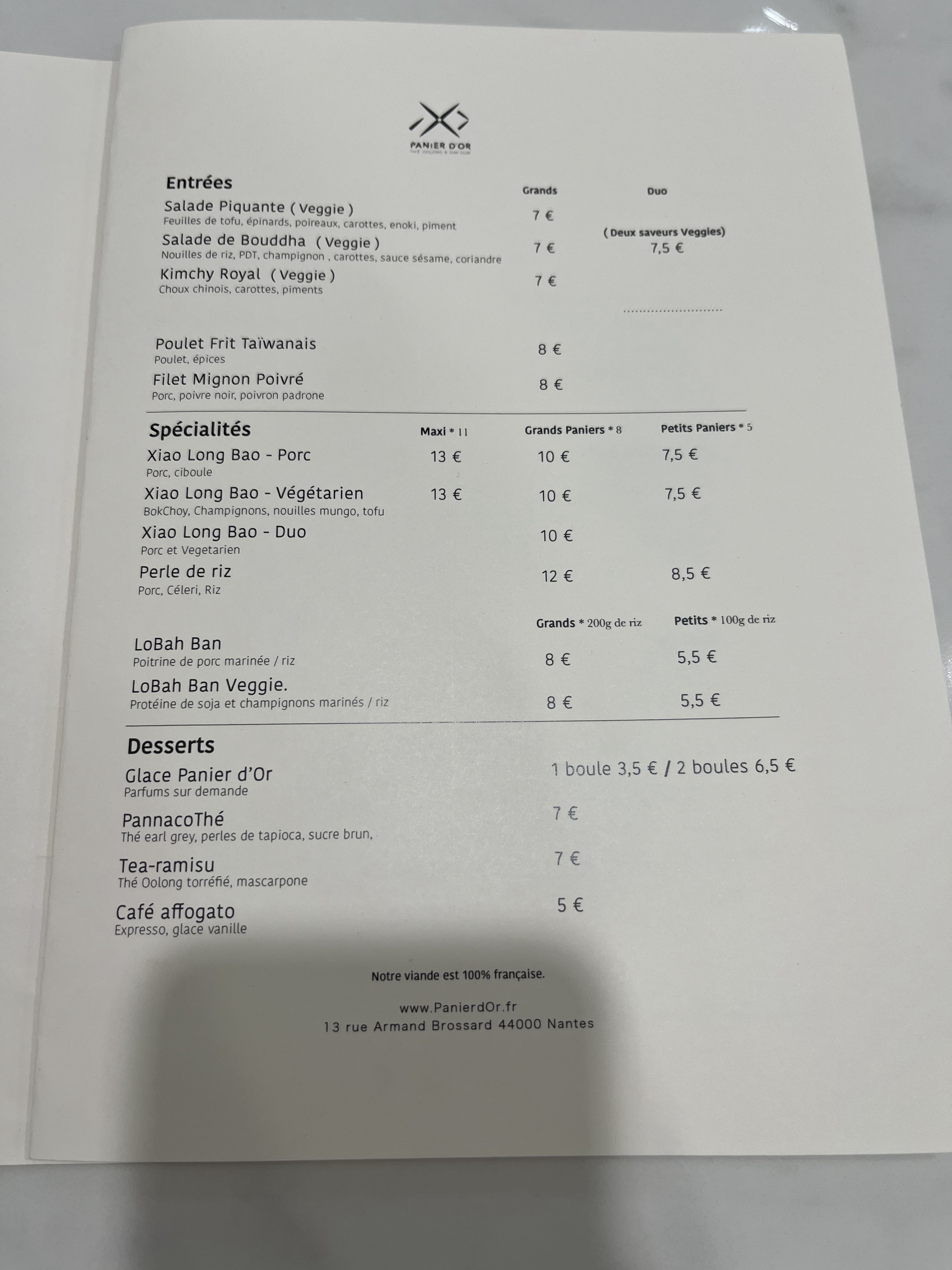 Panier d'Or mérite ses 5 étoiles ! On y est très bien accueilli, le restaurant est propre et lumineux et on y mange extrêmement bien. Nous nous sommes régalés avec un menu complet composé d'une entrée, de Xiao long lao et d'un dessert consistant en un tiramisu revisité avec du thé oolong : une dinguerie, pas d'autre mot. Adresse idéale pour végétariens. Merci pour ce moment, nous reviendrons sans aucune hésitation lors de notre prochaine visite nantaise... :)